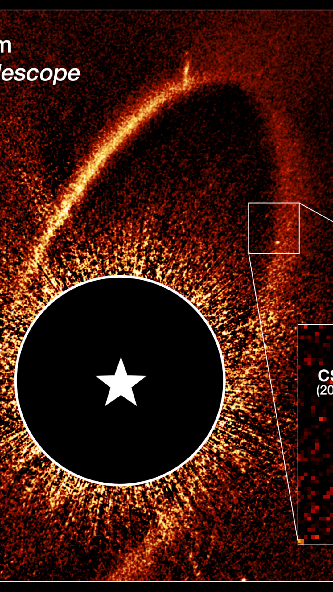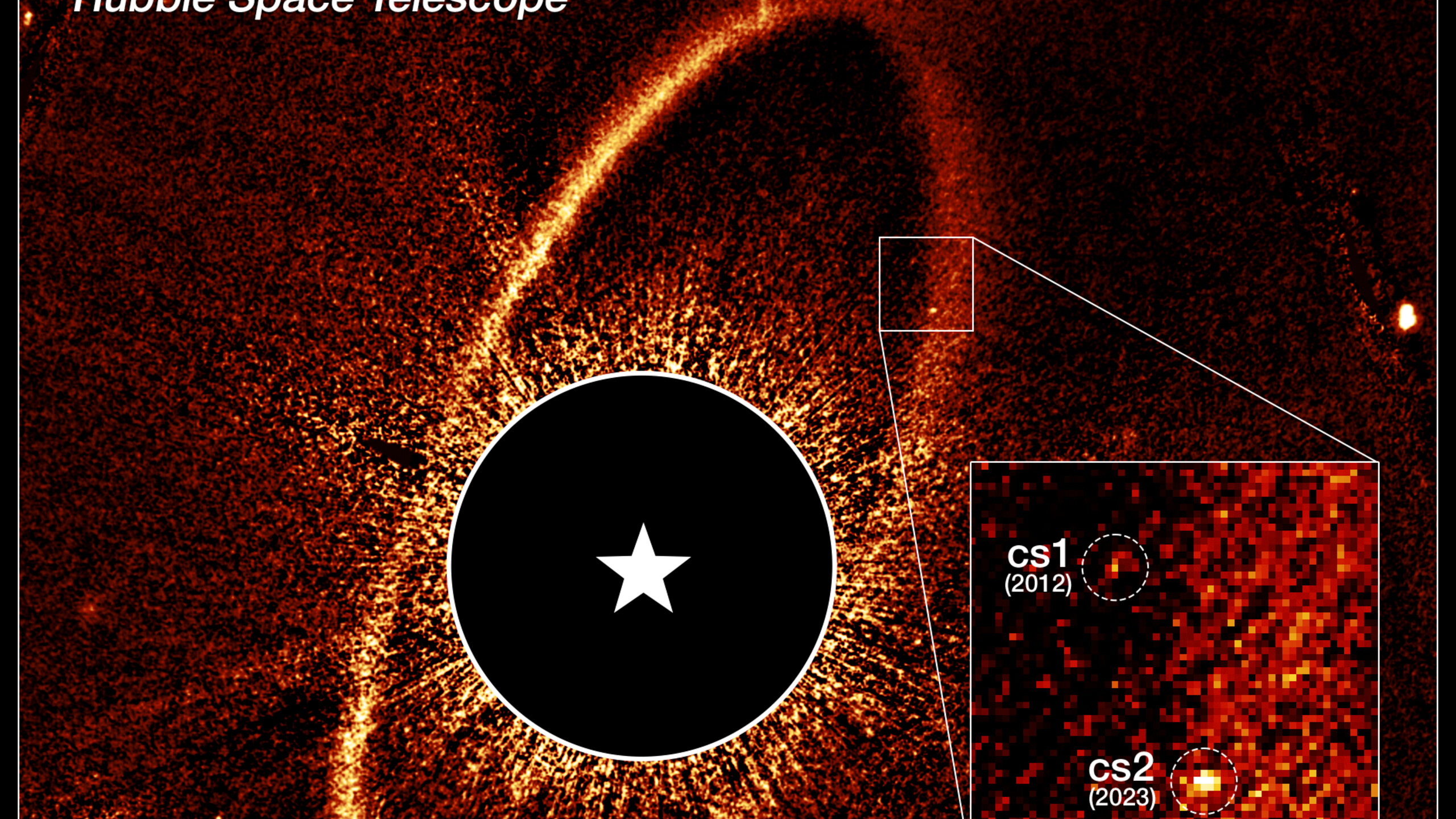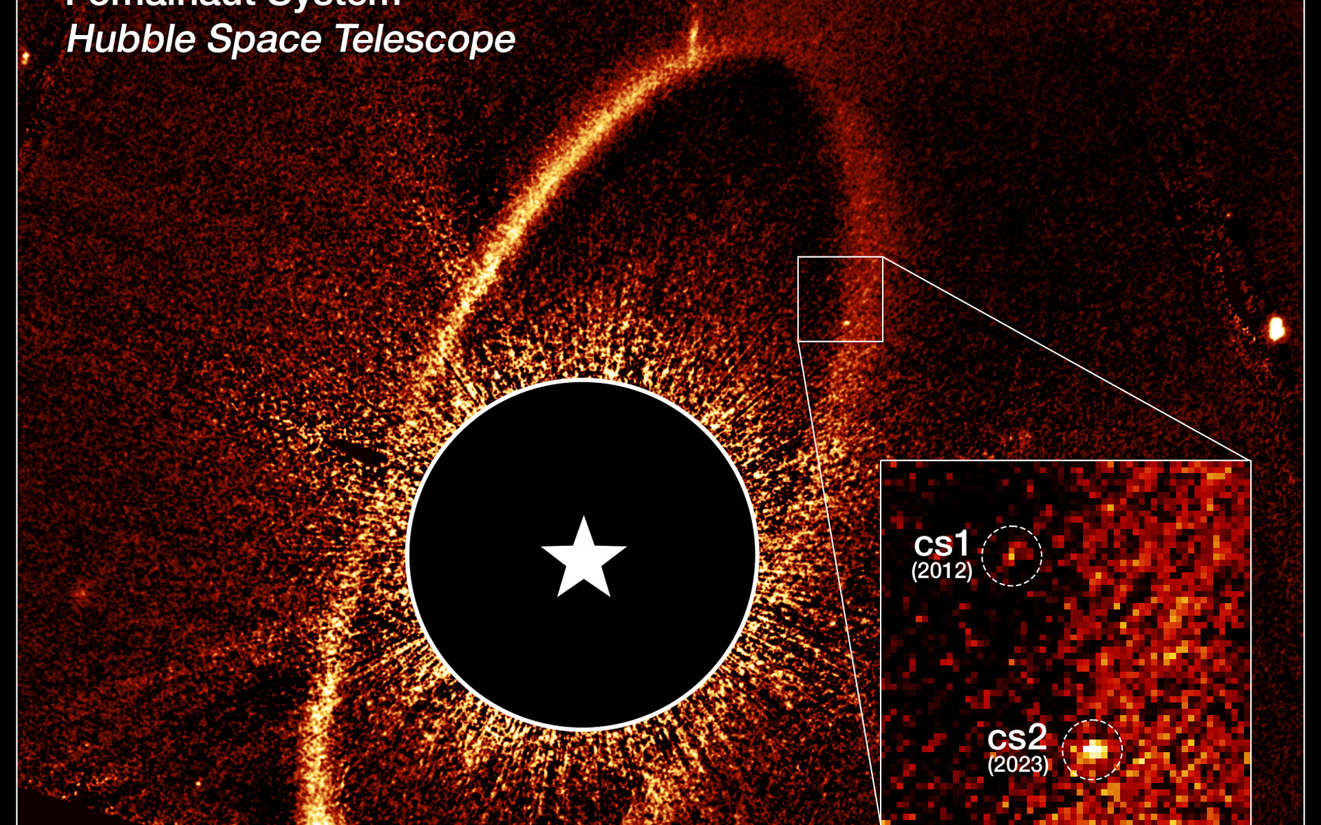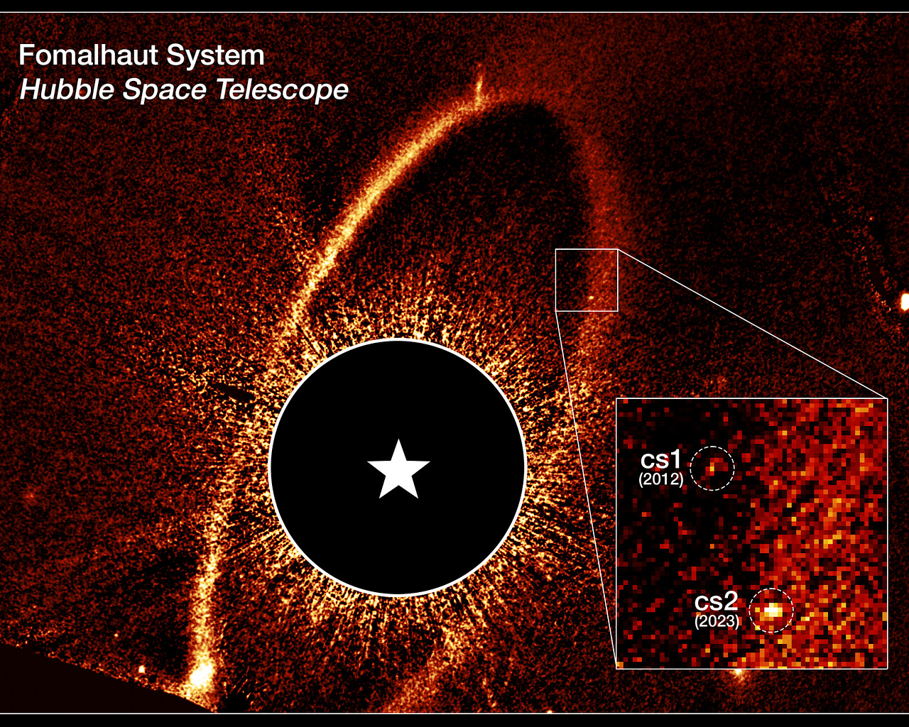 [Image description: Image labeled Fomalhaut system, Hubble Space Telescope. A grainy orange oval ring tilts slightly from upper right to lower left. At two o’clock, a white box outlines the ring’s edge and white lines extend to a larger pullout at lower right. Two spots are labeled cs1 2013 and cs2 2023. Inside the ring is a black circle with a white star symbol in the middle.]