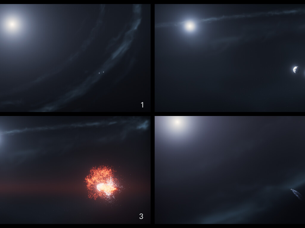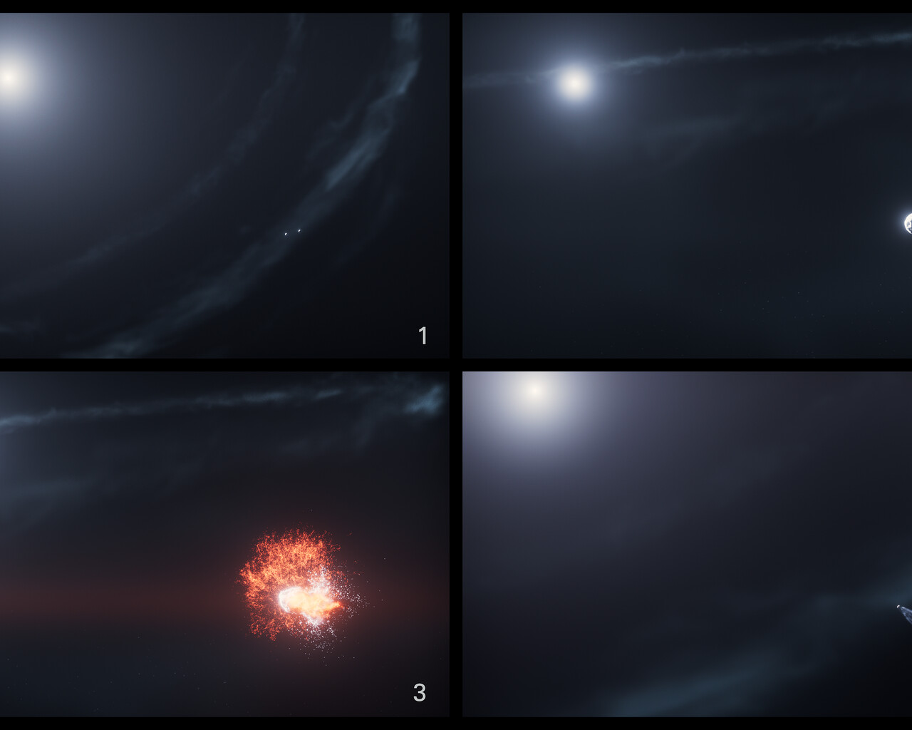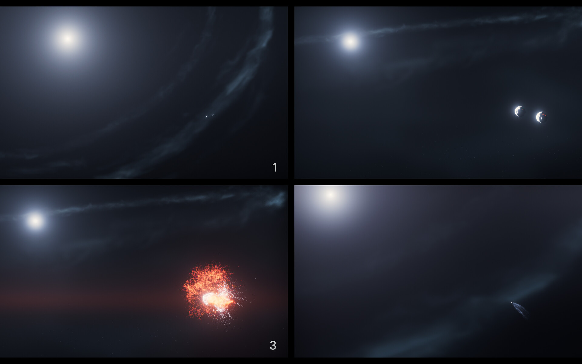 [Image description: This four-panel image labelled 1 to 4 shows the sequence of events leading up to, during, and following the collision of two objects in orbit around a star.]