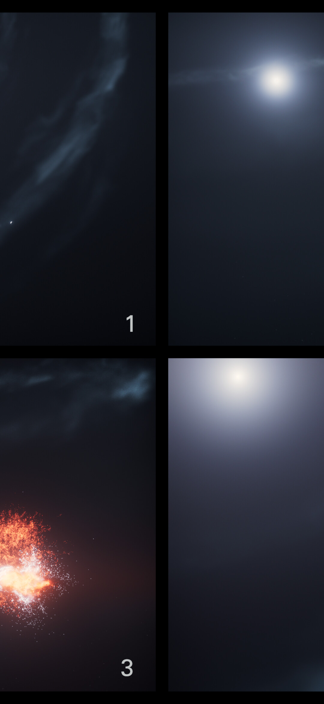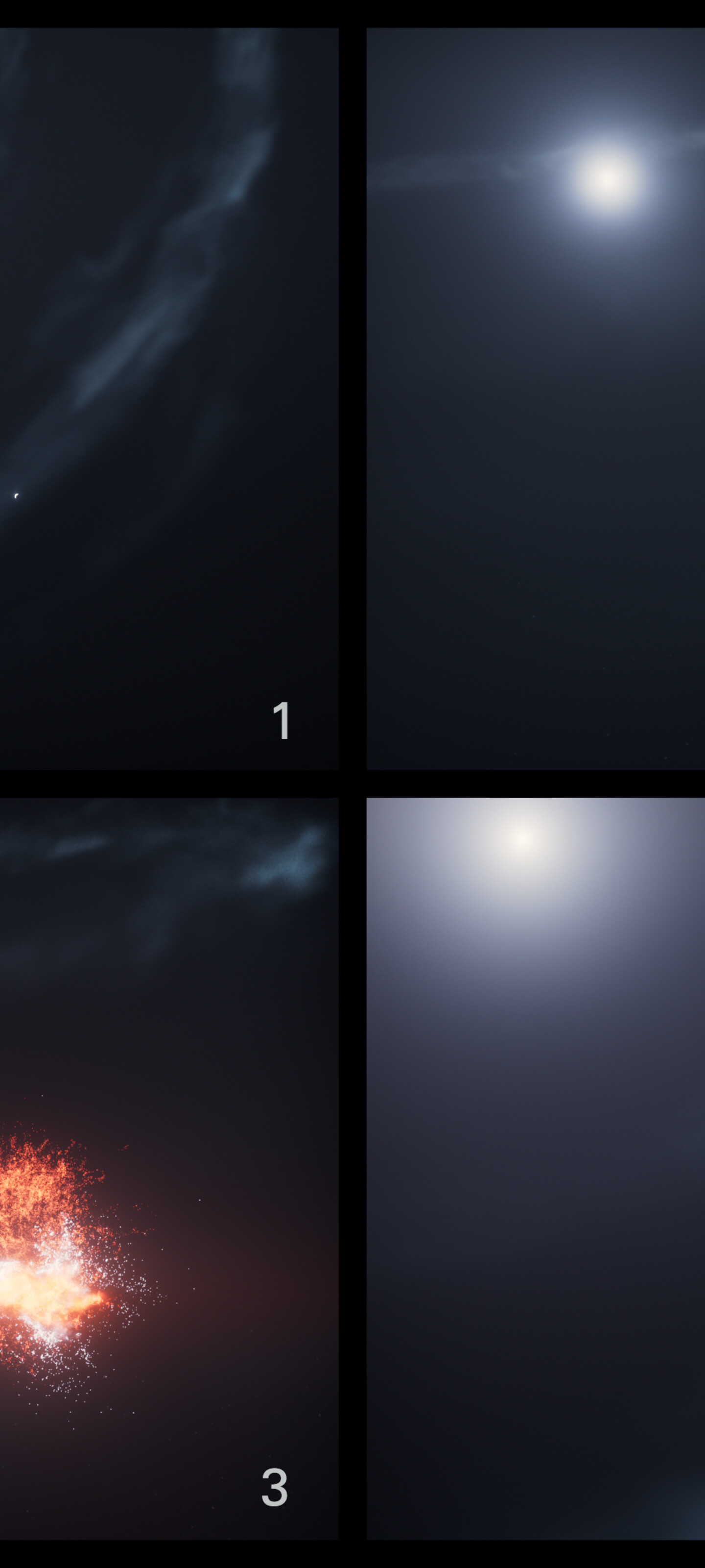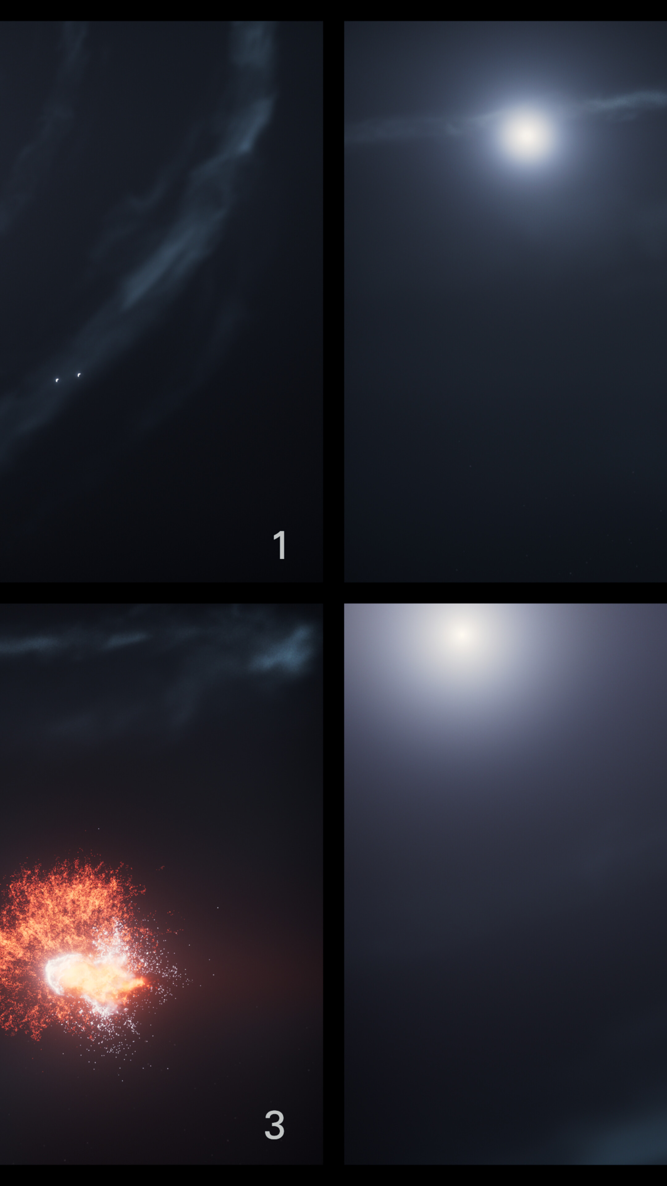 [Image description: This four-panel image labelled 1 to 4 shows the sequence of events leading up to, during, and following the collision of two objects in orbit around a star.]
