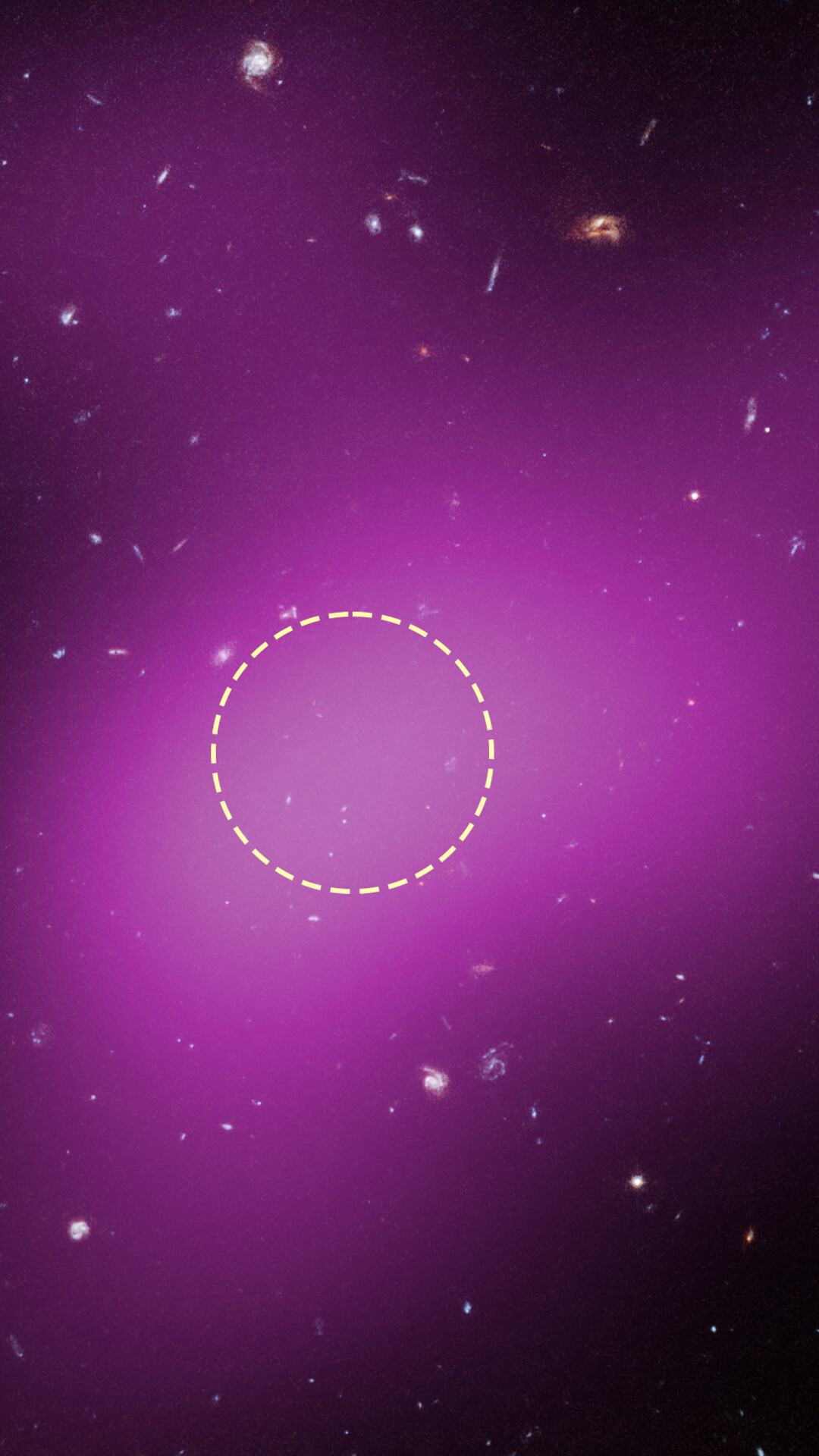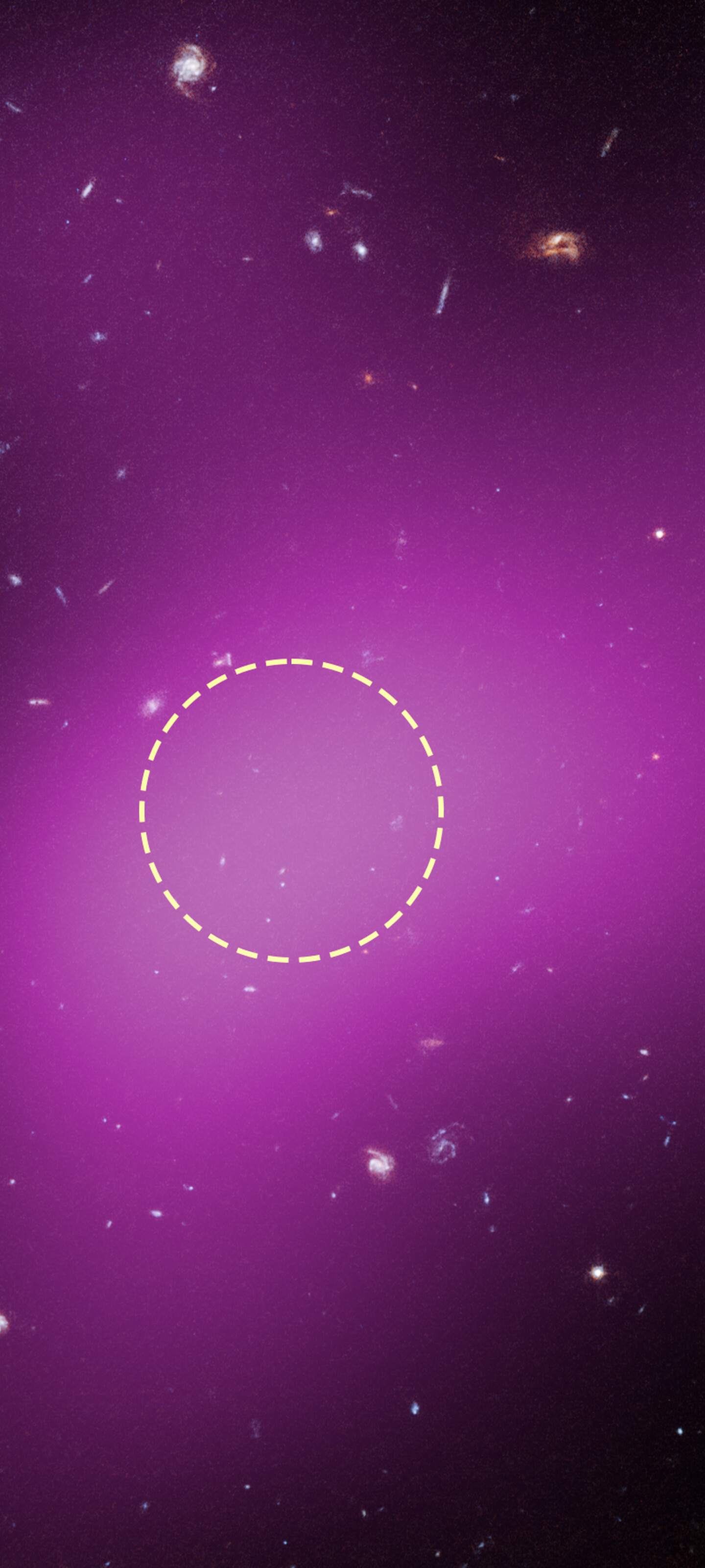 [Image description: A region of space mostly filled with background galaxies, with one prominent star at upper left. A large blob of purple haze occupies much of the field. Within the purple region, an unremarkable area is outlined with a dashed white circle.]