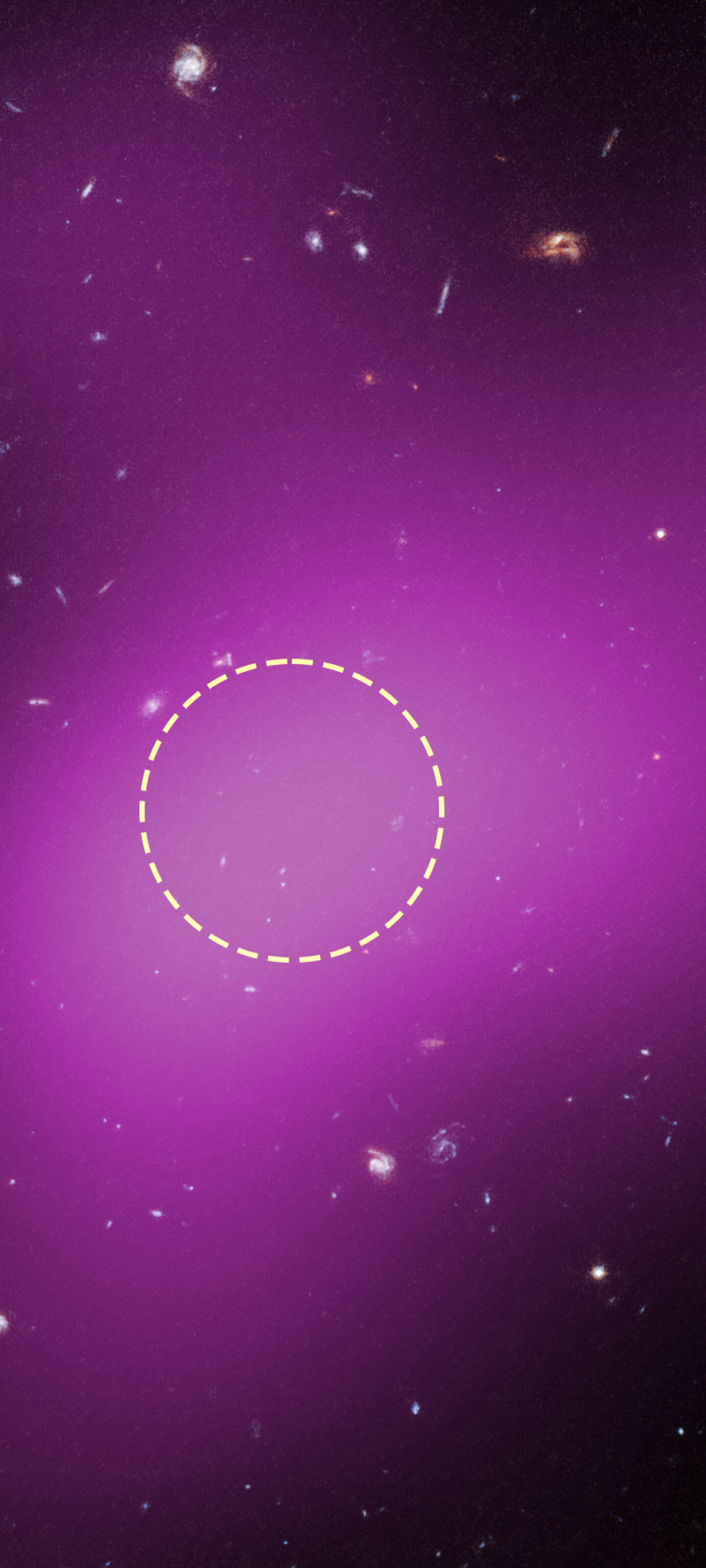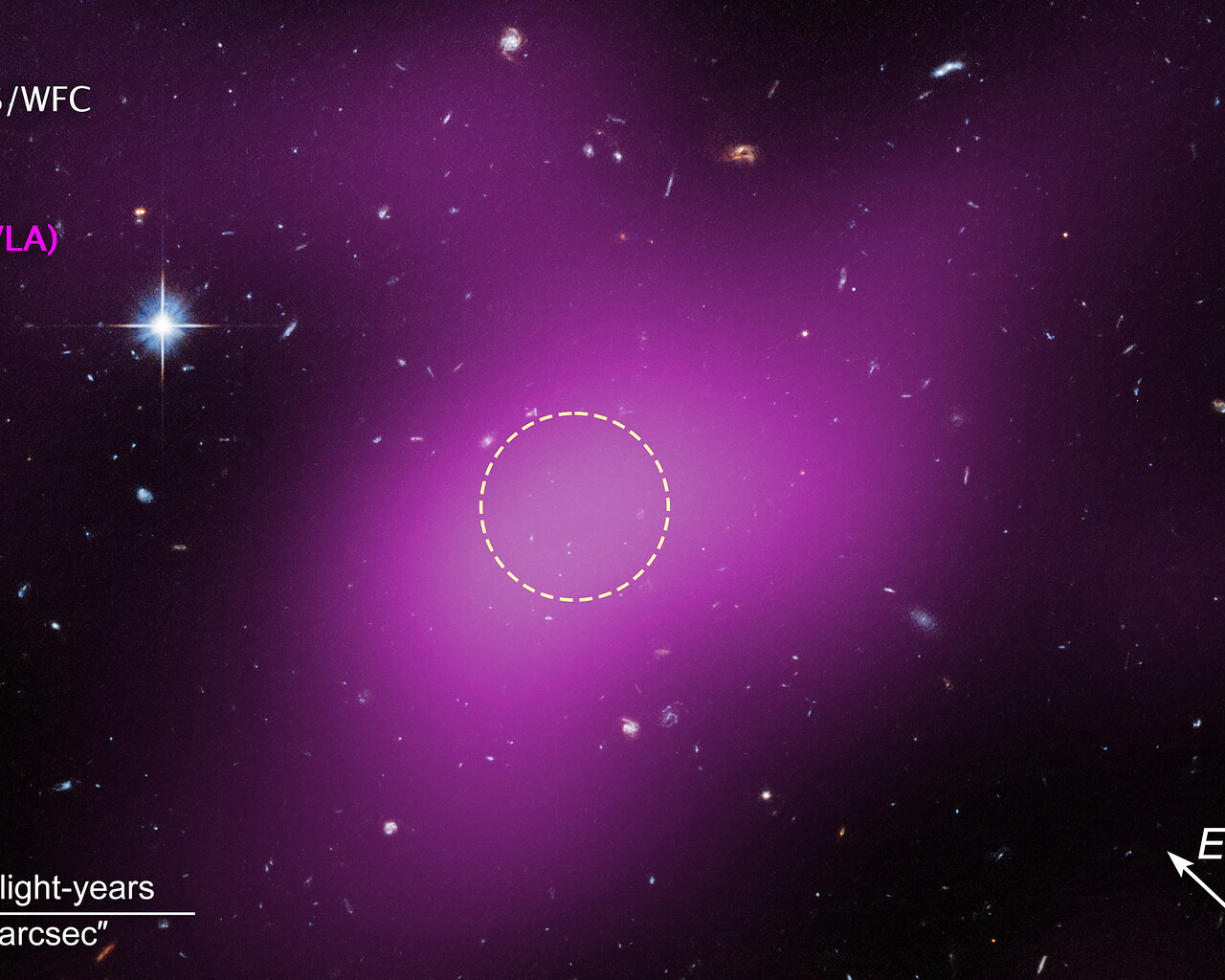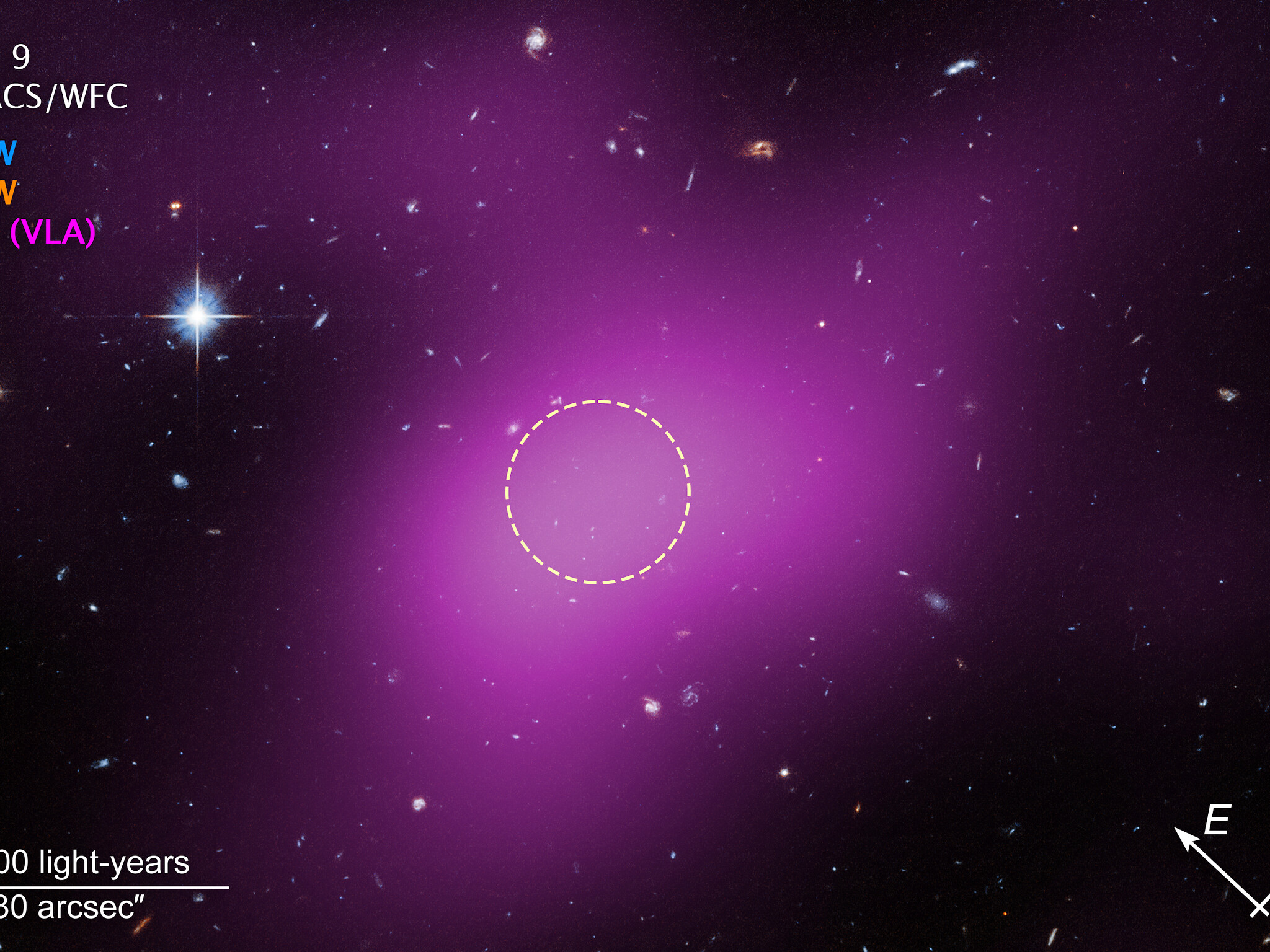 This image shows the location of Cloud-9, which is 14 million light-years from Earth. The diffuse magenta is radio data from the ground-based Very Large Array (VLA) showing the presence of the cloud. The dashed circle marks the peak of radio emission,which is where researchers focused their search for stars. Follow-up observations by the NASA/ESA Hubble Space Telescope’s Advanced Camera for Surveys found no stars within the cloud. The few objects that appear within its boundaries are background galaxies. Before the Hubble observations, scientists could argue that Cloud-9 is a faint dwarf galaxy whose stars could not be seen with ground-based telescopes due to the lack of sensitivity. Hubble’s Advanced Camera for Surveys shows that, in reality, the failed galaxy contains no stars.