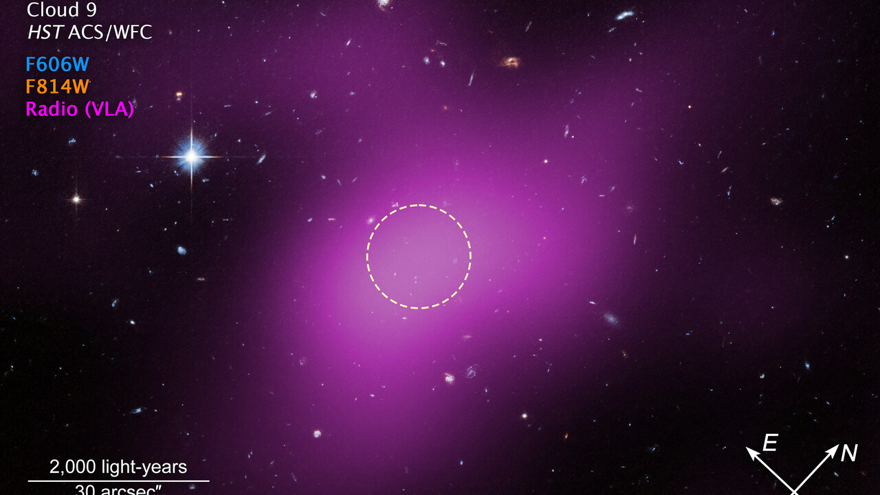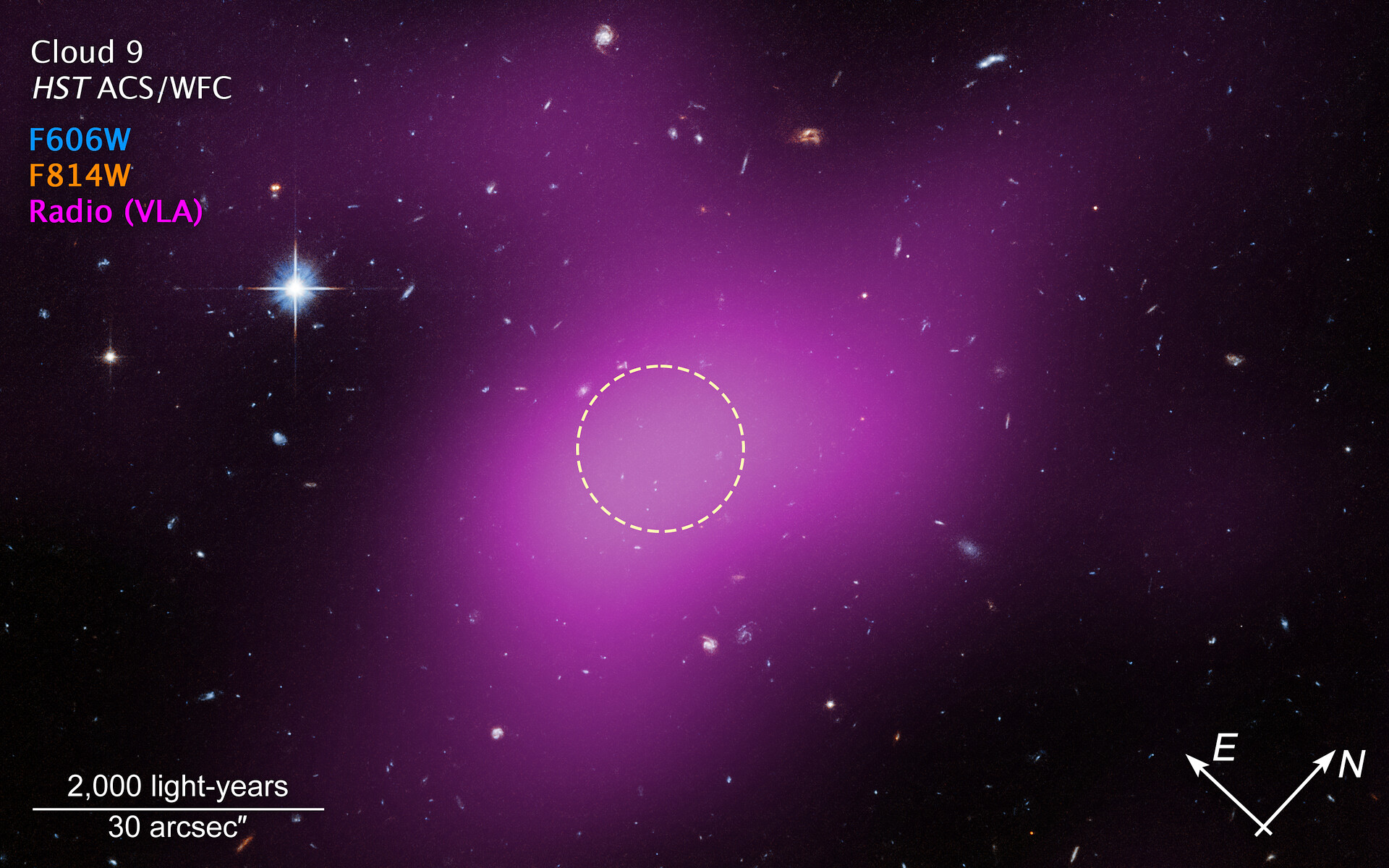 [Image description: An image labeled “Cloud 9 HST ACS WFC”. Below that, a color key shows F606W in blue, F814W in orange, and Radio VLA in purple. A region of space mostly filled with background galaxies, with one prominent star at upper left. A large blob of purple haze occupies much of the field. Within the purple region, an unremarkable area is outlined with a dashed white circle. At lower left, a scale bar extending about one-sixth of the image is labeled 2,000 light-years and 30 arcseconds. At lower right are compass arrows with east pointing to 10 o’clock and north pointing to 2 o’clock.]