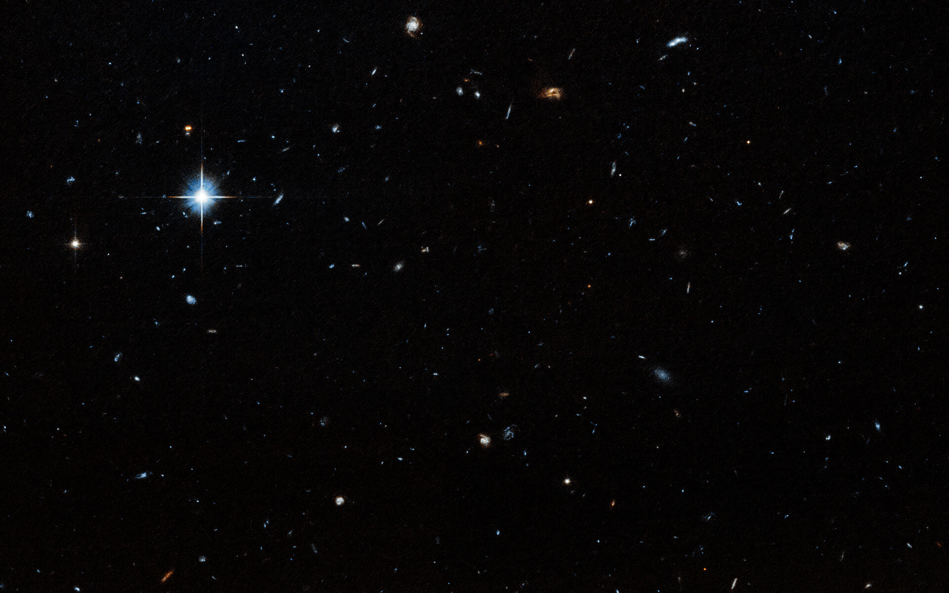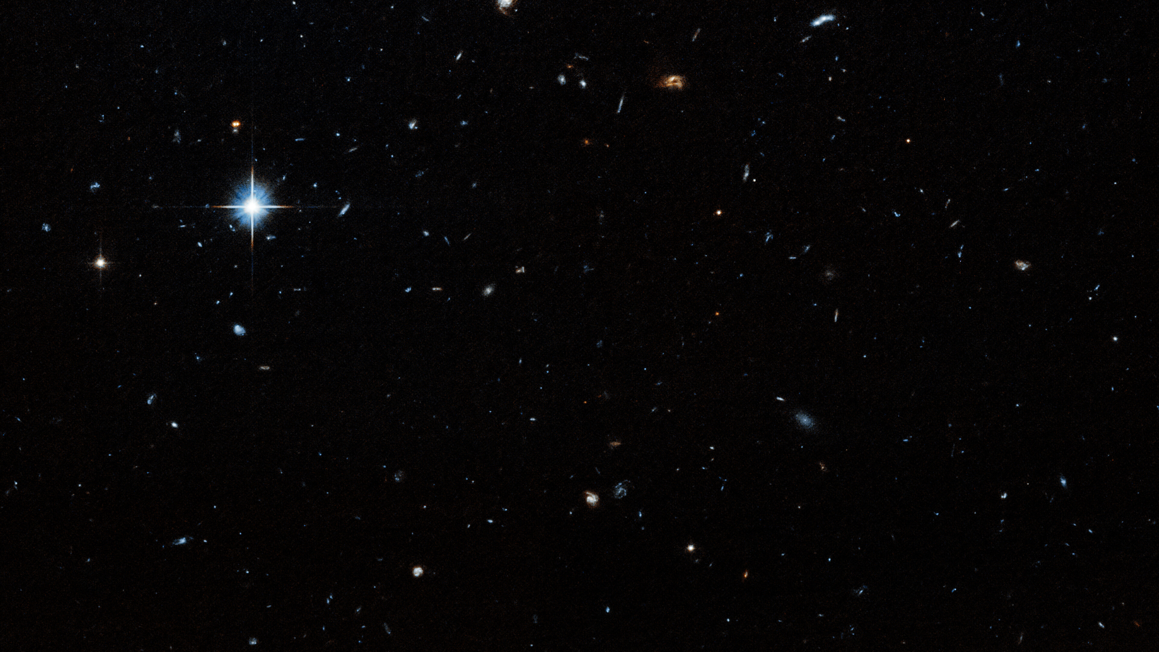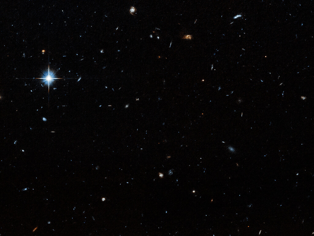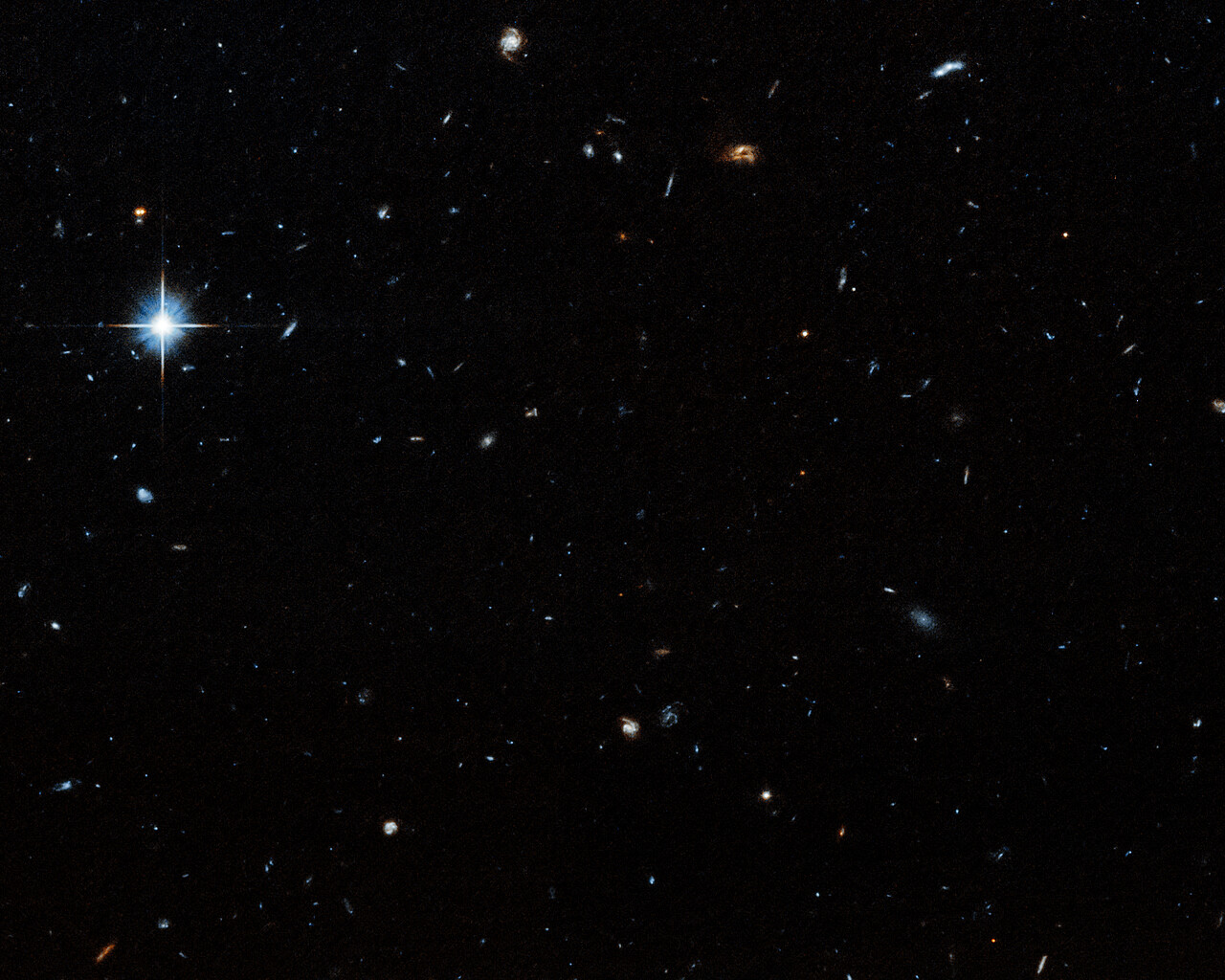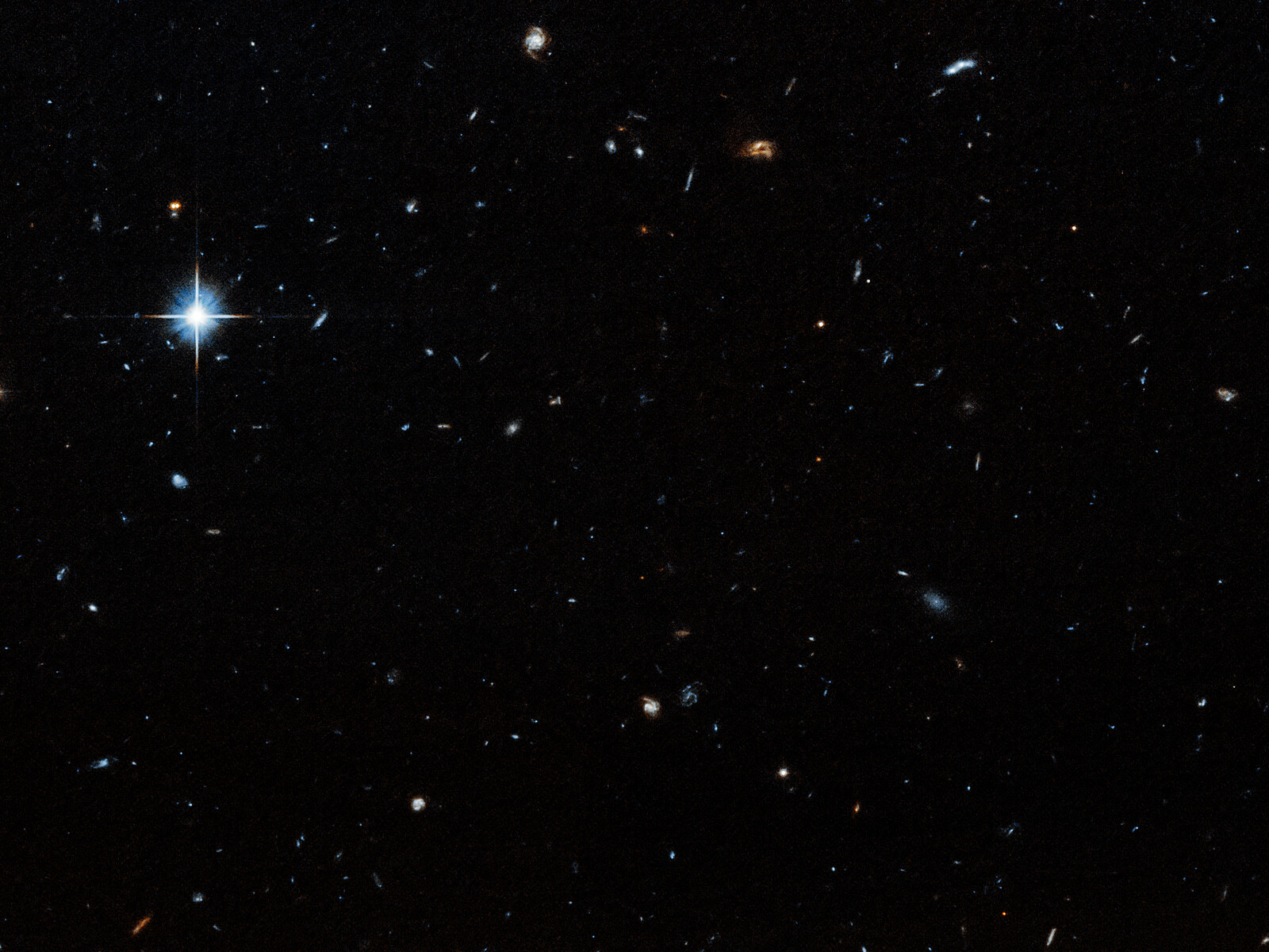 [Image description: A dark field with stars and galaxies of various sizes speckled throughout the image. A particularly bright star is visible in the upper left region of the image.]