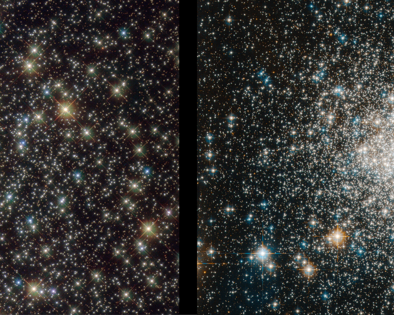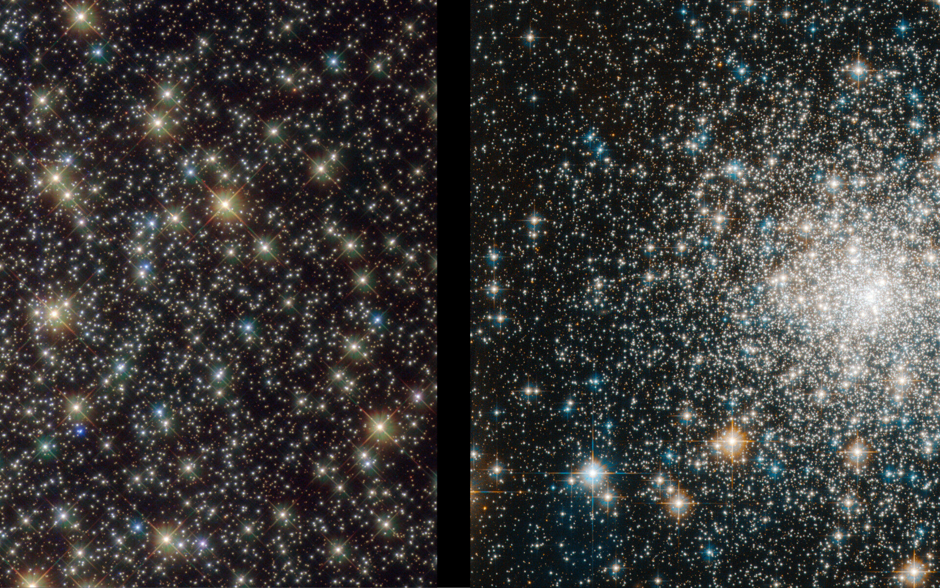 [Image description: A side-by-side visual of two globular clusters: NGC 3201 (left) and Messier 70 (right). The star cluster on the right is visibly compact in shape, as the stars near the centre of the object appear very close together. Contrastingly, the star cluster on the left is less compact, as the stars are more spread apart from one another in the field.]