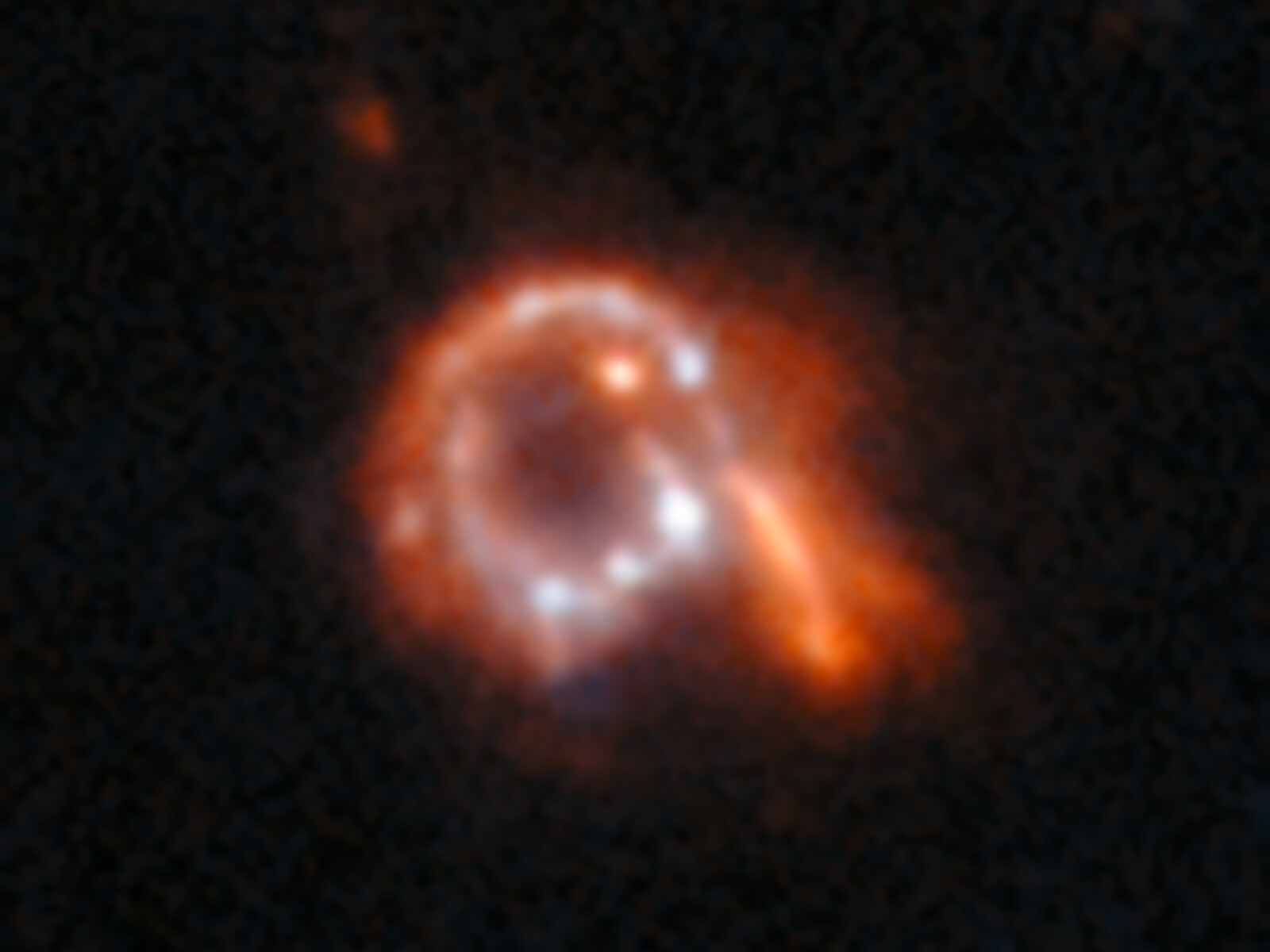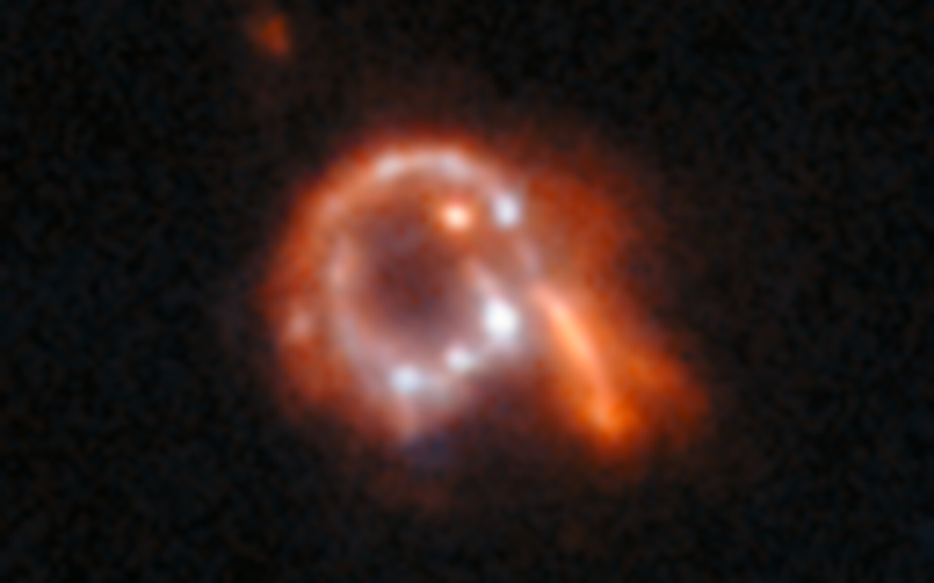[Image description: A small image of a mostly red galaxy. Unusually, it is ring-shaped with spots of light around the ring, a protruding arm on one side and a dark hole in the centre.]
