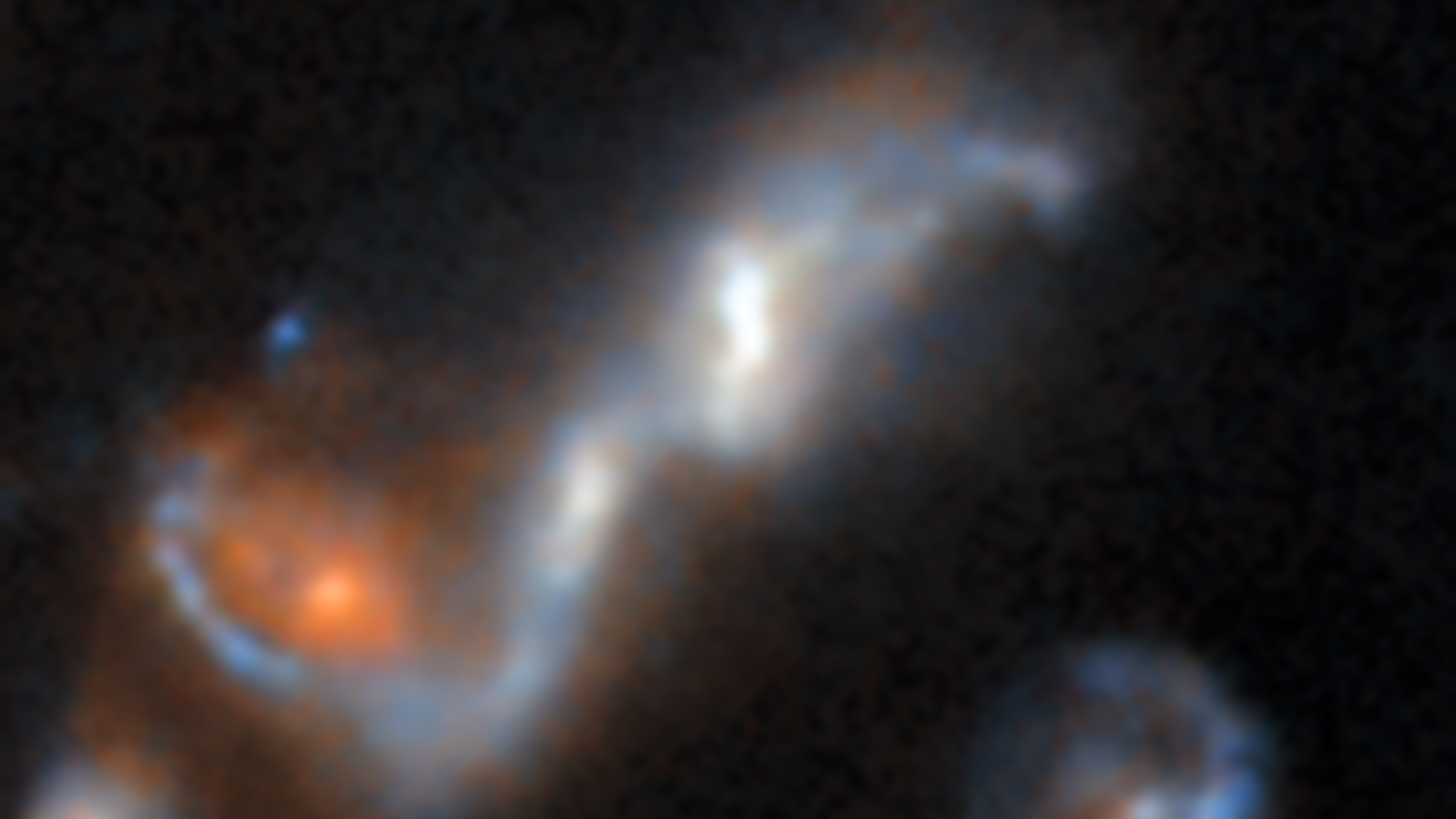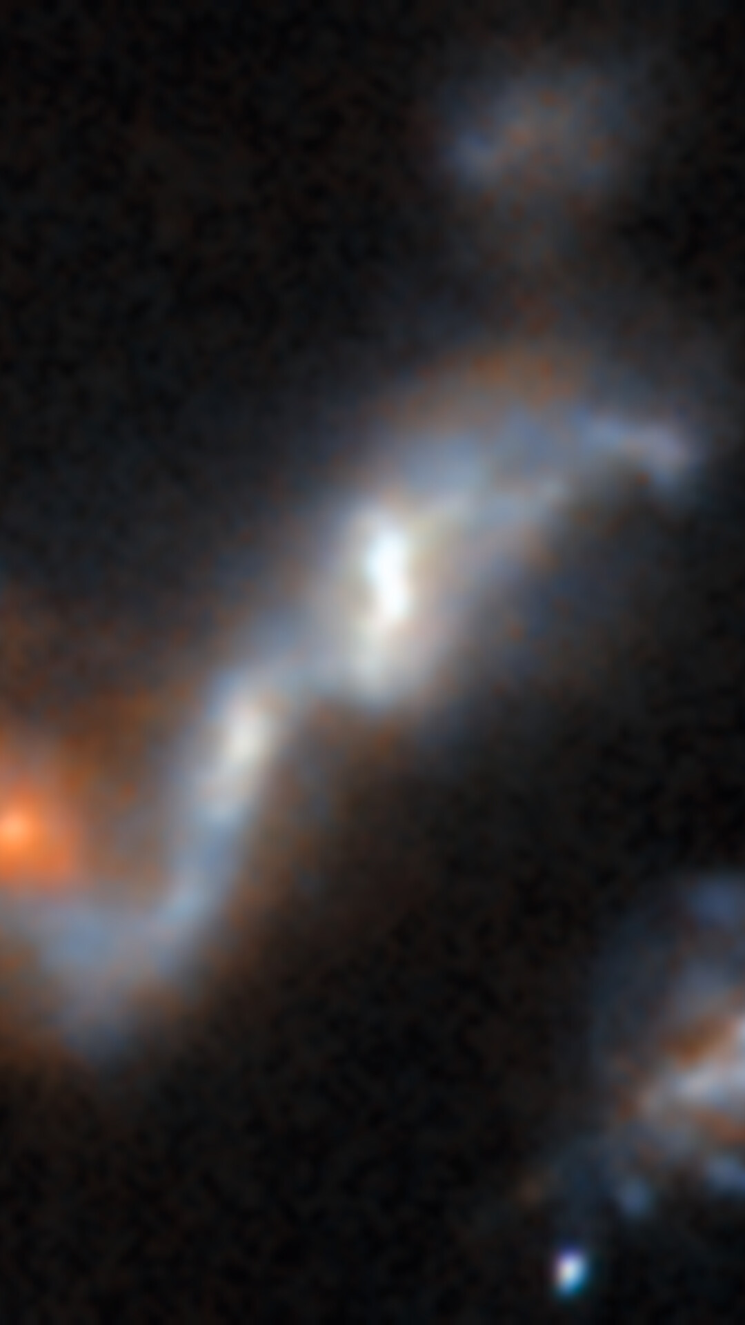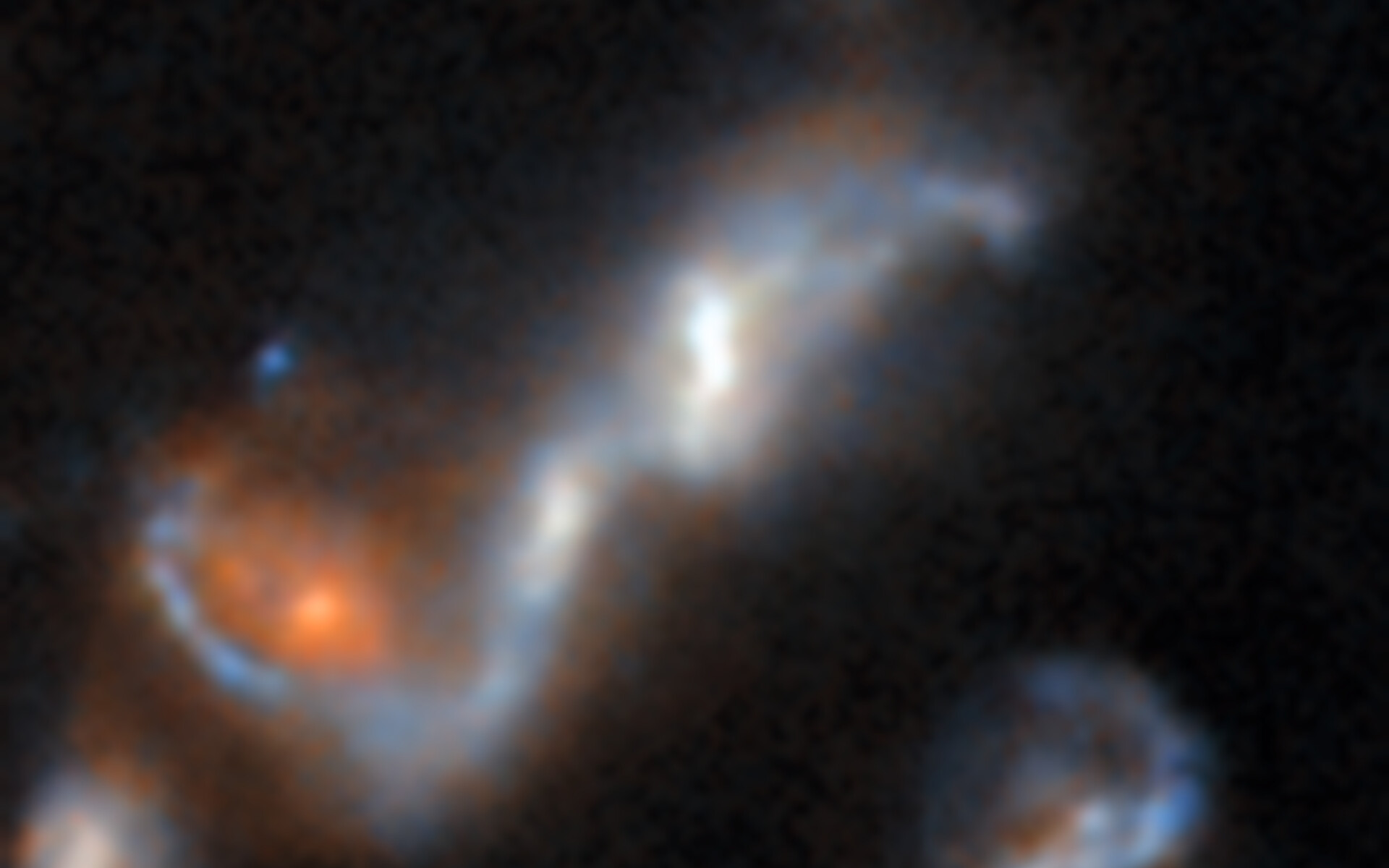 [Image description: A small image of several galaxies with distorted shapes. The central galaxy is bluish in colour with a bright centre. It is stretched out into a long, curled bar. At one end sits a reddish galaxy which the bar curves around.]