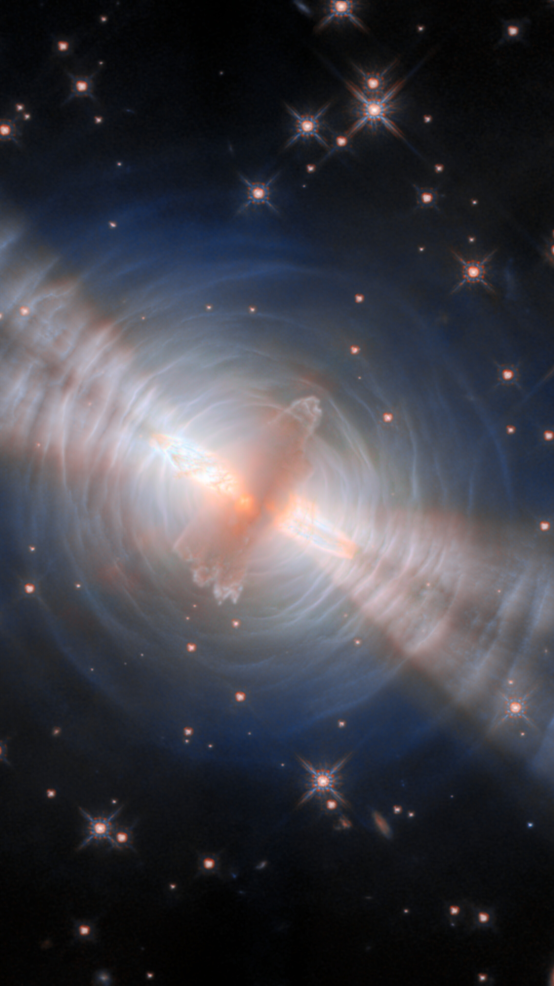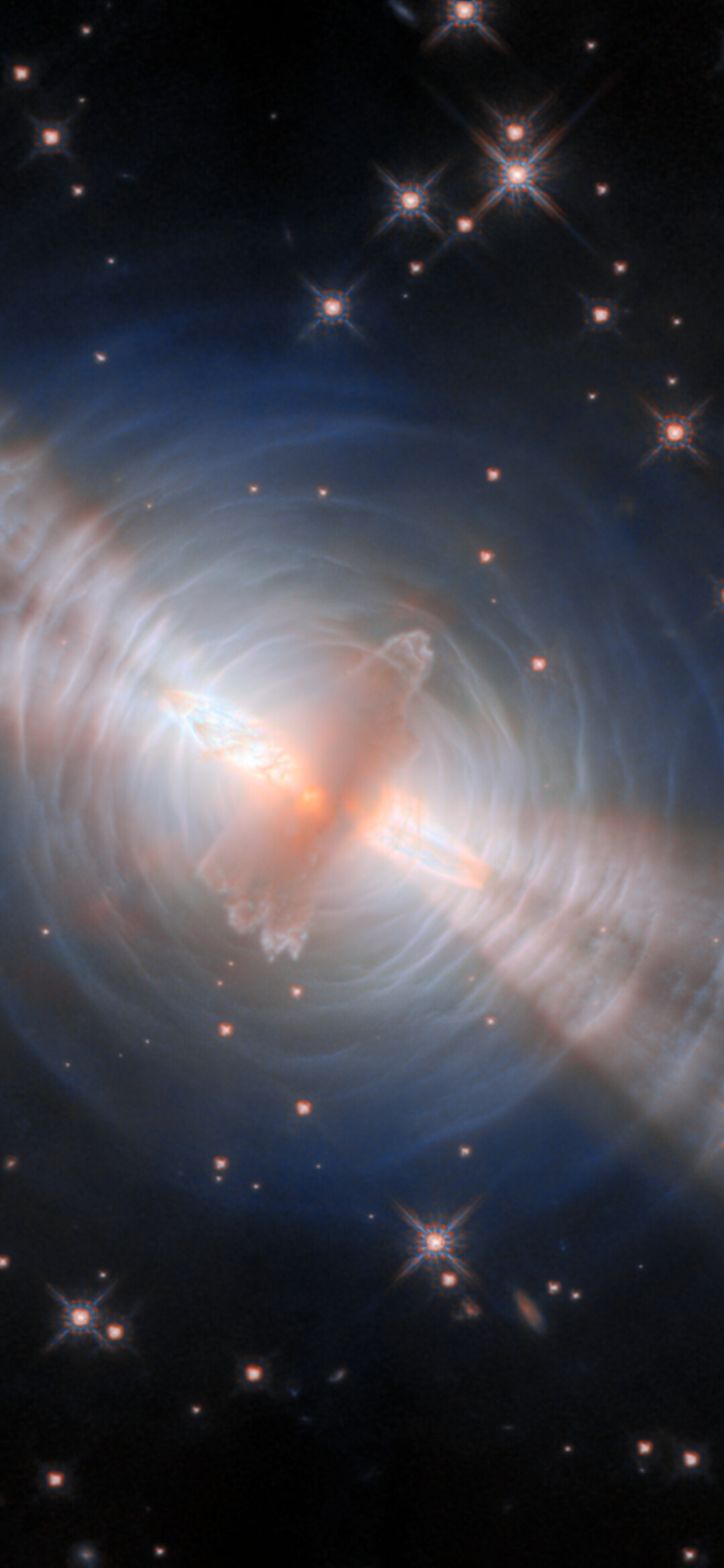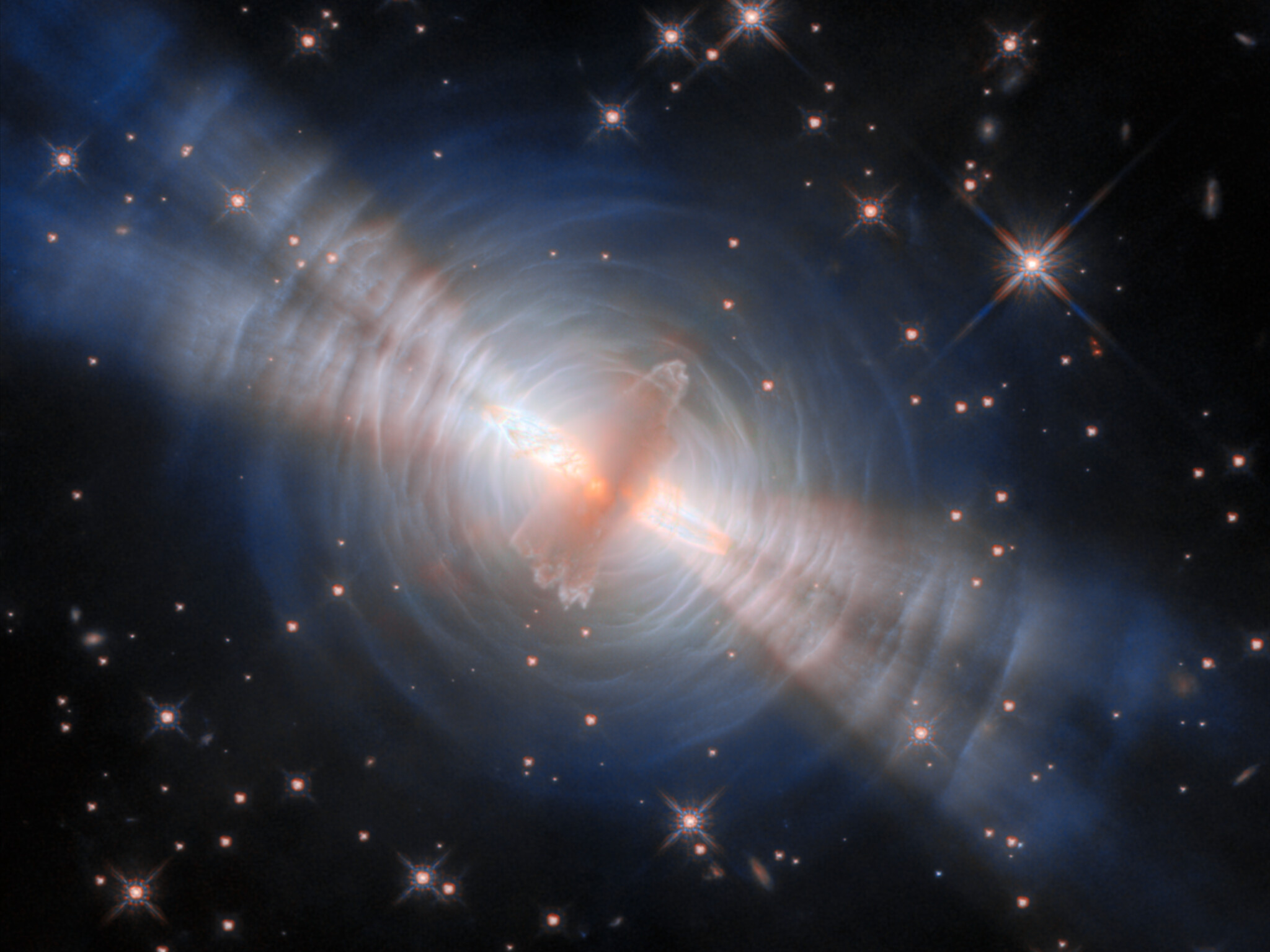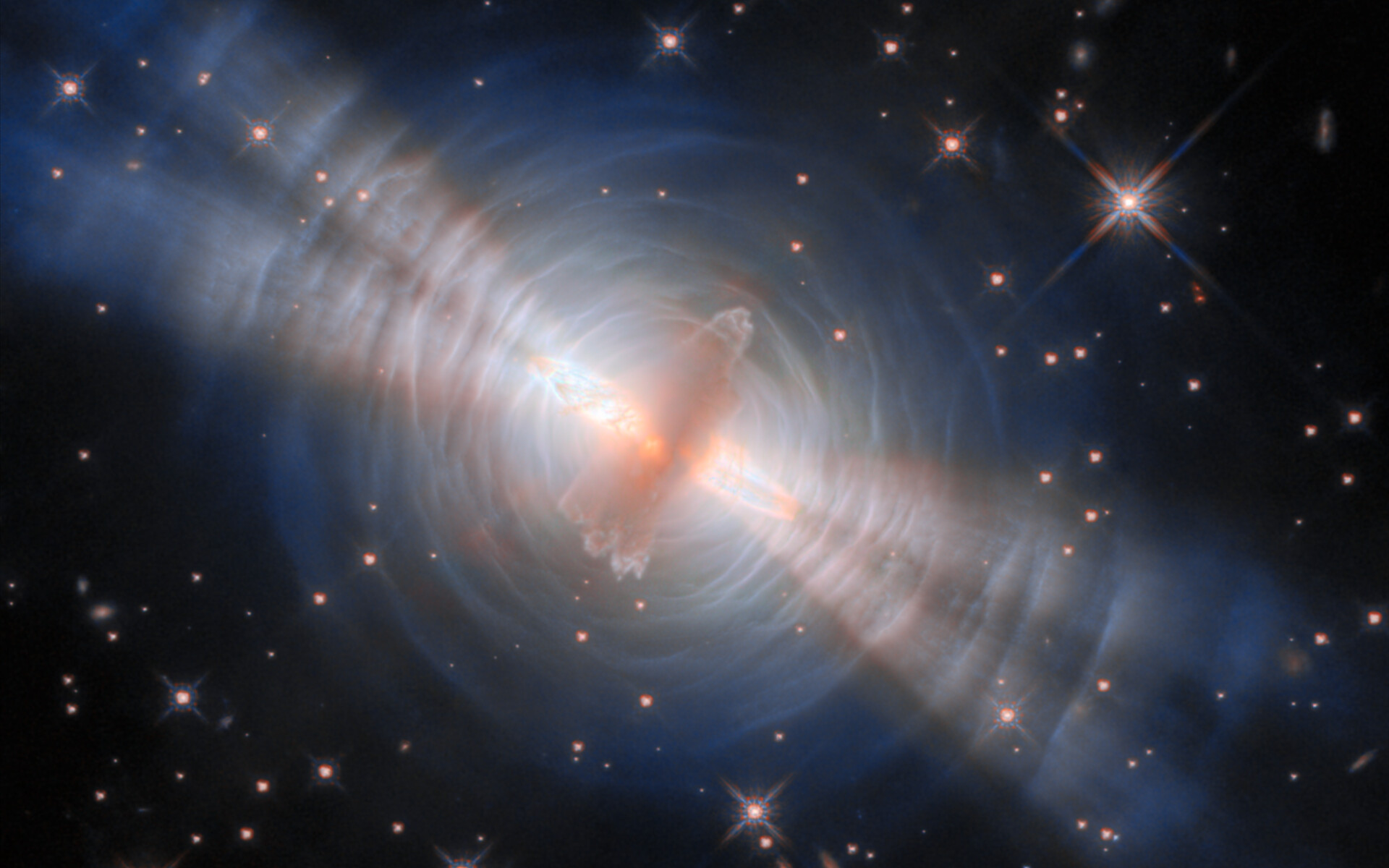 The central cloud of dust is surrounded by concentric rings, themselves made up from thin, faint arcs of gas. These were created by successive outbursts from the central star, which ejected a little more material from its outer surface every few hundred years. The beams of starlight are reflected by these layers of gas, creating an appearance like ripples on the surface of water. The way that gas molecules reflect and scatter light gives a bluish colour to the arcs. The reflected starlight reveals important details about the central star, which is impossible to view directly in its dusty shell.