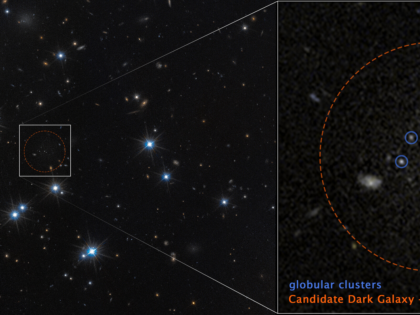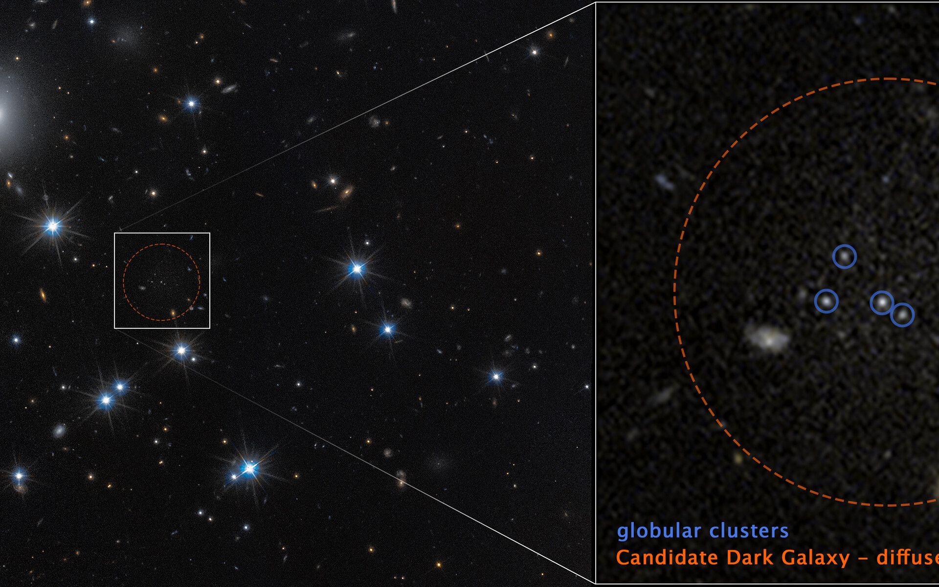 [Image description: At left, a field of space with a dozen white foreground stars and a number of small, yellow background galaxies. An unremarkable area at centre is outlined with a dashed circle surrounded by a white box. Lines extend from the box to a pullout at right containing faint, grainy white light surrounded by a circle labeled “Candidate dark galaxy – diffuse emission.” Four white dots are circled in blue and labeled globular clusters.]