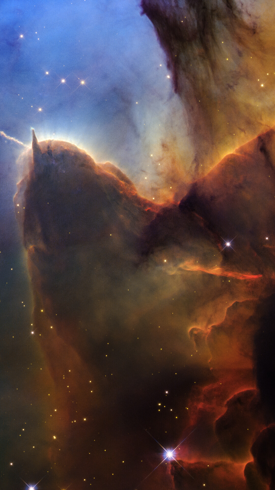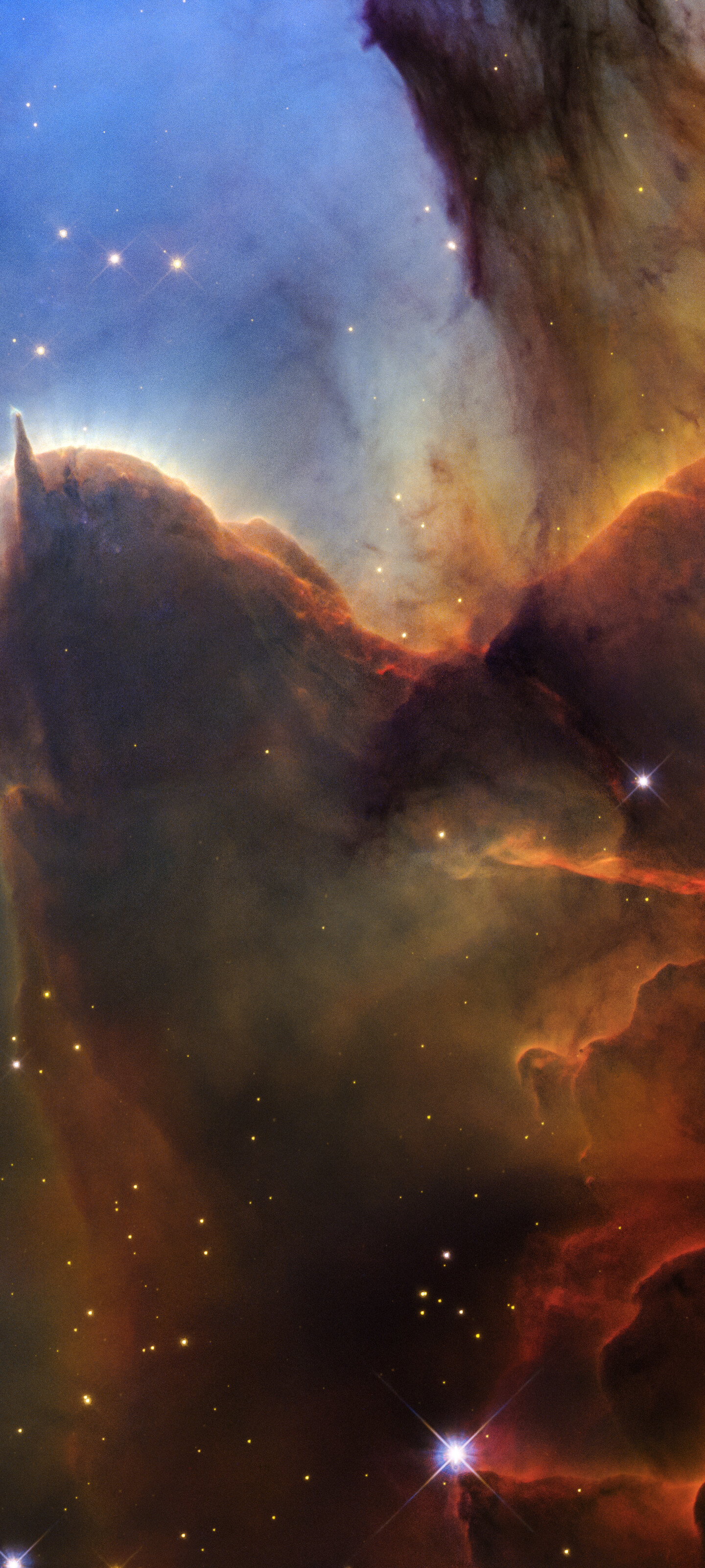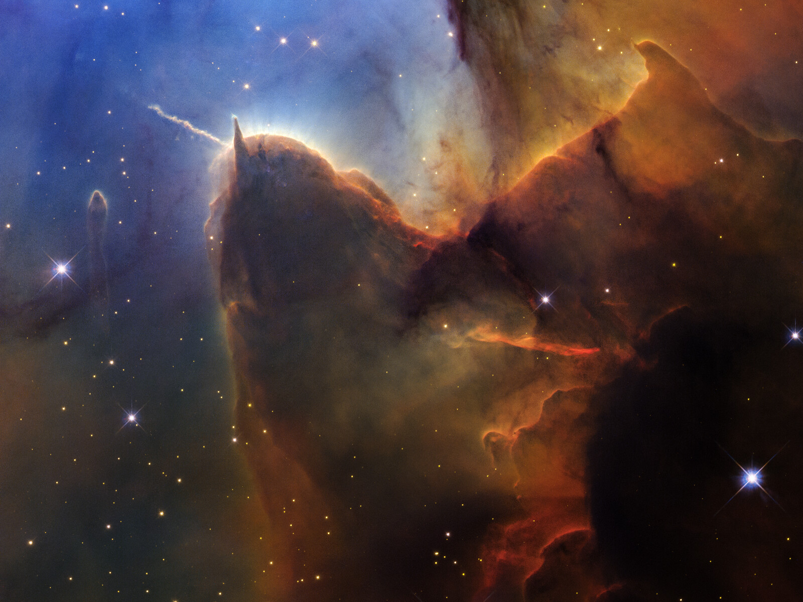 [Image description: A tightly cropped Hubble view of a vast star-forming region known as the Trifid Nebula. The top left is bright blue. Brown and amber colours run from top right through the center in irregular, overlapping lines to the bottom-center. At bottom right, the view is almost black. Tiny, amber-coloured stars appear throughout the scene. Toward the left there is a prominent brown shape that looks like a head with two horns. The left horn points left and is wavy. The right horn is triangular and points up. The brown dust continues, flowing down, as if along a back, and up toward the top right. A prominent line, about the same length as the left horn, appears below the middle of the body, and changes from orange to red. A small, separate semi-transparent pillar is left of the head. A few slightly larger, blue foreground stars with four diffraction spikes appear in the bottom half.]
