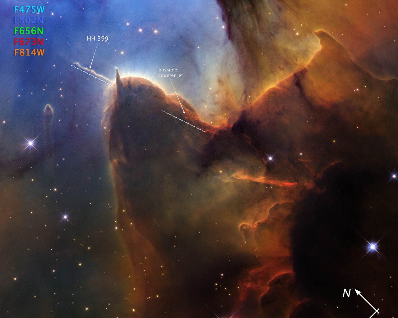 [Image description: A star-forming region is blue at top left, brown and amber from top right to bottom center, and black at bottom right. Tiny, amber-coloured stars float throughout. Toward the left there is a brown shape that looks like a head with two horns. A label, HH 399 jet, marks the left horn. A second label, possible counter jet, marks a redder area within the “body” of brown dust. Below the title is a colour key showing which WFC3 filters were used to create the image and which visible-light colour is assigned to each filter. From top to bottom: F475W (light blue), F502N (blue), F656N (green), F673N (red), F814W (orange). At the bottom left is a scale bar labeled 1 light-year, 42 arcsec. The length of the scale bar is about one fourth of the image. At the bottom right are compass arrows indicating the orientation of the image on the sky. The east arrow points toward 7 o’clock. The north arrow points toward 10 o’clock.]