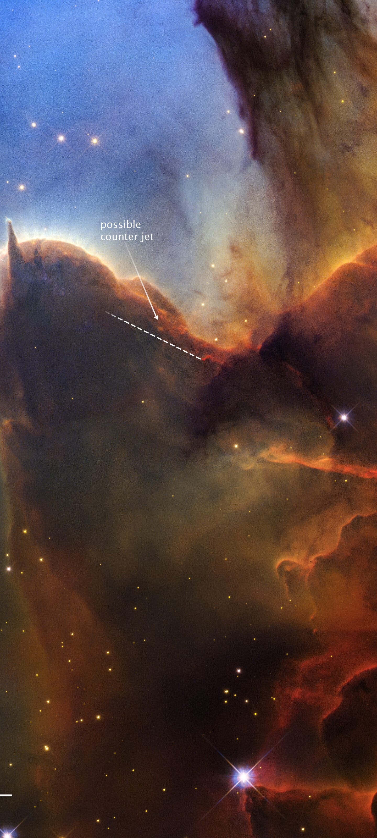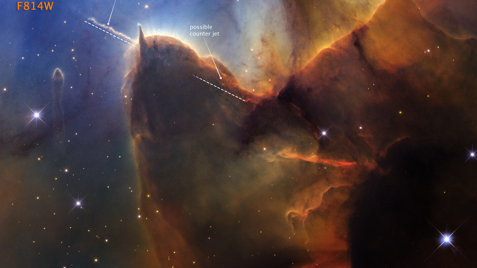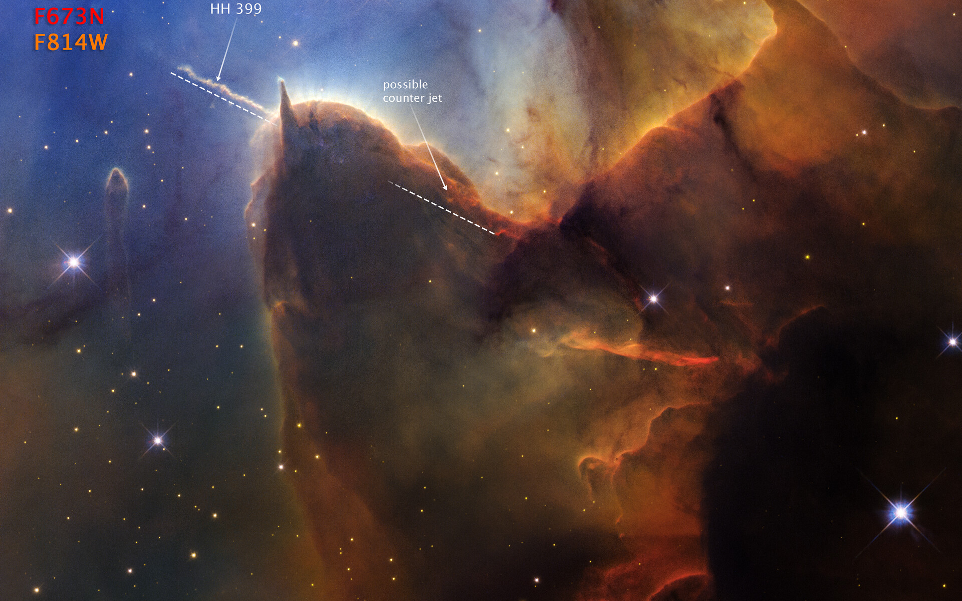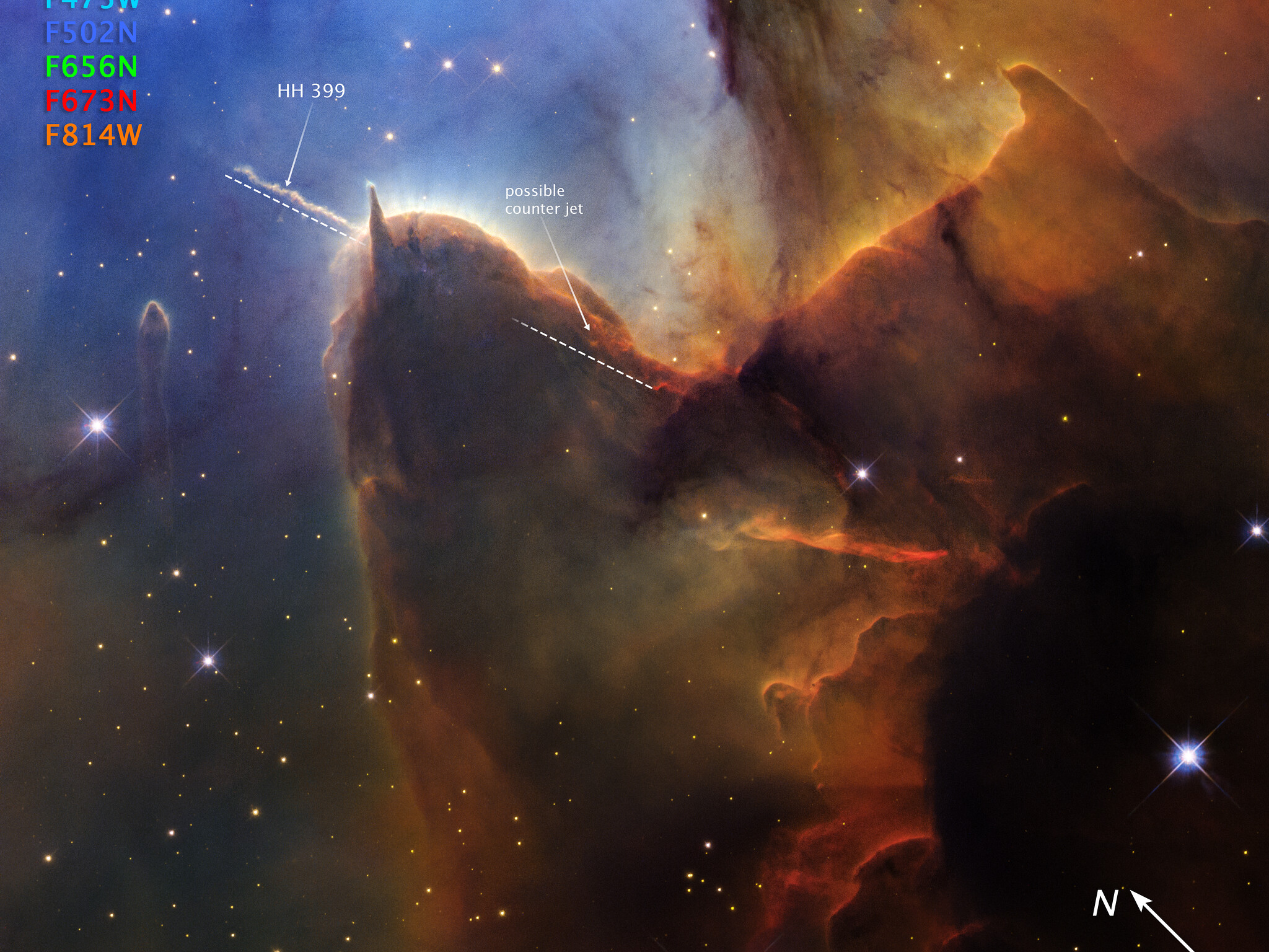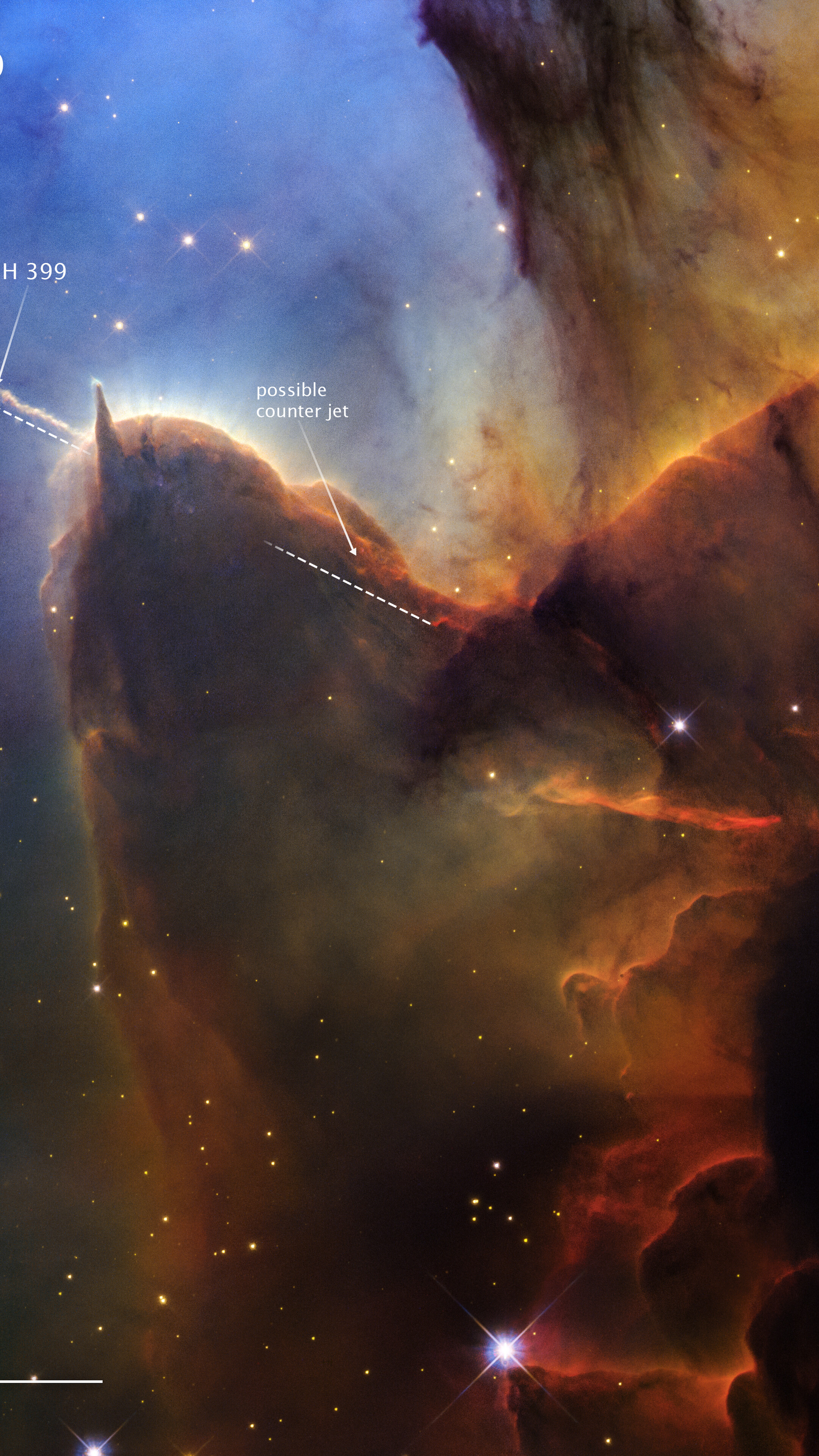 A jet of plasma ejected by a young protostar embedded in the brown dust, known as Herbig-Haro 399 (HH 399) is labeled, along with its suspected counter jet.