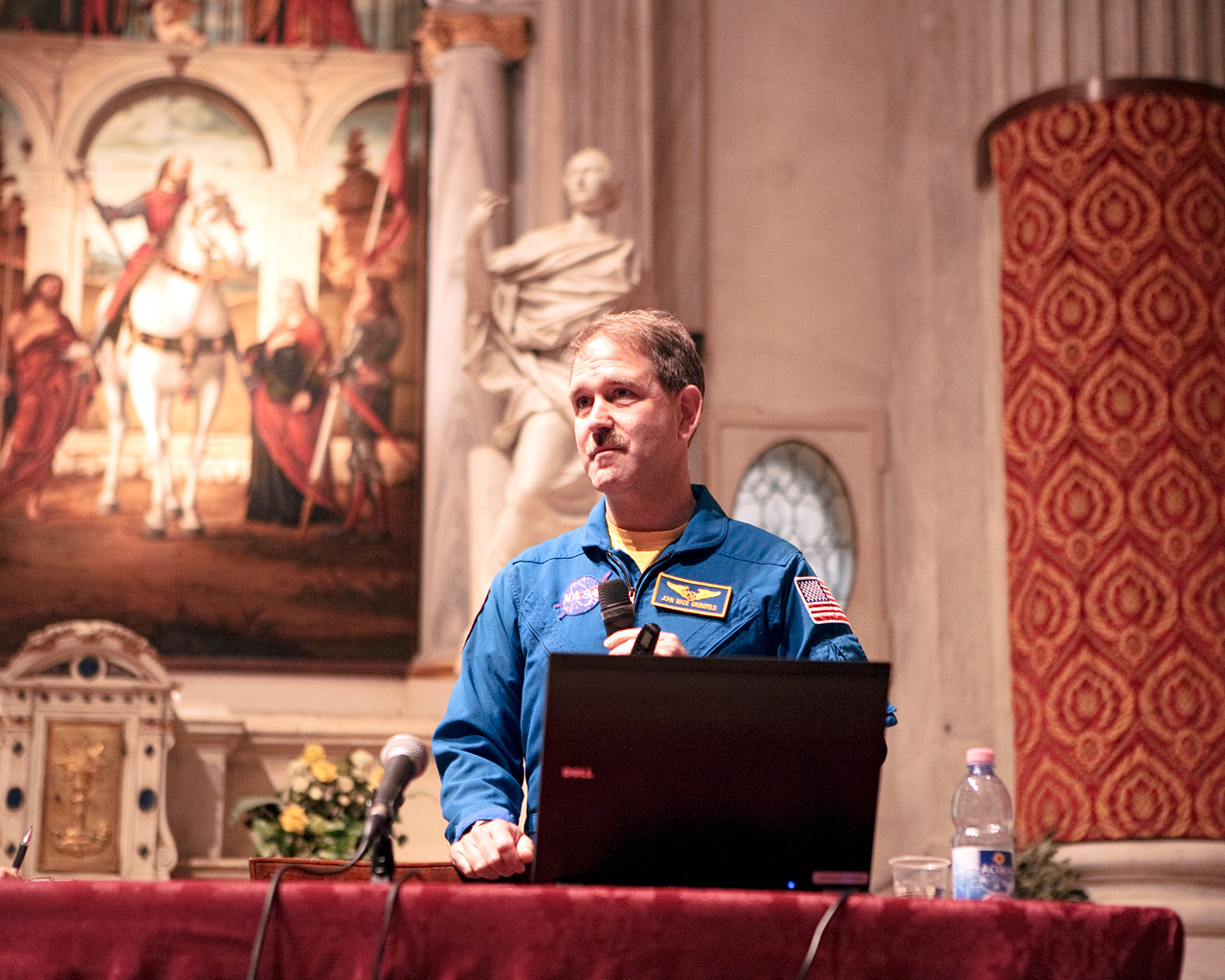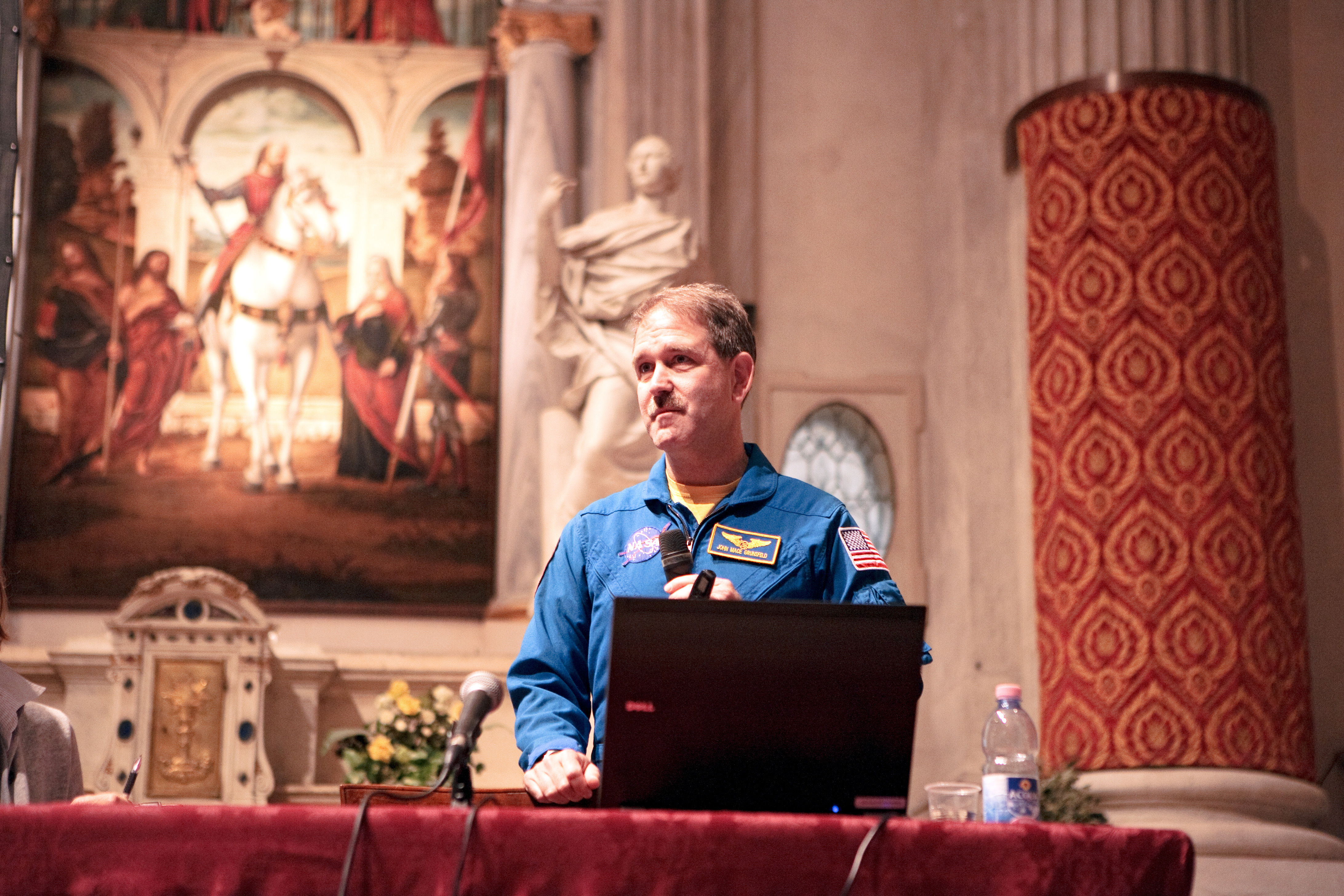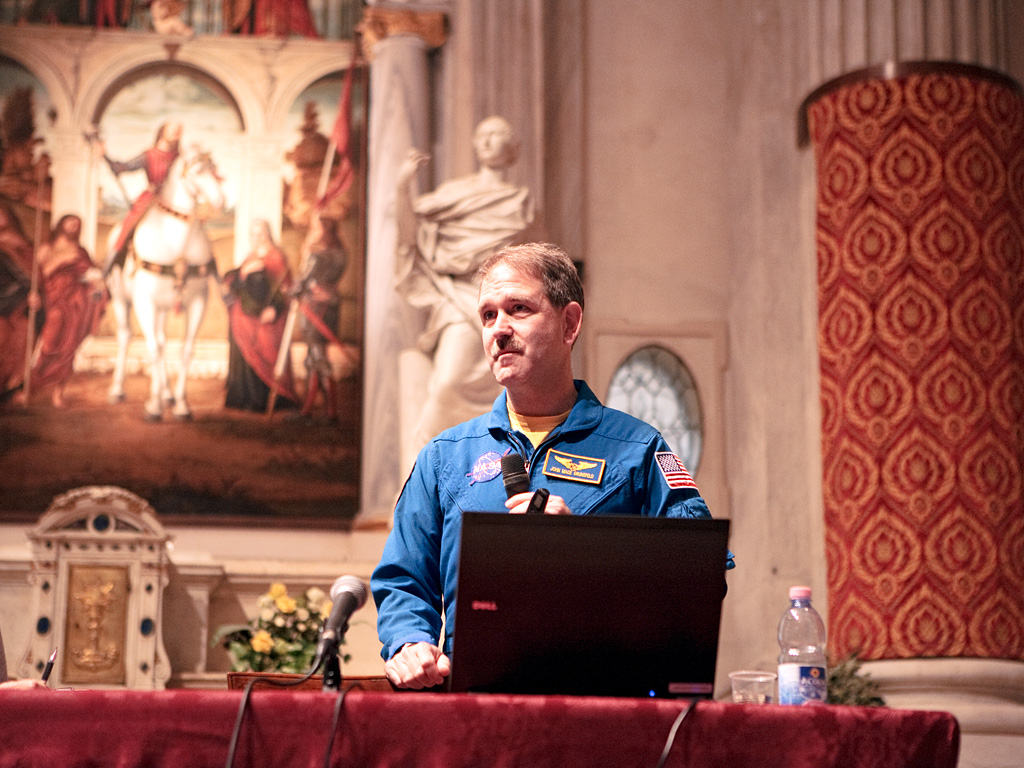 Astronaut John Grunsfeld, who served during three servicing missions to the Hubble Space Telescope, gives a public lecture during the Science with the Hubble Space Telescope III conference in Venice, Italy, in October 2010.