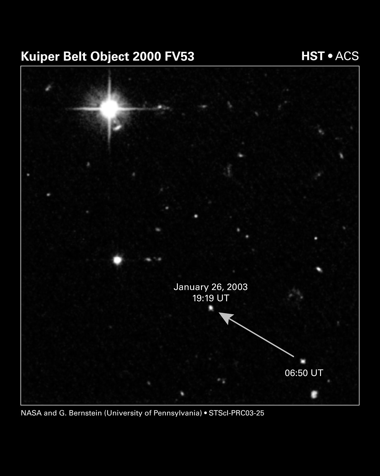 Two snapshots, taken 12 hours apart, were combined to produce this Hubble Space Telescope image of a Kuiper Belt object (named 2000 FV53) moving across the sky. Hubble's Advanced Camera for Surveys tracked the object on Jan. 26, 2003. Like all the planets, this solar-system member appears to move relative to the fixed stars and galaxies in the background. This particular object was discovered from Hawaii in March 2000 and used to help target the Hubble observations. The three new Kuiper Belt members discovered by Hubble are up to 100 times fainter than this one. In fact, the objects are so faint that they cannot be seen by the human eye. Astronomers used computer analysis to find them. This image spans about 0.04 percent of the area of the full moon (less than 0.01 degree of the sky, about 0.04 percent of the area of the full moon. Astronomers used Hubble to search an area 250 times arger than shown in this image, discovering three new solar system "fossils" as small as 15 miles (25 km) across.
