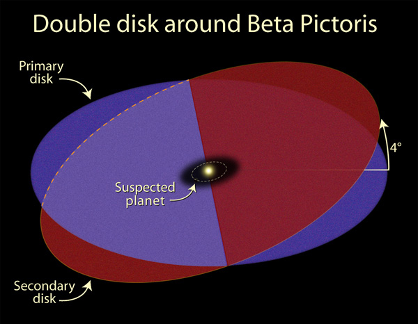 Detailed images of the nearby star Beta Pictoris, taken by NASA/ESA Hubble Space Telescope, confirm the existence of not one but two dust disks encircling the star. The images offer tantalizing new evidence for at least one Jupiter-size planet orbiting Beta Pictoris.