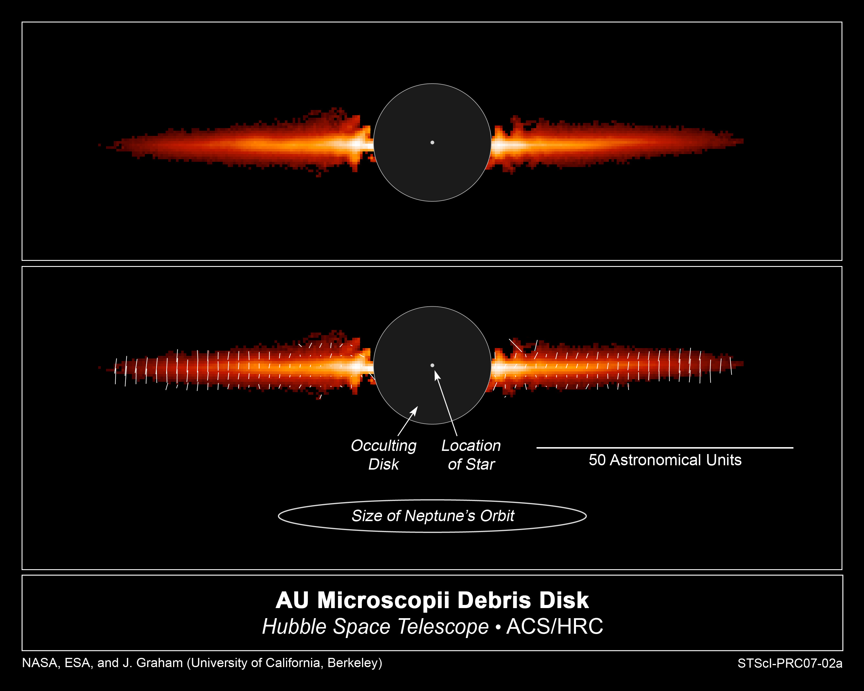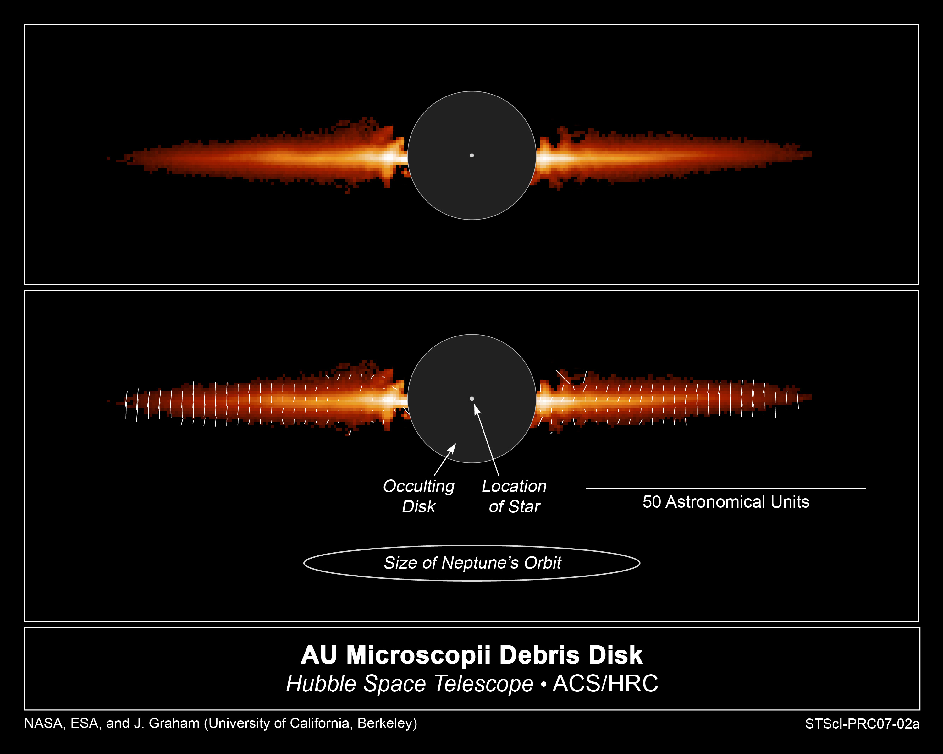 The only light seen is starlight reflected off dust in the debris disk. Astronomers used polarizing filters on the Advanced Camera to analyze the dust in the disk. The polarizing filters allowed astronomers to study how dust is reflecting the starlight. A polarizing filter lets through light vibrating in one orientation while blocking light oscillating in other directions. The white lines in the bottom image illustrate the direction a light wave is oscillating. The length of the line represents the degree to which all the light waves are oscillating in the same direction.