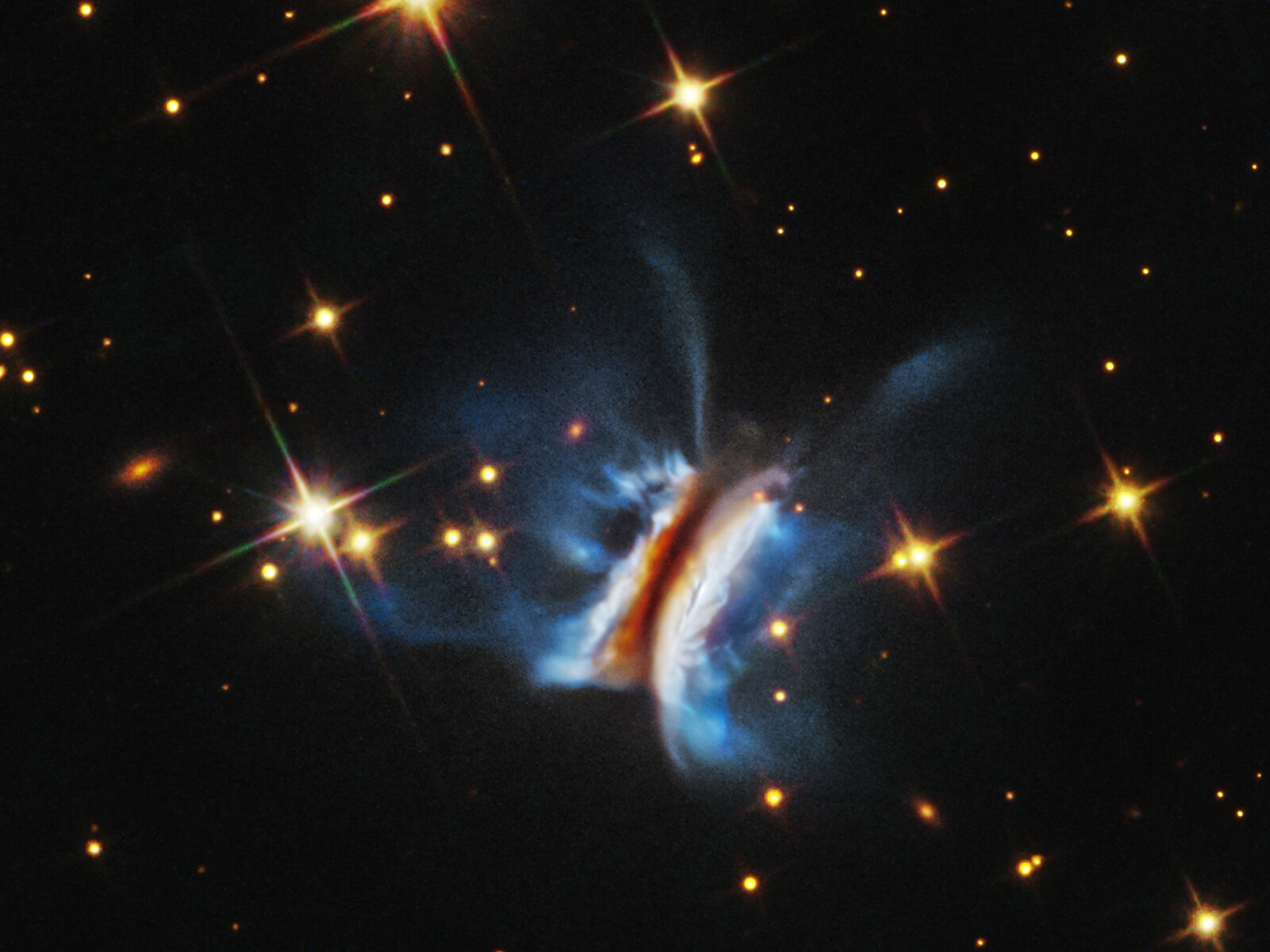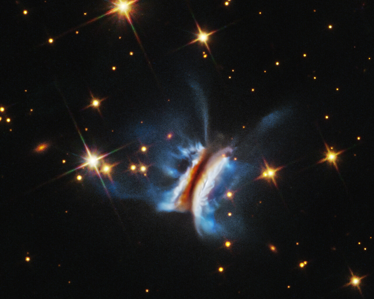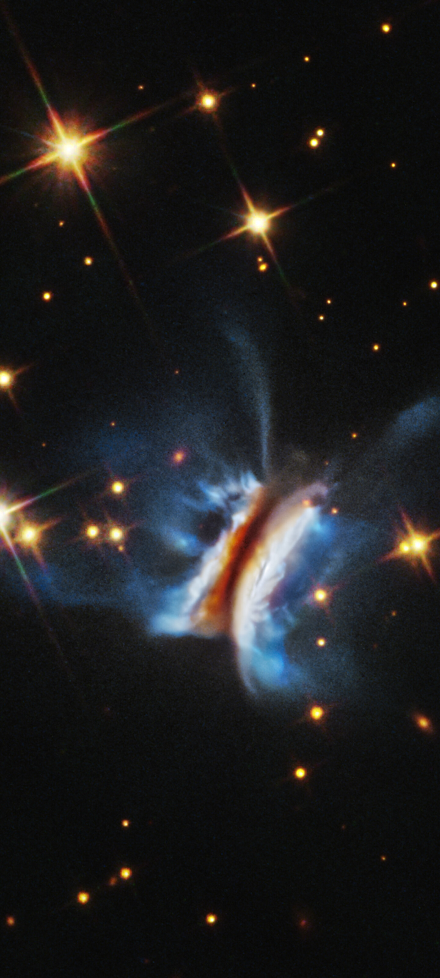 [Image description: Near the center is an object that resembles an edge-on view of a hamburger. There is a diagonal dark strip (the meat patty) of dust, running from 1 o’clock to 7 o’clock, that obscures a central star. Curving away from either side of the dark strip are glowing white clouds (the buns) where dust is reflecting starlight. Bright blue finger-like wisps of material extend far above and below the dark center plane. A few dozen stars, some with four diffraction spikes, are scattered on the black background of space.]