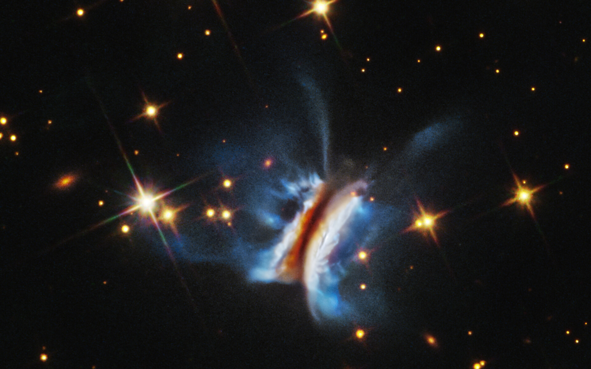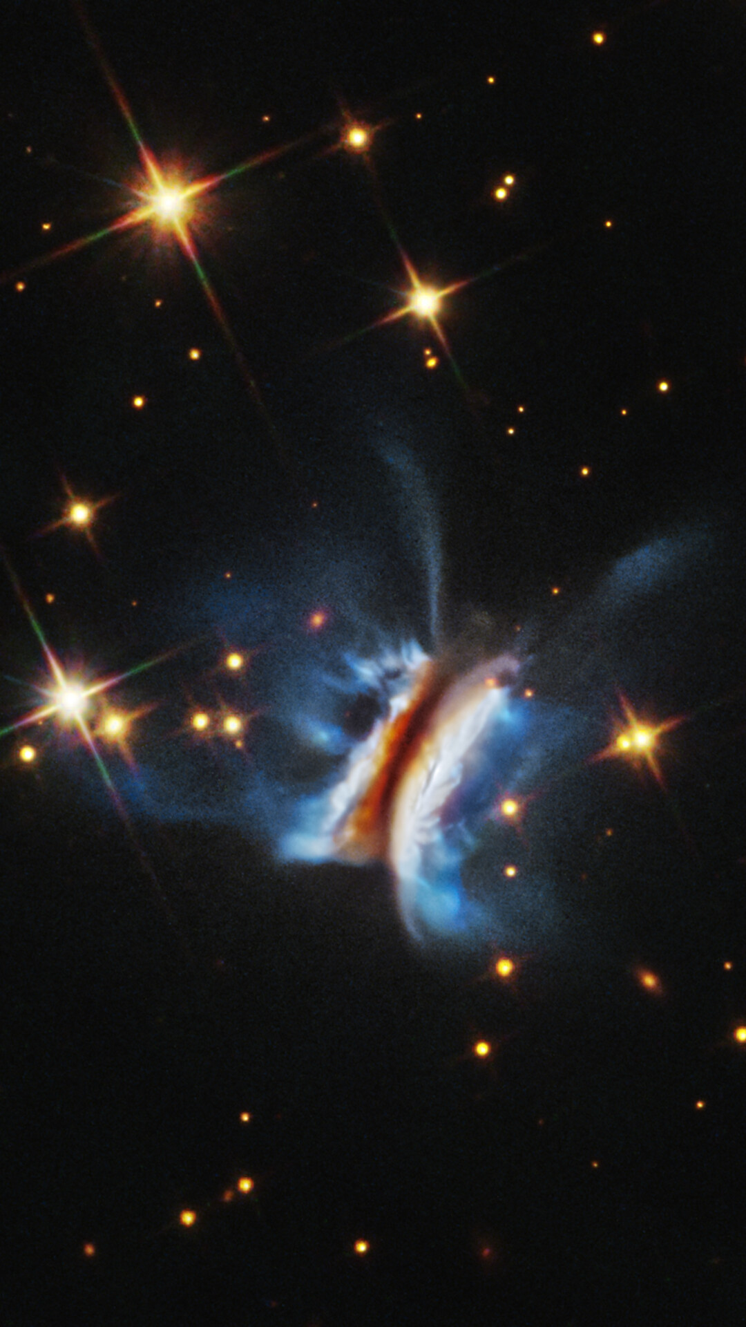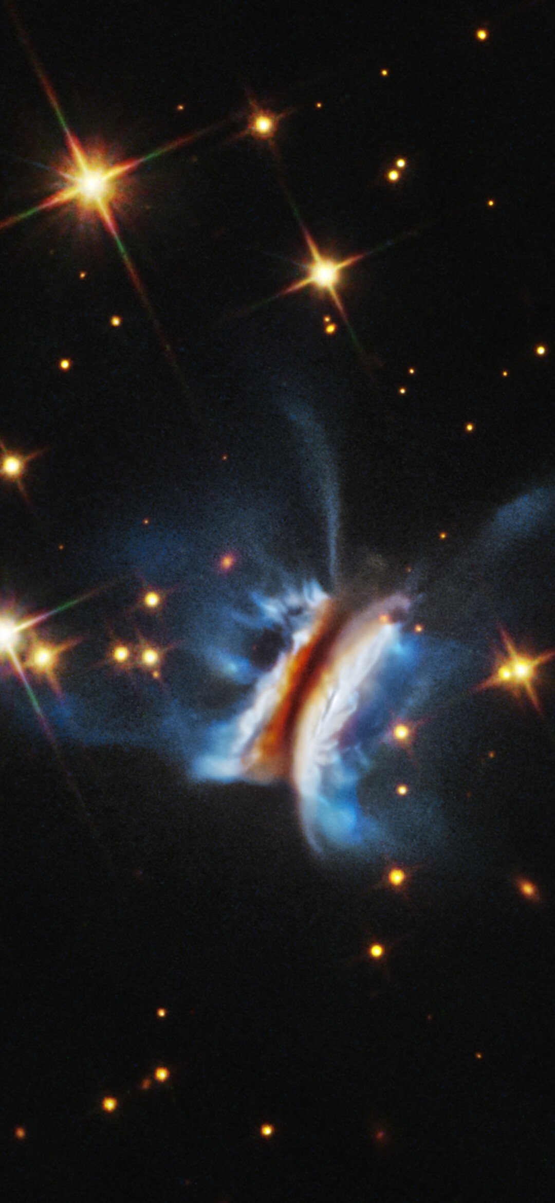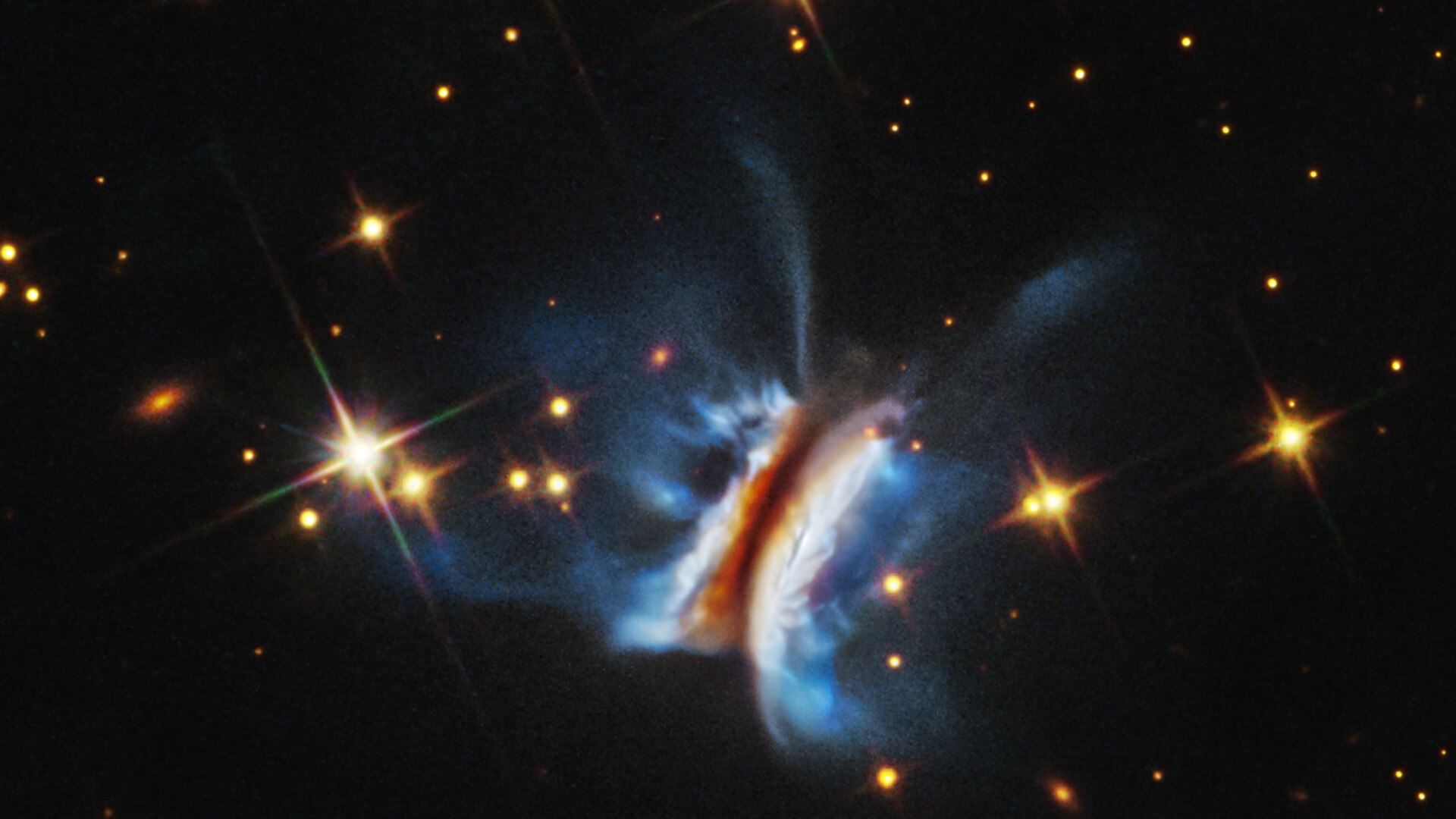[Image description: Near the center is an object that resembles an edge-on view of a hamburger. There is a diagonal dark strip (the meat patty) of dust, running from 1 o’clock to 7 o’clock, that obscures a central star. Curving away from either side of the dark strip are glowing white clouds (the buns) where dust is reflecting starlight. Bright blue finger-like wisps of material extend far above and below the dark center plane. A few dozen stars, some with four diffraction spikes, are scattered on the black background of space.]