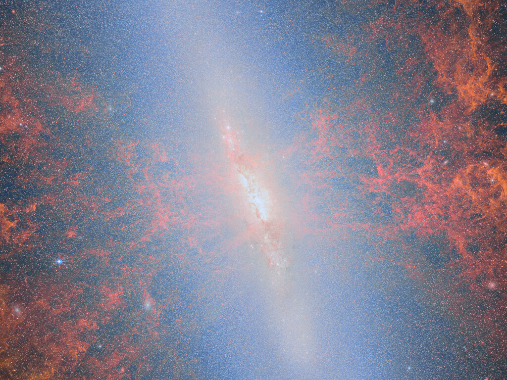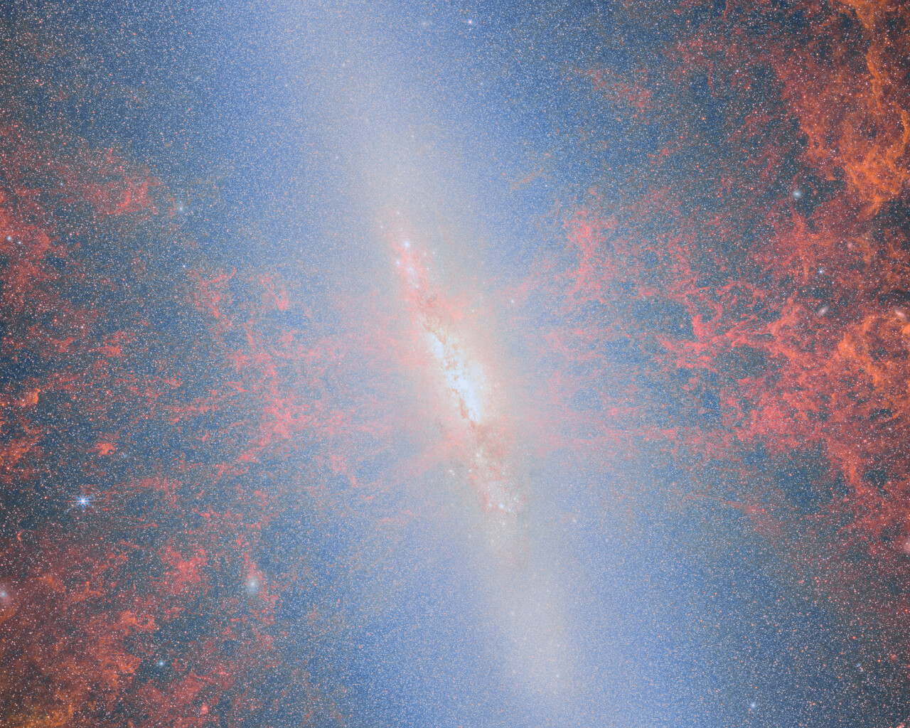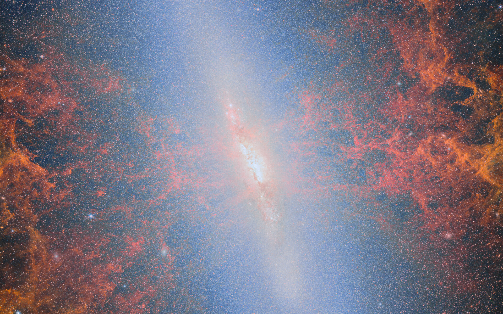 [Image Description: An image of the central part of galaxy M82. The galaxy’s disc extends from the top to the bottom of the image, emitting a blue-white glow. Gas erupts from the brightly shining centre, forming an hourglass-shaped plume of red and orange dust clouds to the left and right. Ridges and cavities in the gas are visible in great detail. Many distant galaxies can be seen in the background, as well as tiny pinprick stars in M82.]