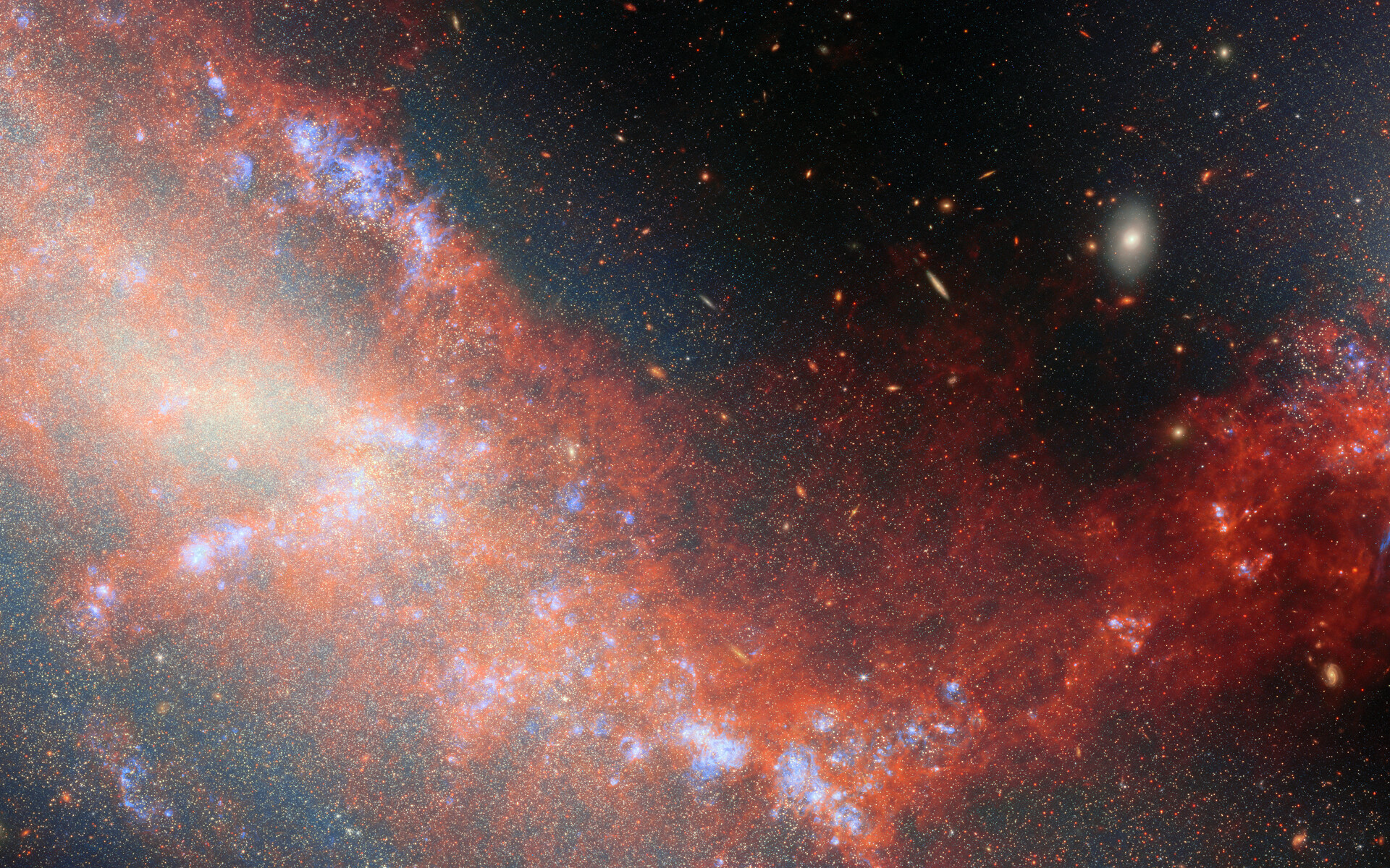 Recently, Webb observed this curious galactic pair as part of the Feedback in Emerging extrAgalactic Star clusTers (FEAST) programme (#1783; PI: A. Adamo). The FEAST programme used Webb’s sensitive infrared eyes to reveal the formation of new stars in different types of nearby galaxies.