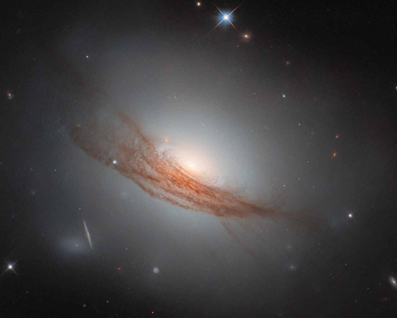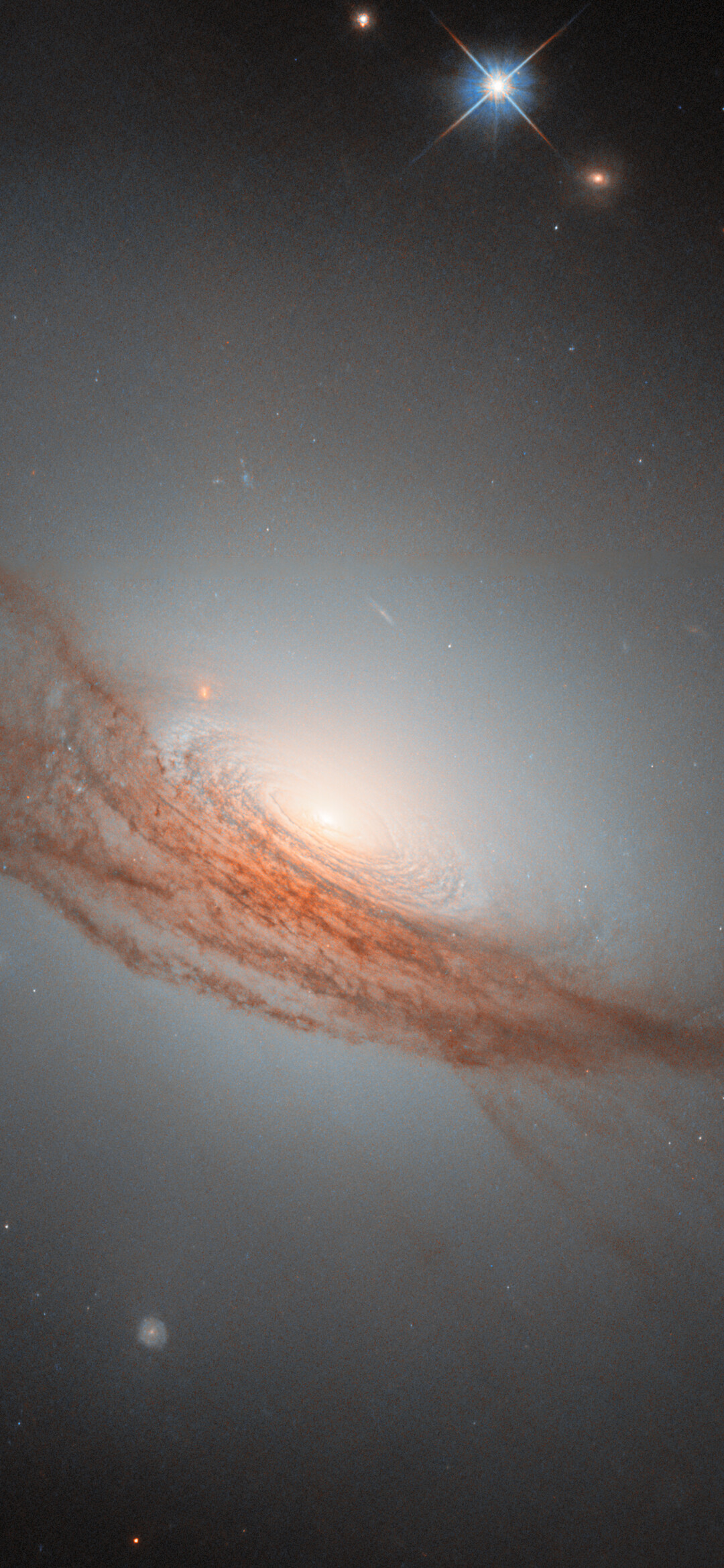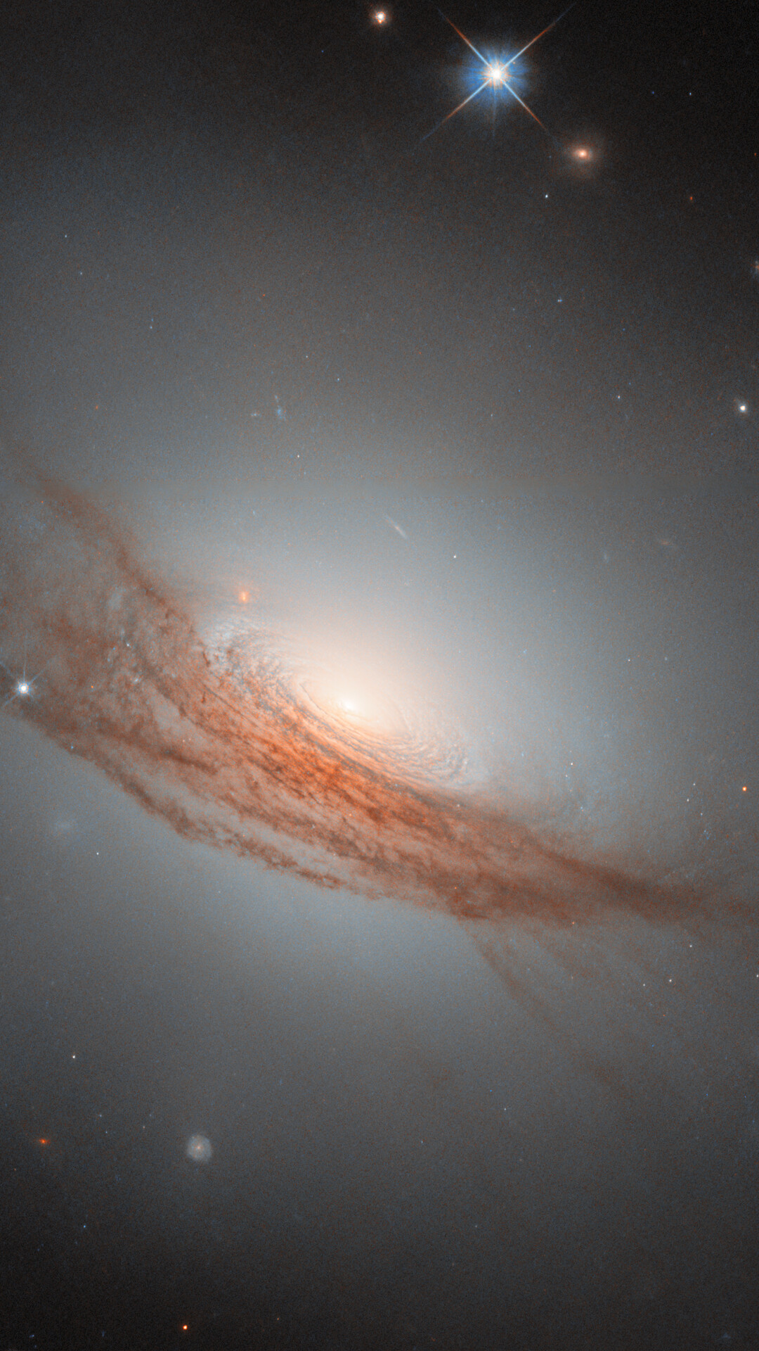 A “lenticular”, meaning “lens-shaped”, galaxy is a type that sits in between the more familiar spiral galaxies and elliptical galaxies. It is also less common than these — partly because when a galaxy has an ambiguous appearance, it can be hard to determine if it is actually a spiral, actually an elliptical galaxy, or something in between. Many of the known lenticular galaxies sport features of both spiral and elliptical galaxies. In this case, NGC 7722 lacks the defined arms of a spiral galaxy, while it has an extended, glowing halo and a bright bulge in the centre similar to an elliptical galaxy. Unlike elliptical galaxies, it has a visible disc — concentric rings swirl around its bright nucleus. Its most prominent feature, however, is undoubtedly the long lanes of dark red dust coiling around the outer disc and halo.