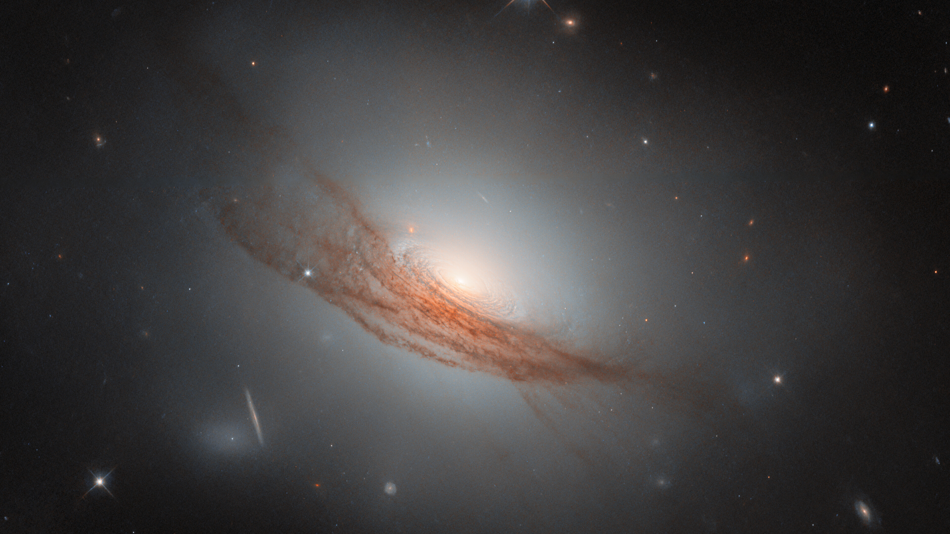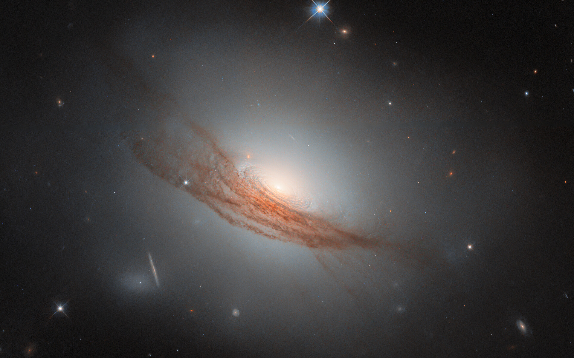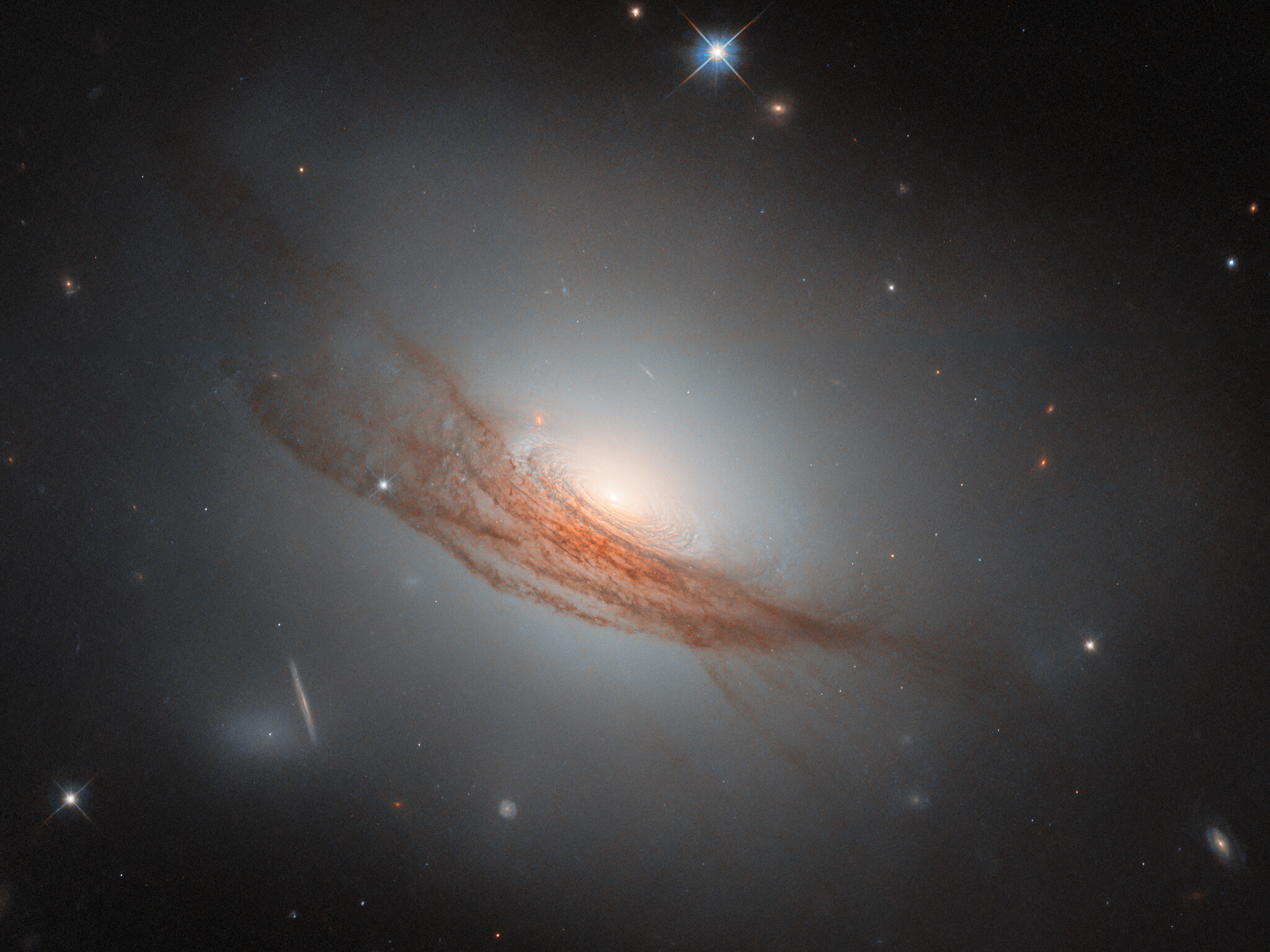 A “lenticular”, meaning “lens-shaped”, galaxy is a type that sits in between the more familiar spiral galaxies and elliptical galaxies. It is also less common than these — partly because when a galaxy has an ambiguous appearance, it can be hard to determine if it is actually a spiral, actually an elliptical galaxy, or something in between. Many of the known lenticular galaxies sport features of both spiral and elliptical galaxies. In this case, NGC 7722 lacks the defined arms of a spiral galaxy, while it has an extended, glowing halo and a bright bulge in the centre similar to an elliptical galaxy. Unlike elliptical galaxies, it has a visible disc — concentric rings swirl around its bright nucleus. Its most prominent feature, however, is undoubtedly the long lanes of dark red dust coiling around the outer disc and halo.