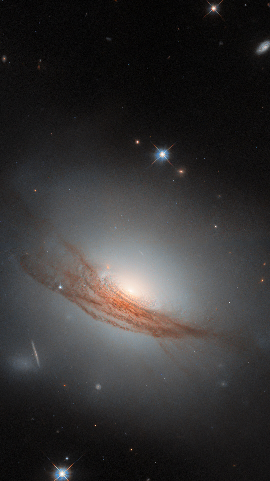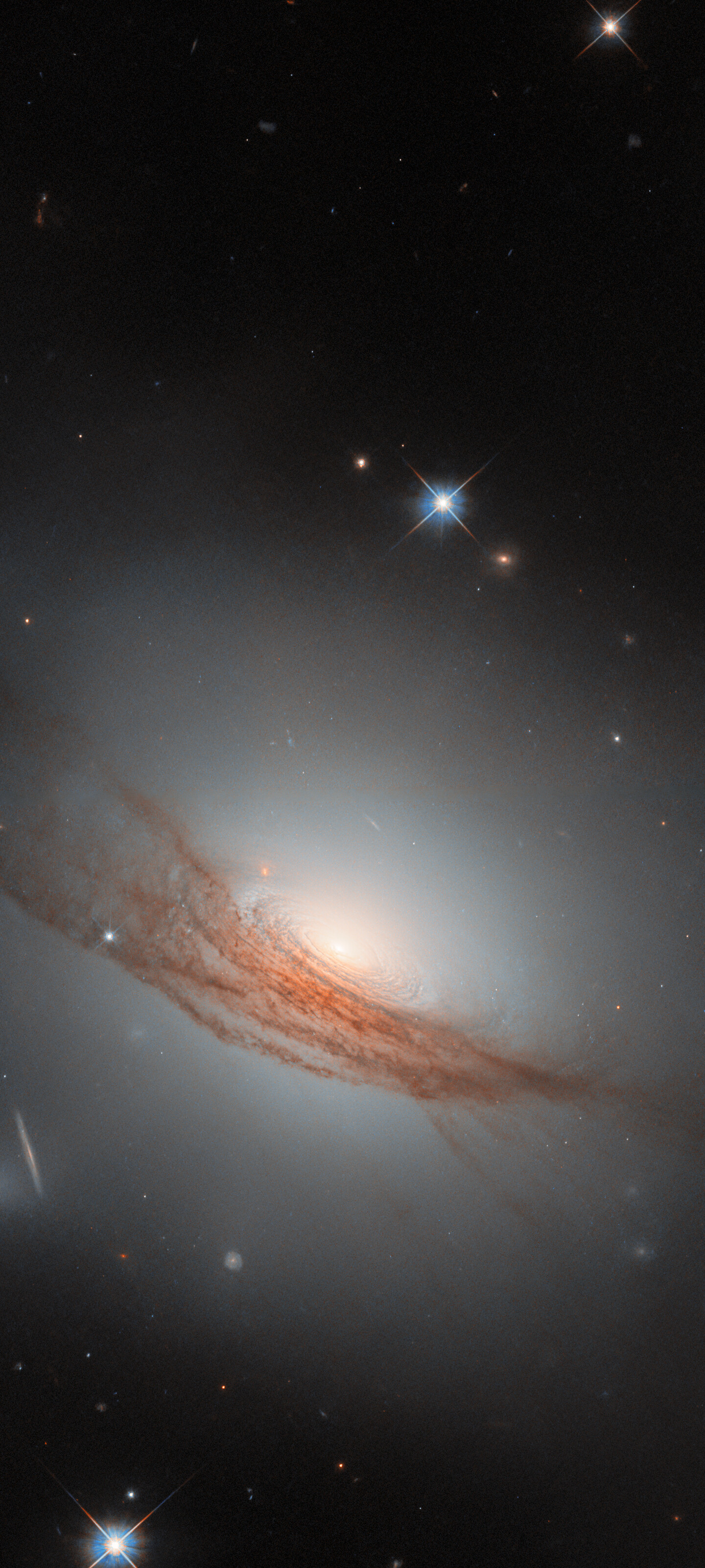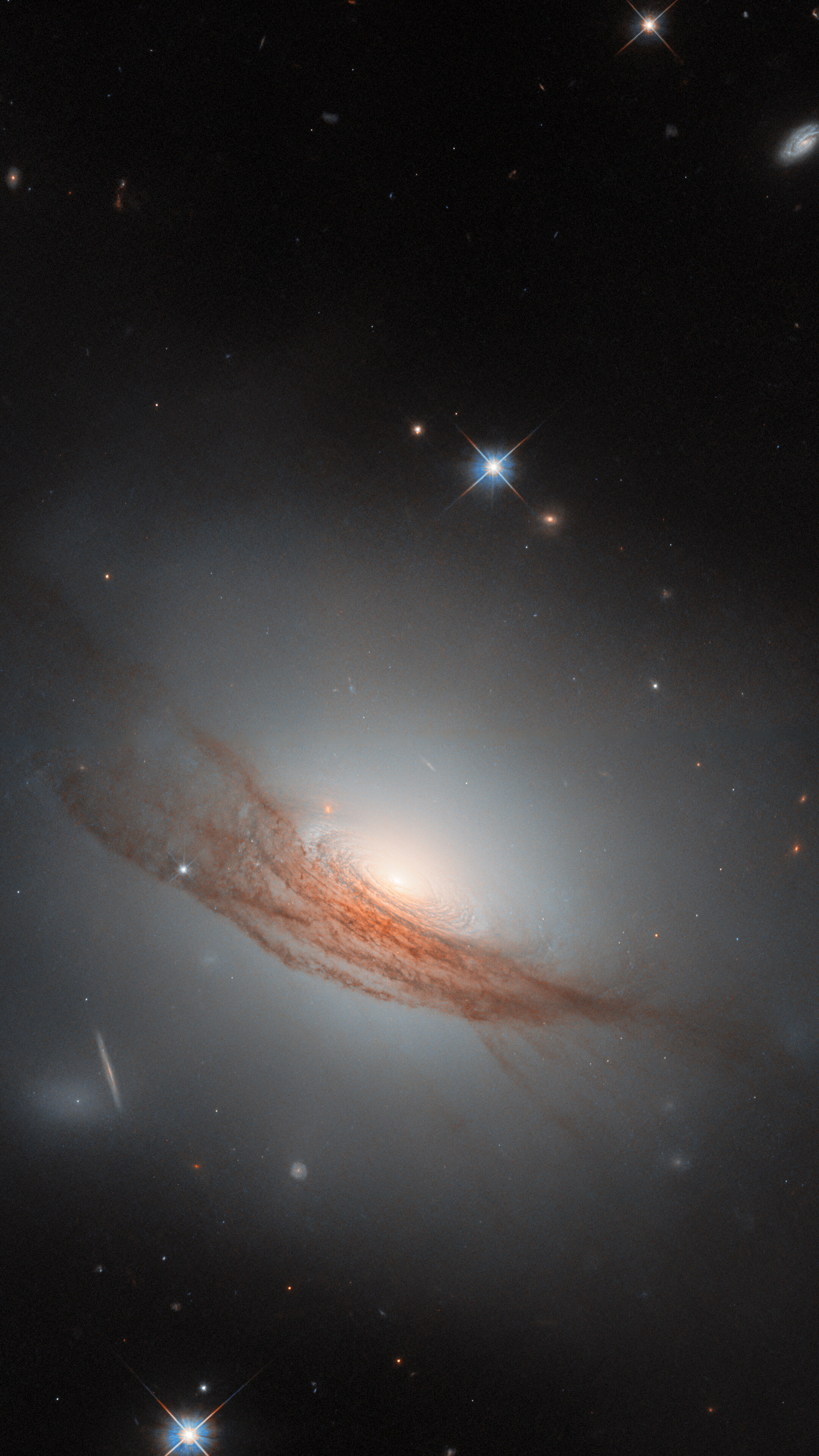 A “lenticular”, meaning “lens-shaped”, galaxy is a type that sits in between the more familiar spiral galaxies and elliptical galaxies. It is also less common than these — partly because when a galaxy has an ambiguous appearance, it can be hard to determine if it is actually a spiral, actually an elliptical galaxy, or something in between. Many of the known lenticular galaxies sport features of both spiral and elliptical galaxies. In this case, NGC 7722 lacks the defined arms of a spiral galaxy, while it has an extended, glowing halo and a bright bulge in the centre similar to an elliptical galaxy. Unlike elliptical galaxies, it has a visible disc — concentric rings swirl around its bright nucleus. Its most prominent feature, however, is undoubtedly the long lanes of dark red dust coiling around the outer disc and halo.