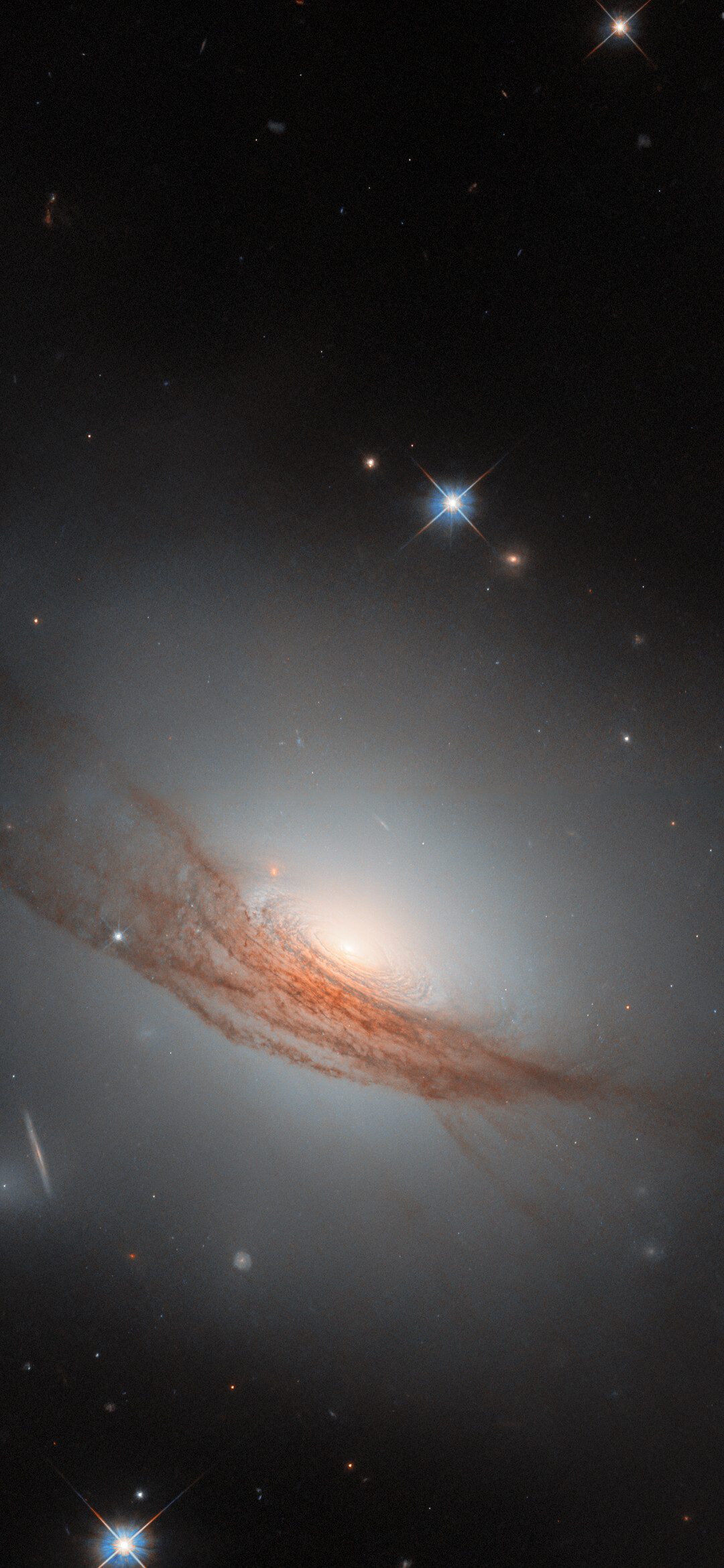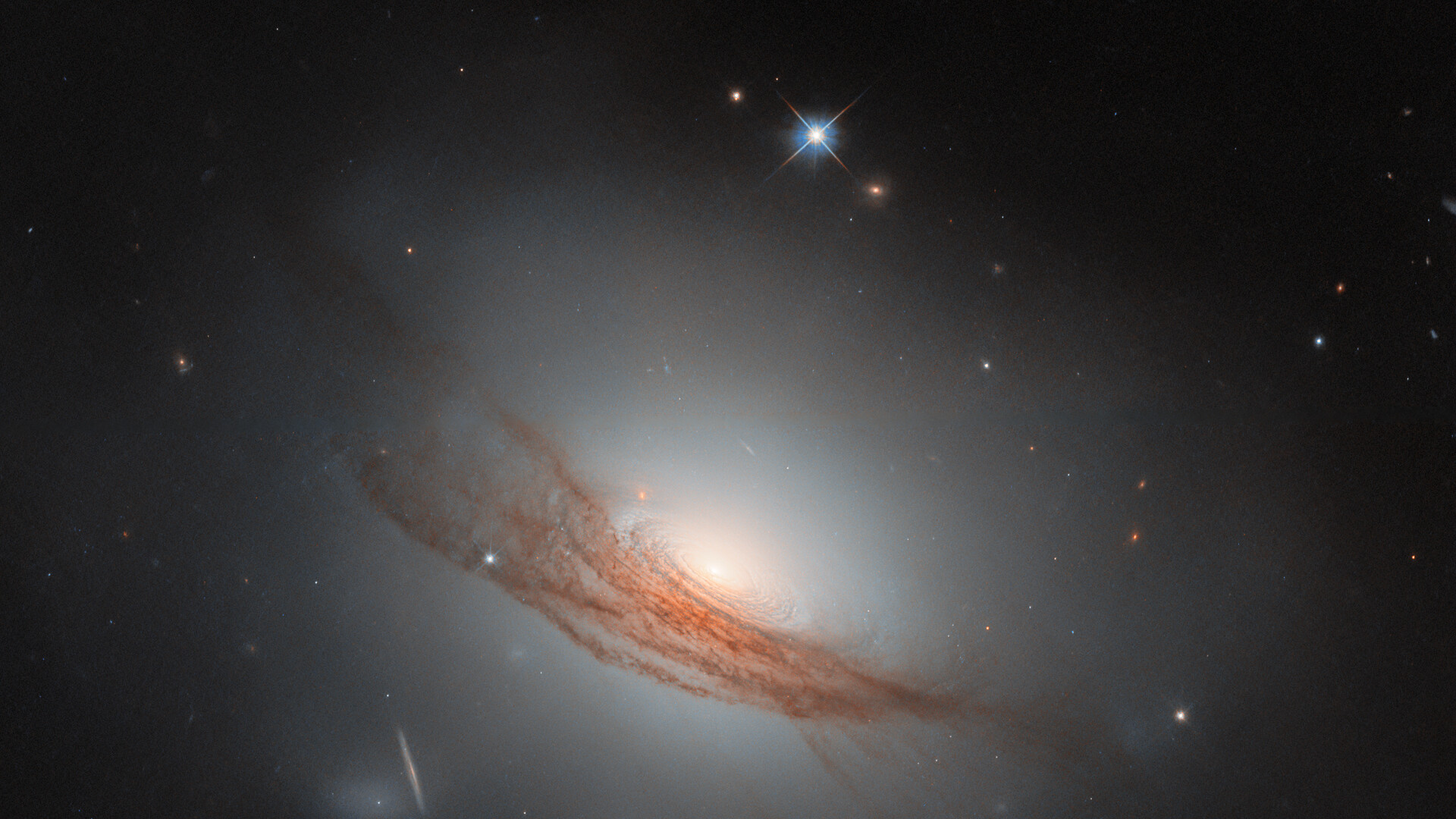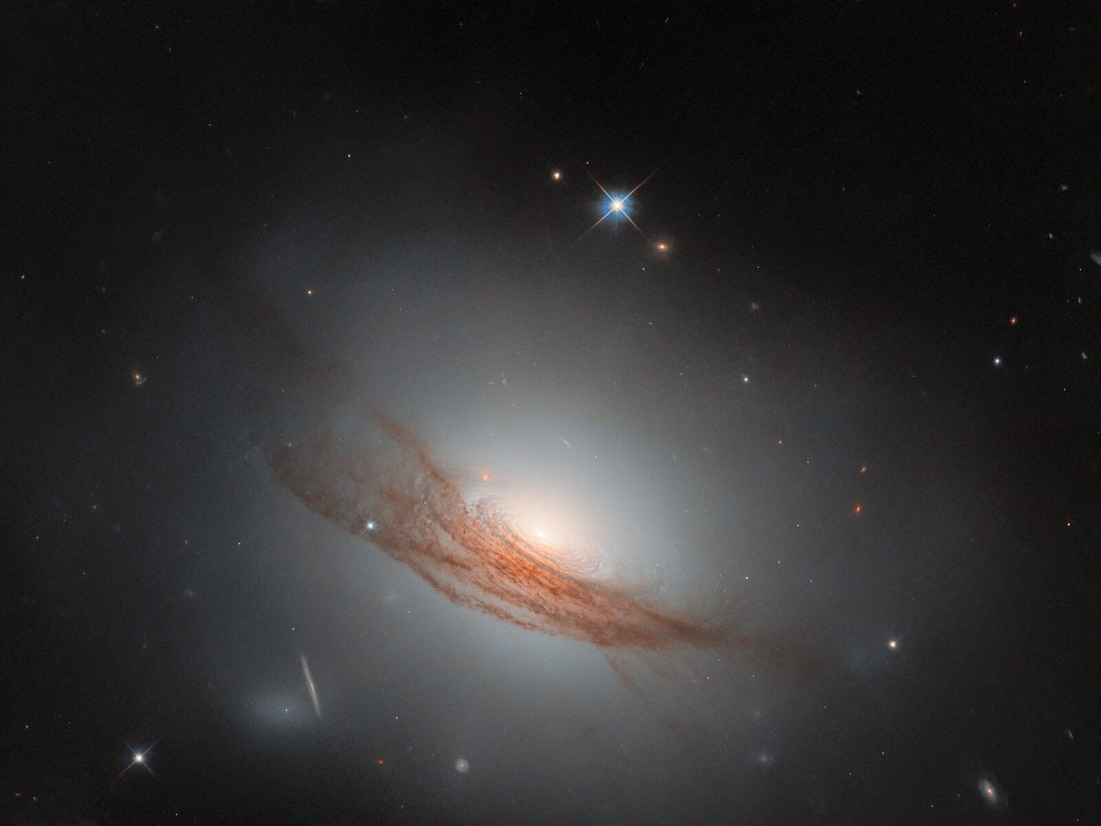 A “lenticular”, meaning “lens-shaped”, galaxy is a type that sits in between the more familiar spiral galaxies and elliptical galaxies. It is also less common than these — partly because when a galaxy has an ambiguous appearance, it can be hard to determine if it is actually a spiral, actually an elliptical galaxy, or something in between. Many of the known lenticular galaxies sport features of both spiral and elliptical galaxies. In this case, NGC 7722 lacks the defined arms of a spiral galaxy, while it has an extended, glowing halo and a bright bulge in the centre similar to an elliptical galaxy. Unlike elliptical galaxies, it has a visible disc — concentric rings swirl around its bright nucleus. Its most prominent feature, however, is undoubtedly the long lanes of dark red dust coiling around the outer disc and halo.