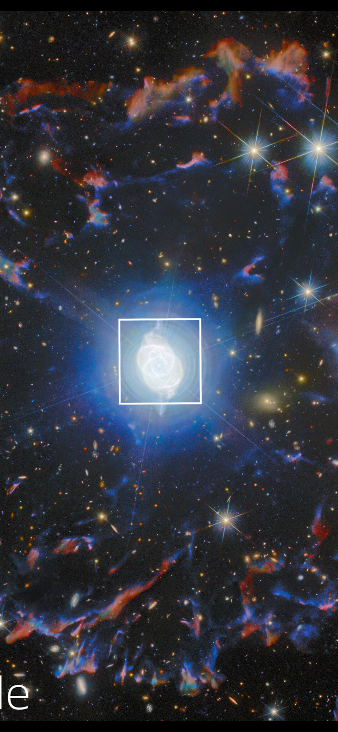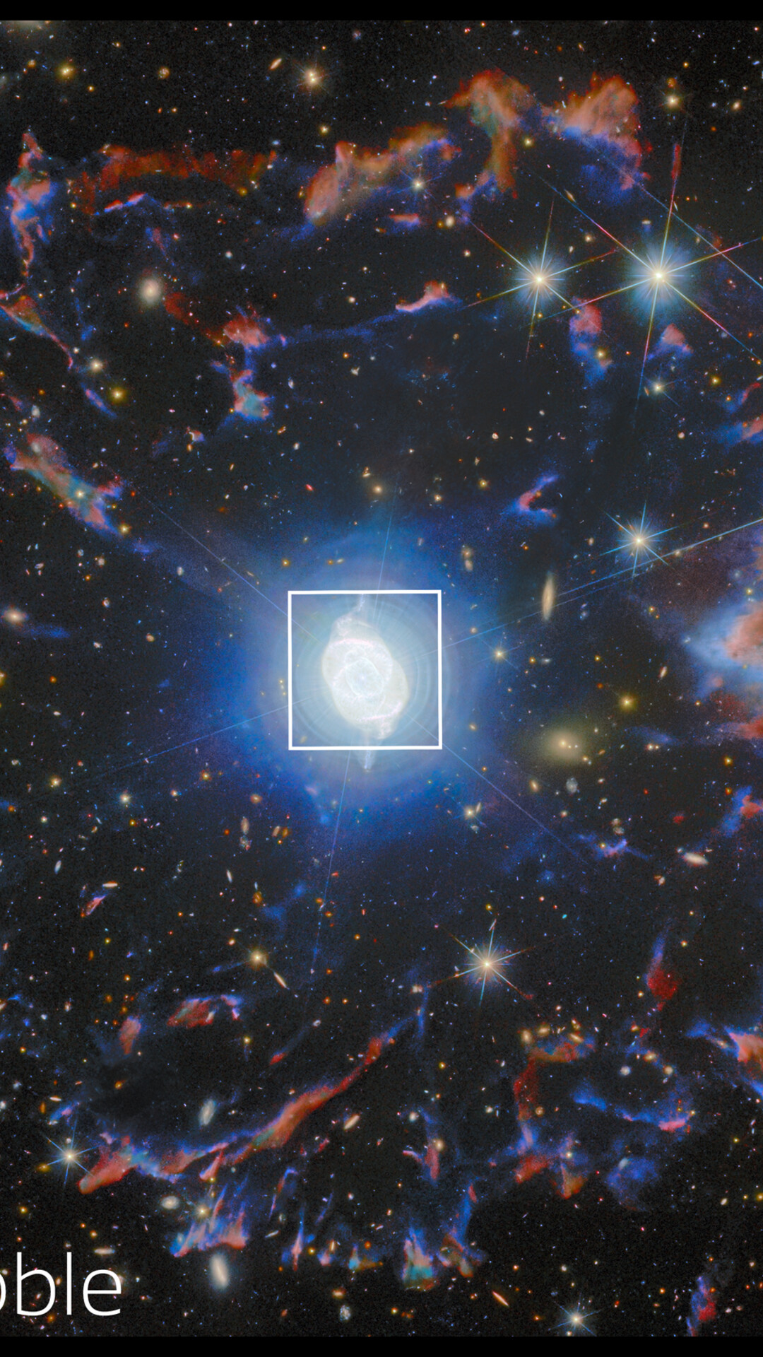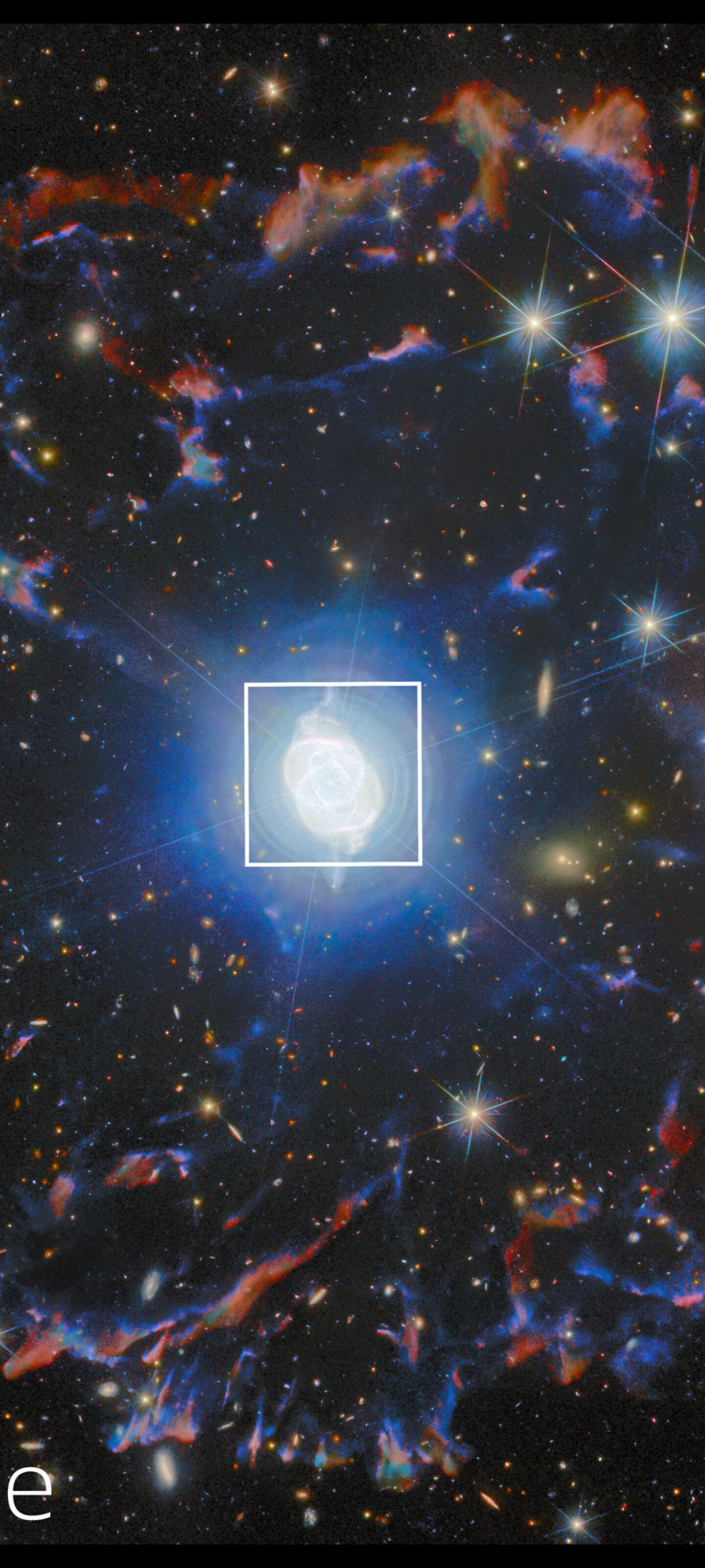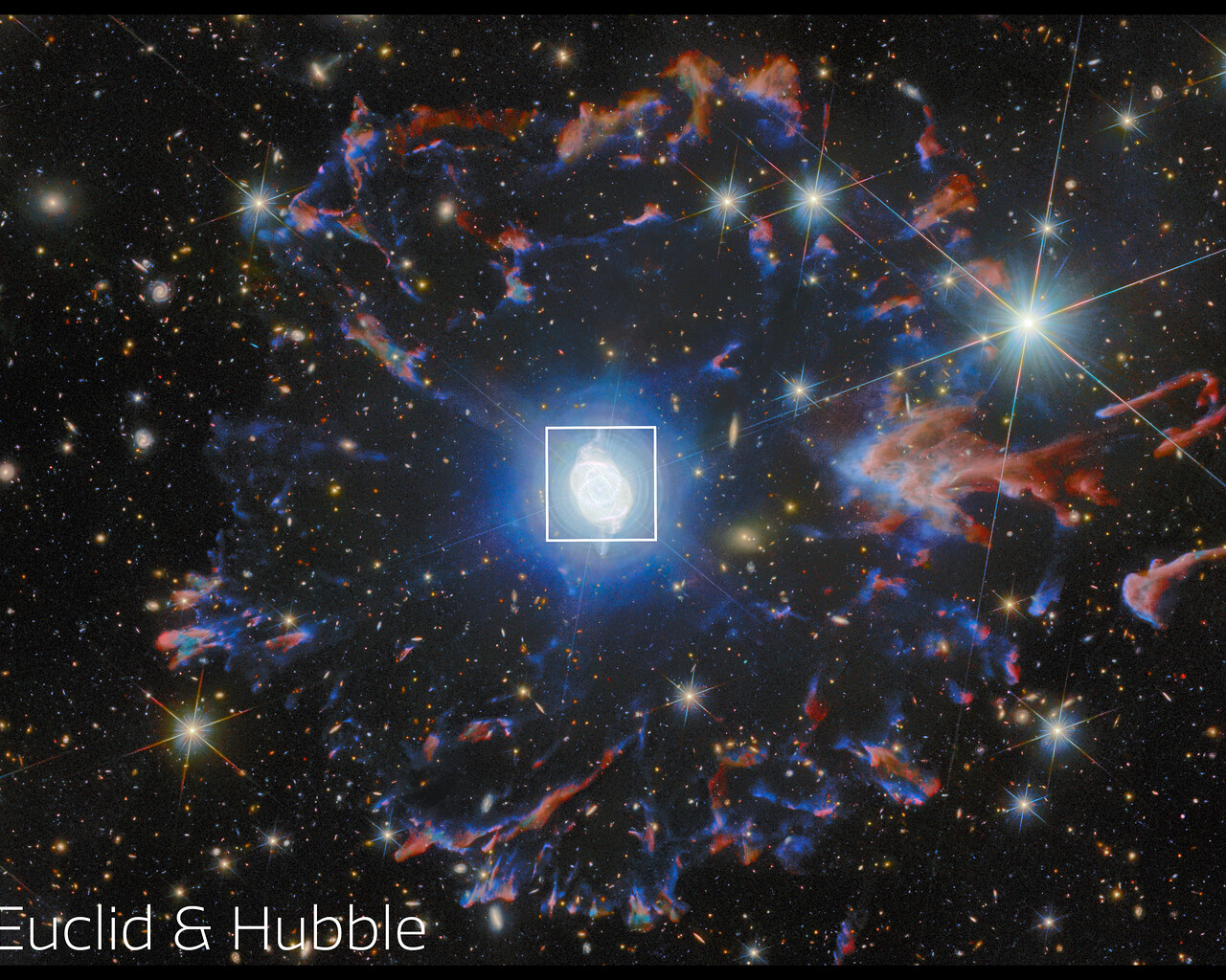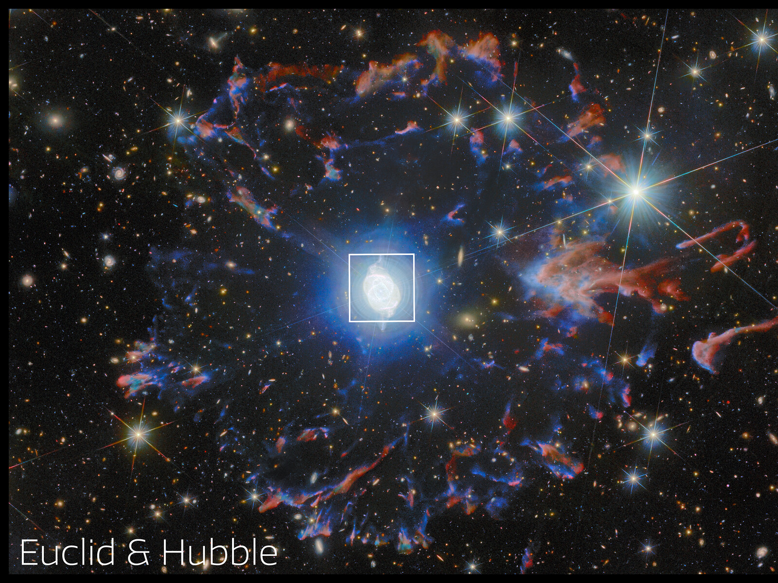 [Image Description: Two images of a planetary nebula in space. The image to the left, labelled “Euclid & Hubble”, shows the whole nebula and its surroundings. A star in the very centre is surrounded by white bubbles and loops of gas, all shining with a powerful blue light. Farther away a broken ring of red and blue gas clouds surrounds the nebula. The background shows many stars and distant galaxies. A white box indicates the centre of the nebula and this region is the image to the right, labelled “Hubble”. It shows the multi-layered bubbles, pointed jets and circular shells of gas that make up the nebula, as well as the central star, in greater detail.]