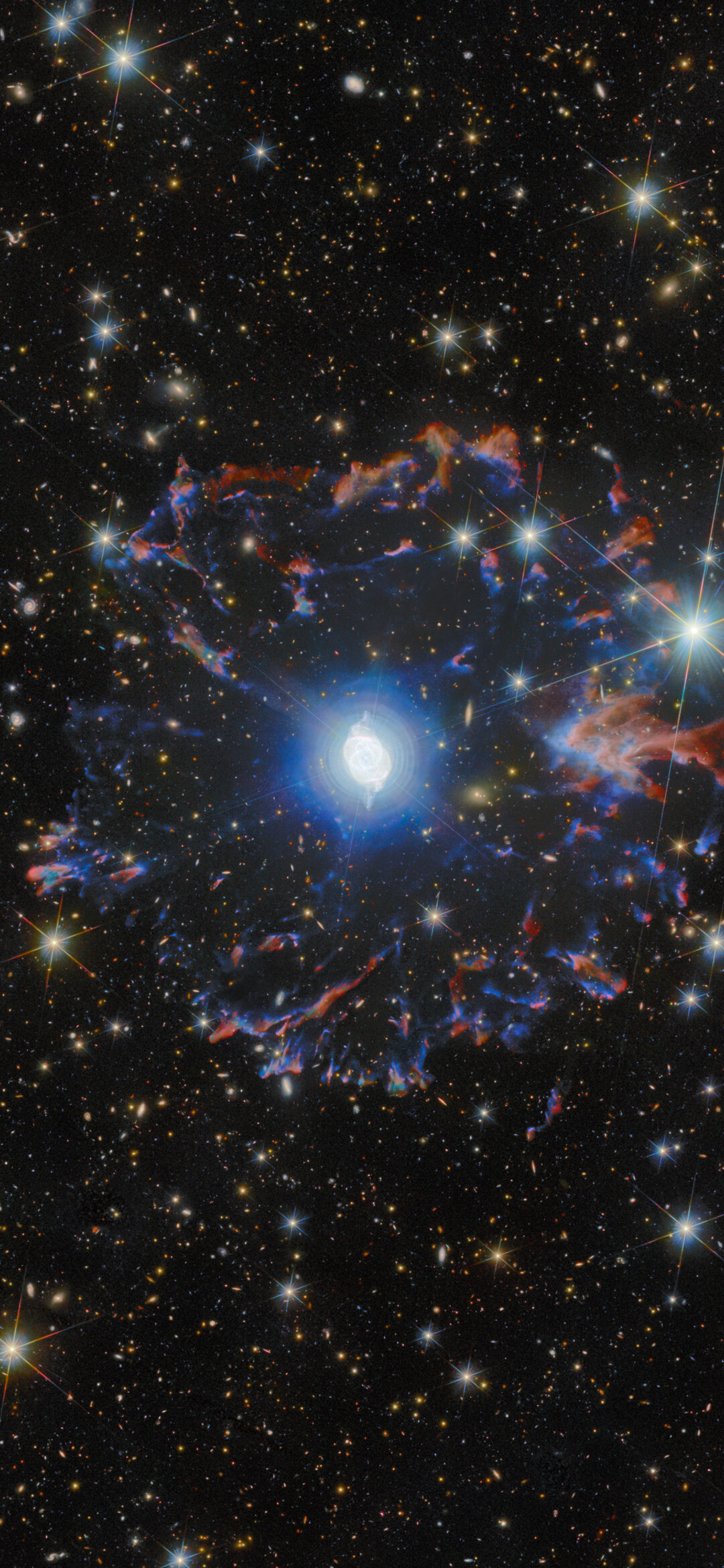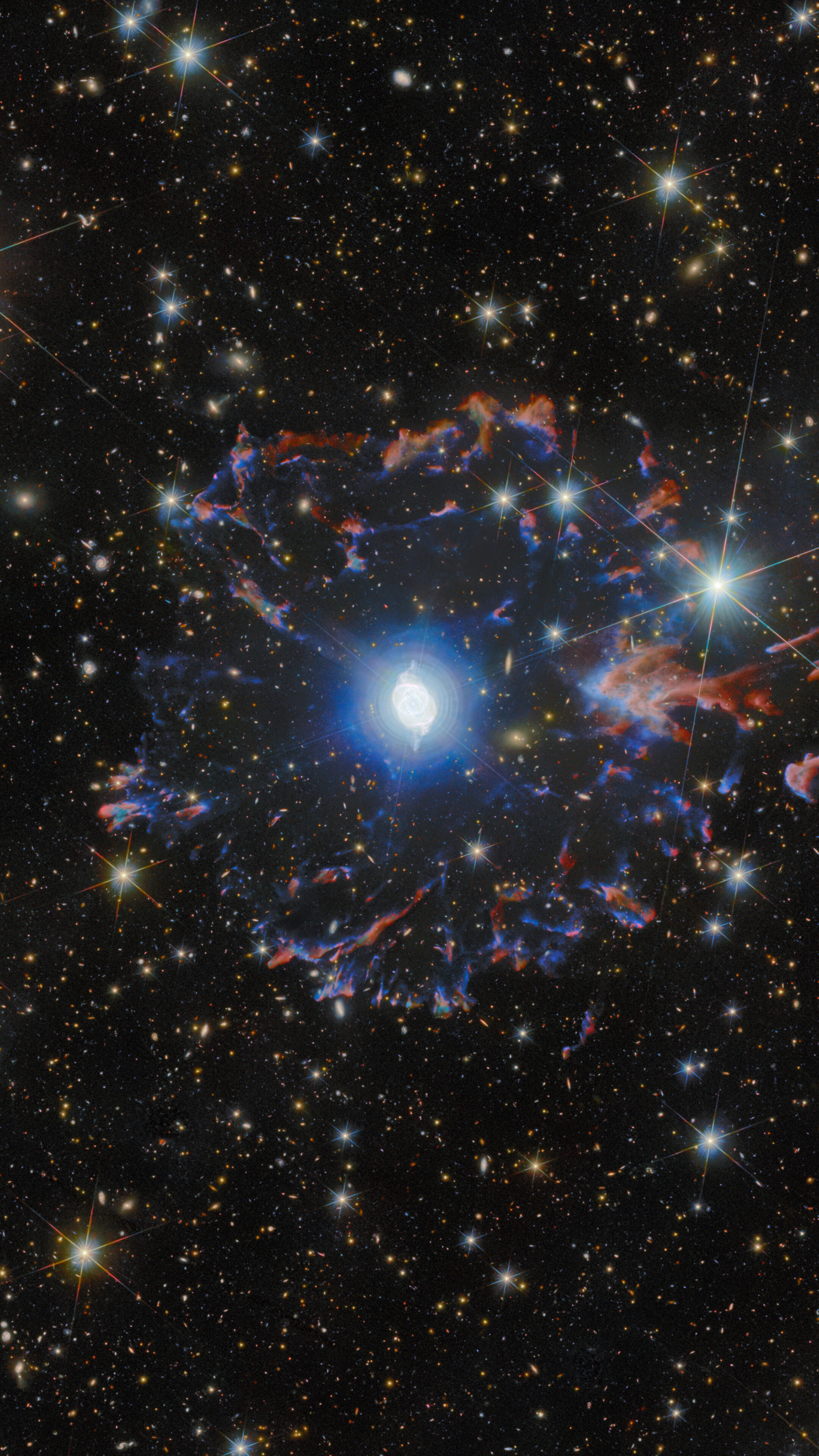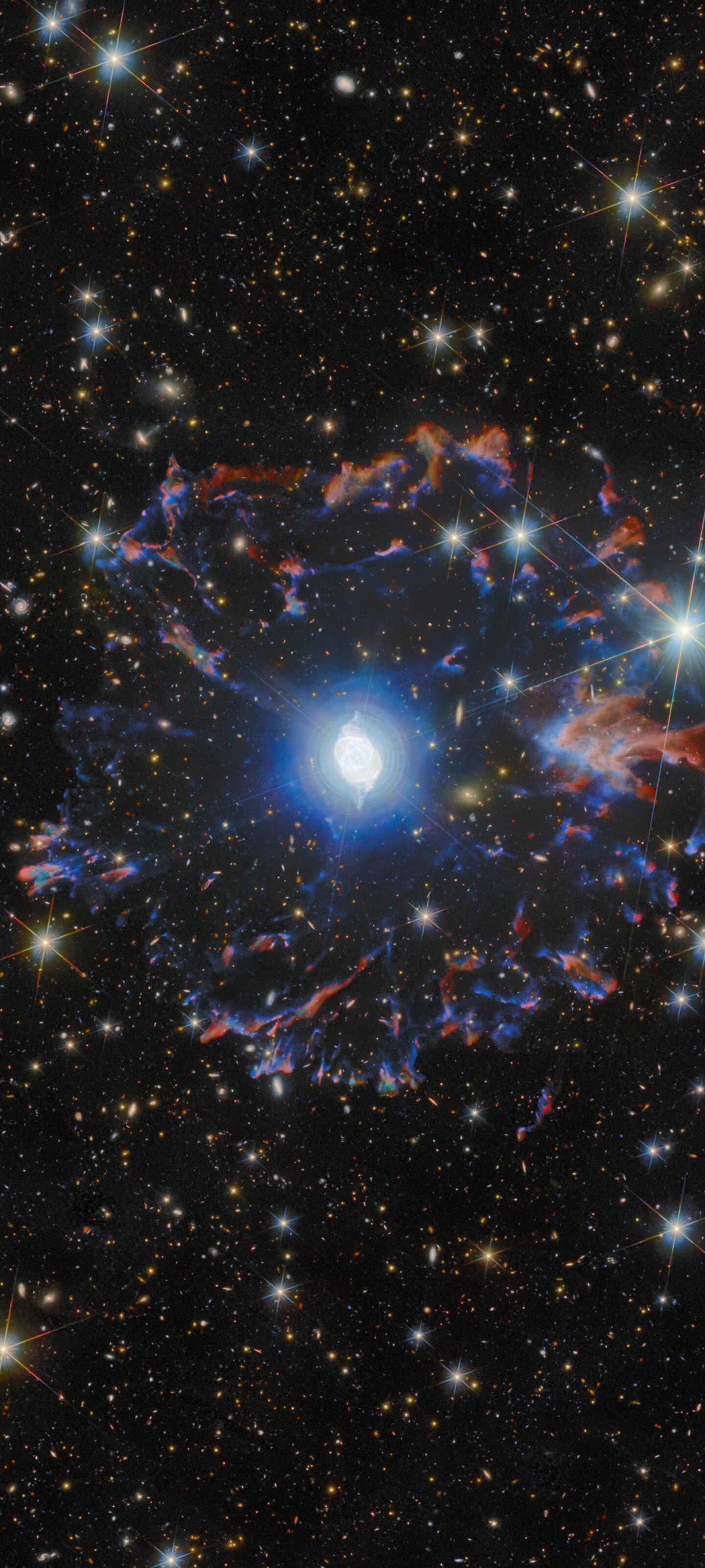 In Euclid’s wide, near-infrared and visible light view, the arcs and filaments of the nebula’s bright central region are situated within a halo of colourful fragments of gas zooming away from the star. This ring was ejected from the star at an earlier stage, before the main nebula at the centre formed. Hubble captures the very core of the billowing gas with high-resolution visible-light images, adding extra detail in the centre of this image. The whole nebula stands out against a backdrop teeming with distant galaxies, demonstrating how local astrophysical beauty and the farthest reaches of the cosmos can be seen together in modern astronomical surveys.
