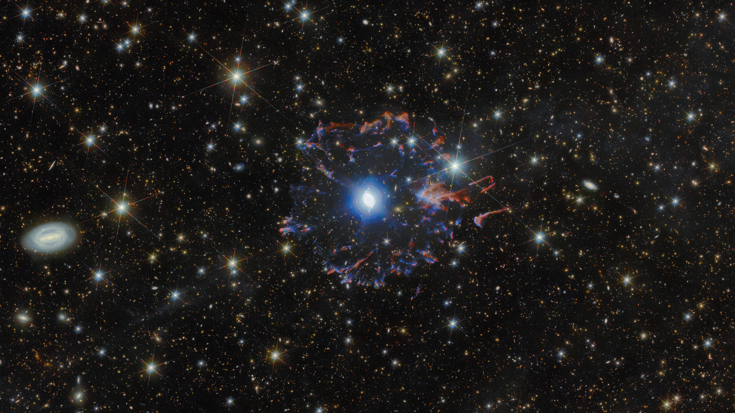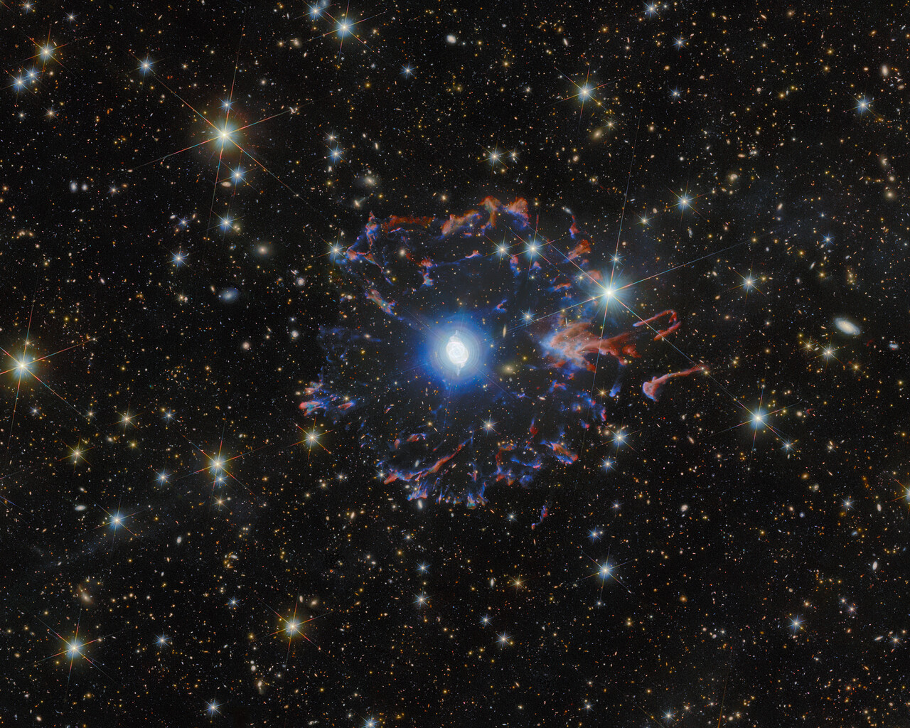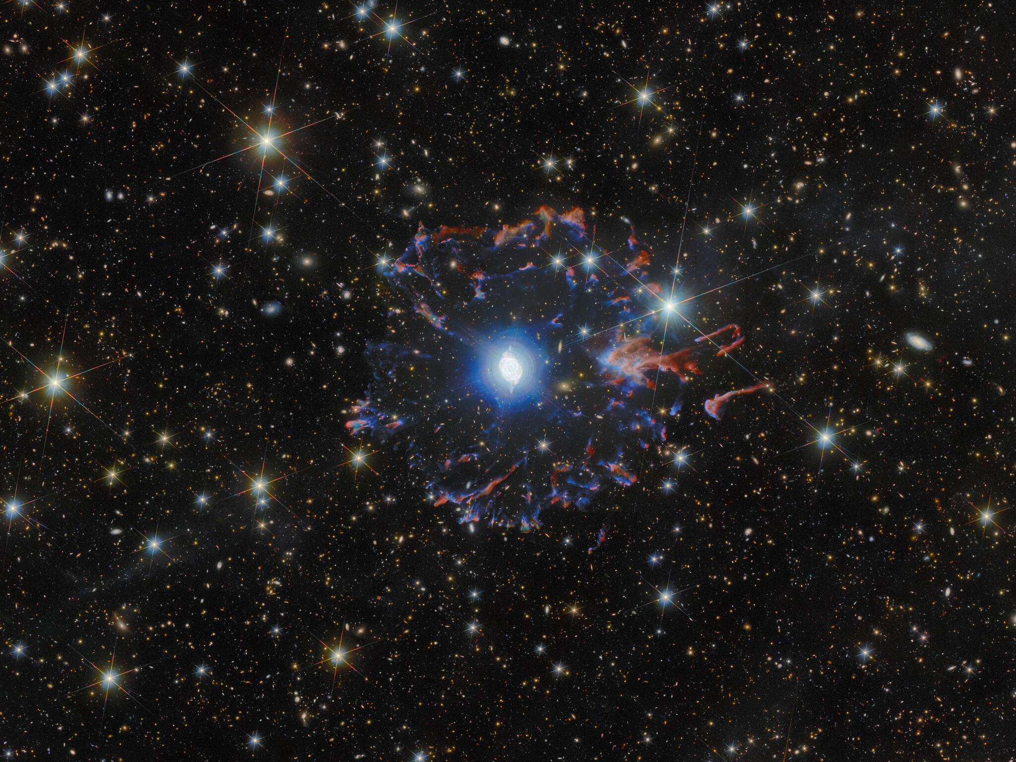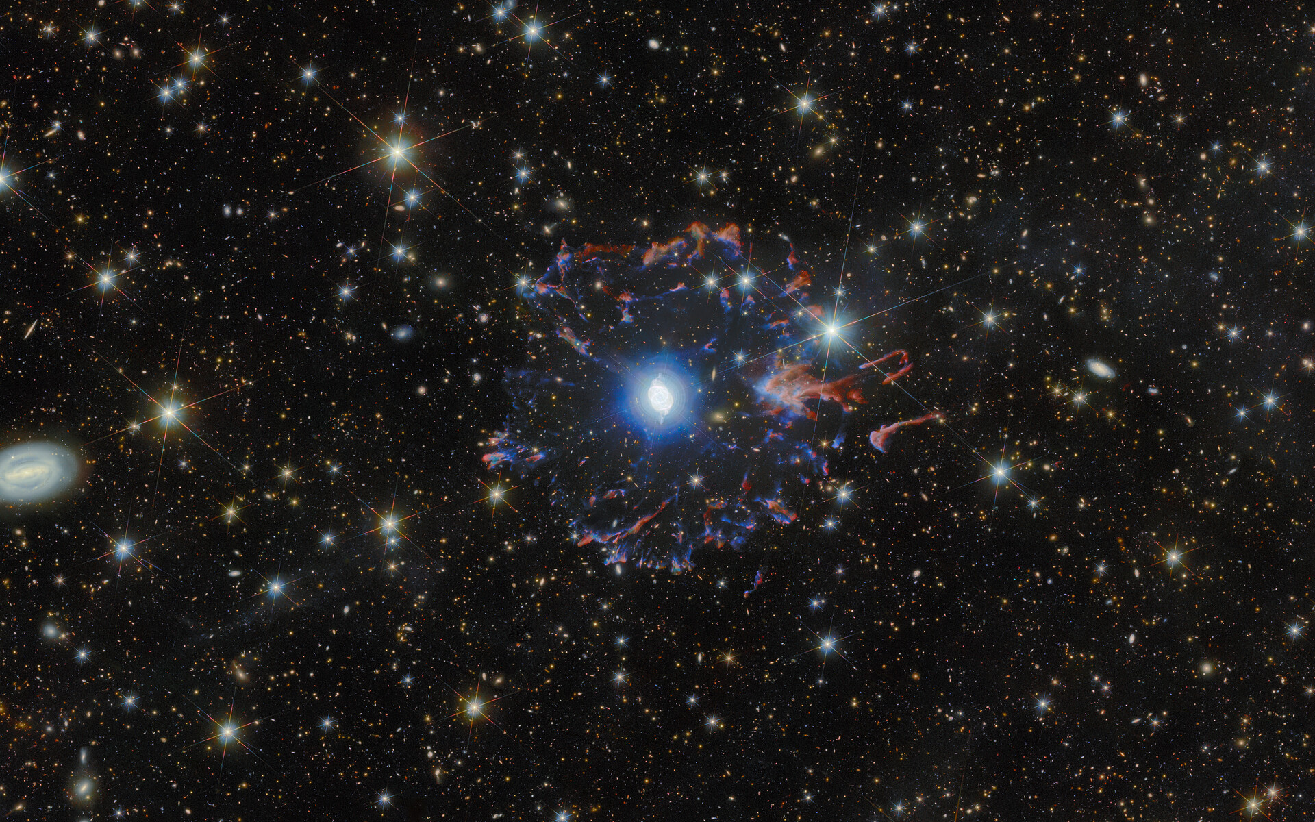 In Euclid’s wide, near-infrared and visible light view, the arcs and filaments of the nebula’s bright central region are situated within a halo of colourful fragments of gas zooming away from the star. This ring was ejected from the star at an earlier stage, before the main nebula at the centre formed. Hubble captures the very core of the billowing gas with high-resolution visible-light images, adding extra detail in the centre of this image. The whole nebula stands out against a backdrop teeming with distant galaxies, demonstrating how local astrophysical beauty and the farthest reaches of the cosmos can be seen together in modern astronomical surveys.