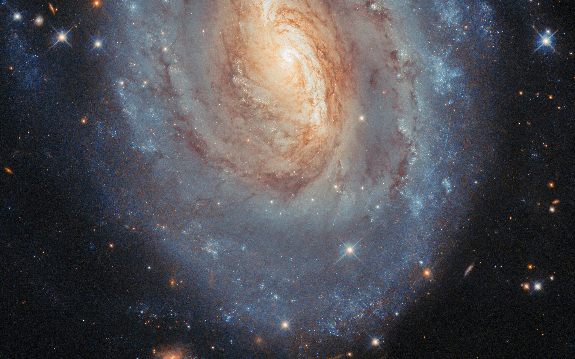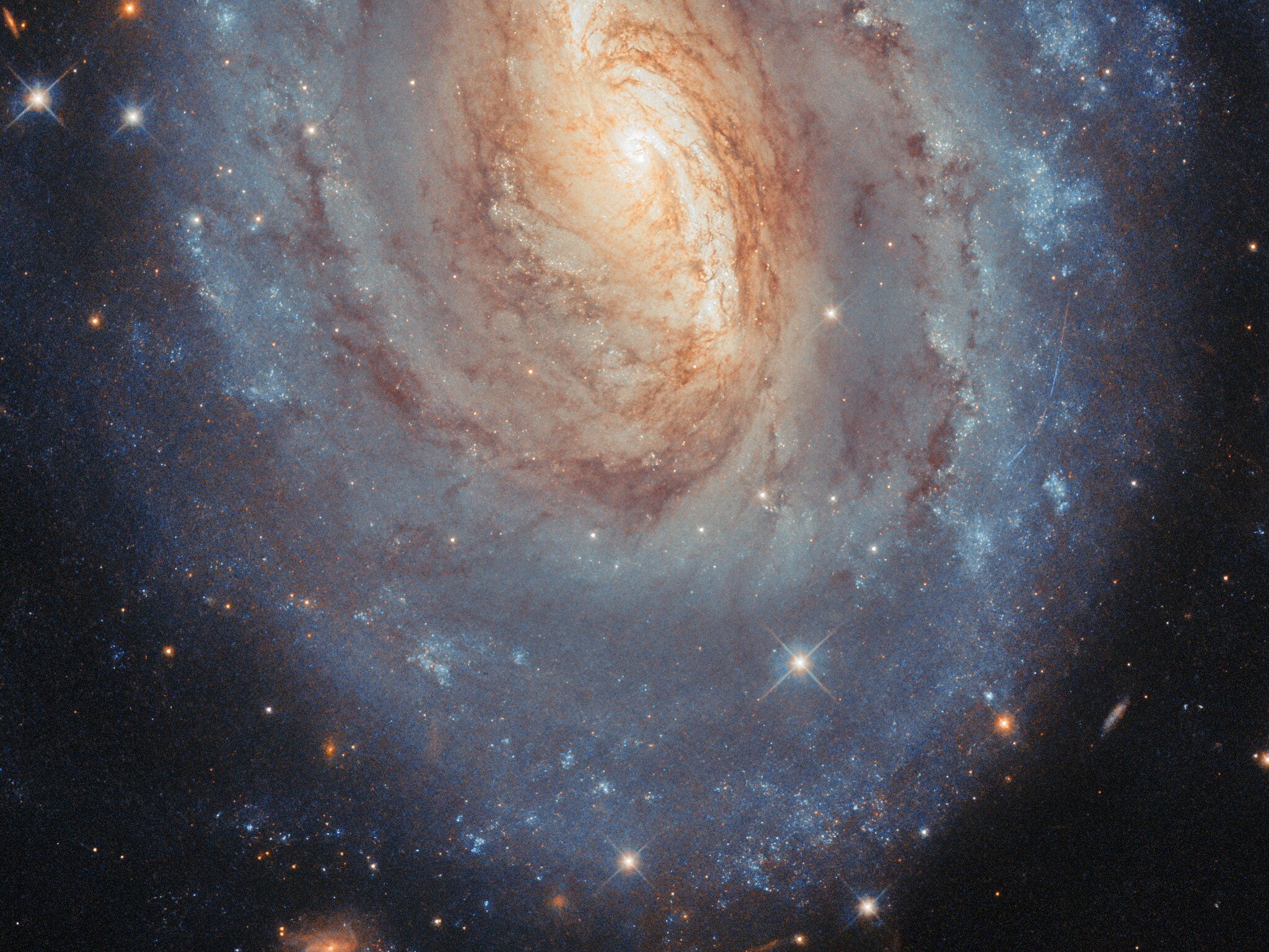 This galaxy has a glowing yellow centre and glittering blue outskirts. The colours reflect differences in the average ages, masses and temperatures of the galaxy’s stars. In the heart of the galaxy, the stars tend to be older and smaller. Less massive stars are cooler than more massive stars, and somewhat counterintuitively, cooler stars are redder, while hotter stars are bluer. Farther out along NGC 6000’s spiral arms, brilliant star clusters host young, massive stars that appear distinctly blue.