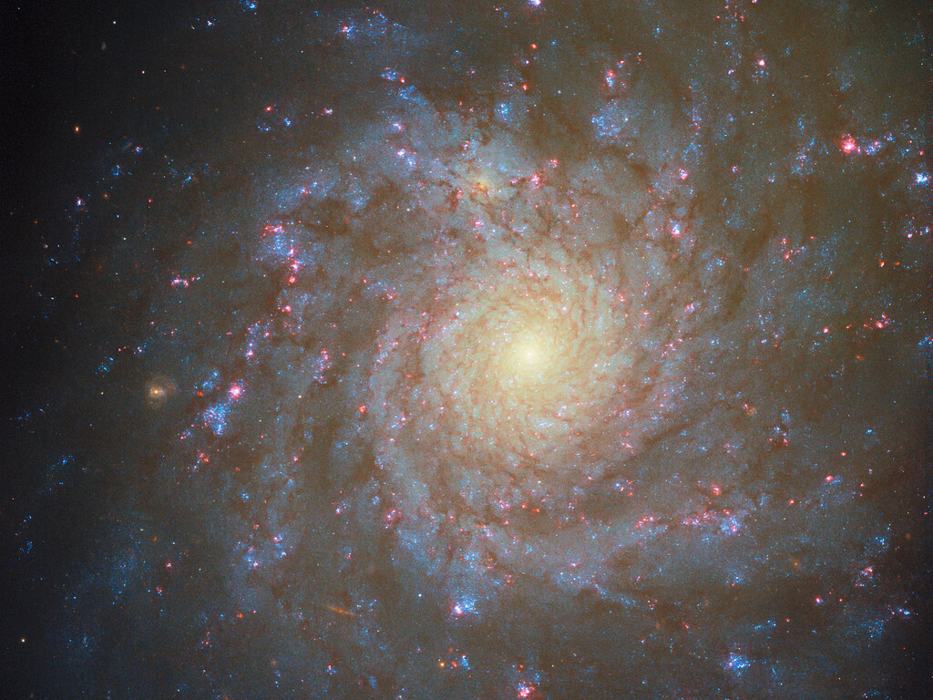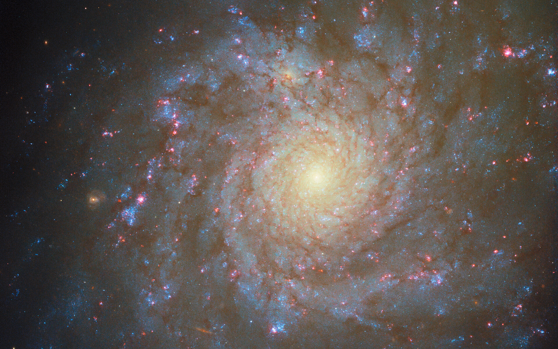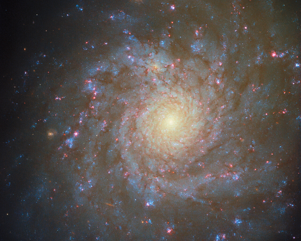 The galaxy’s dusty spiral arms are dotted with brilliant pink nebulae that contain massive young stars. Though the star-forming clouds that are seen here are heated to roughly 10 000 degrees by searing ultraviolet light from the young stars at their cores, stars get their start in much chillier environments. The sites of star birth are giant molecular clouds tens to hundreds of light-years across, in which the temperature hovers just a few tens of degrees above absolute zero.