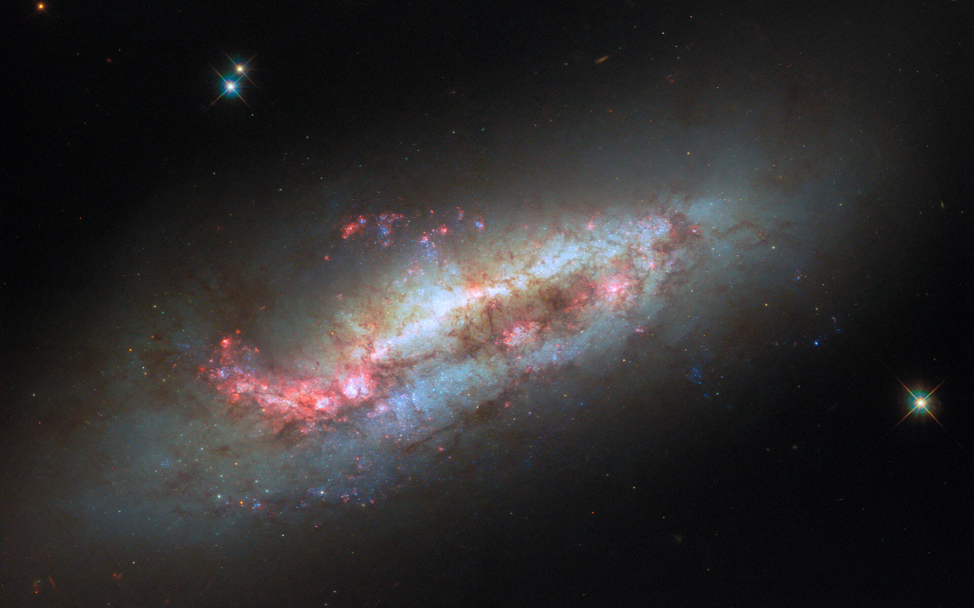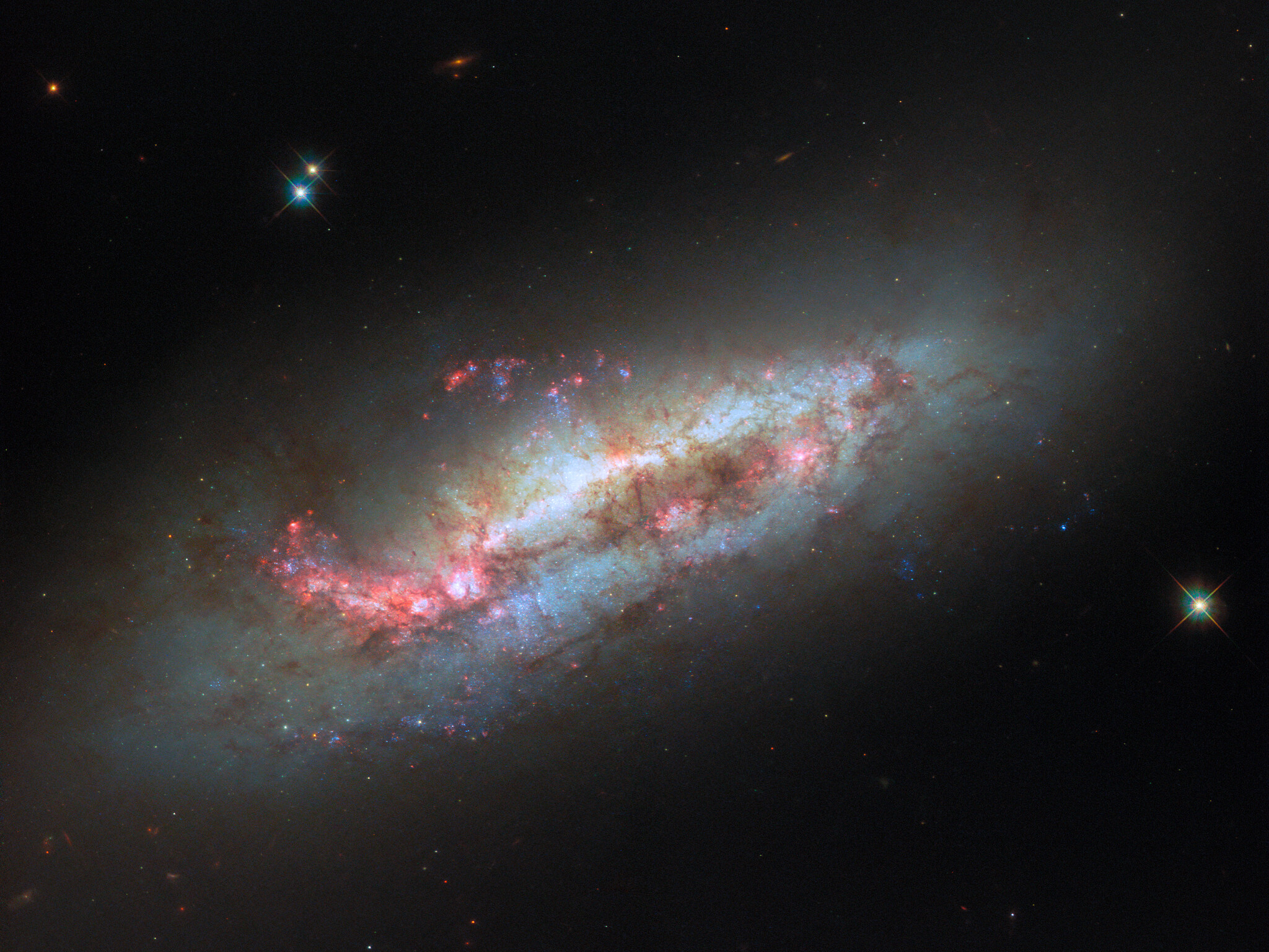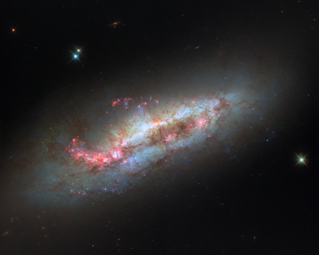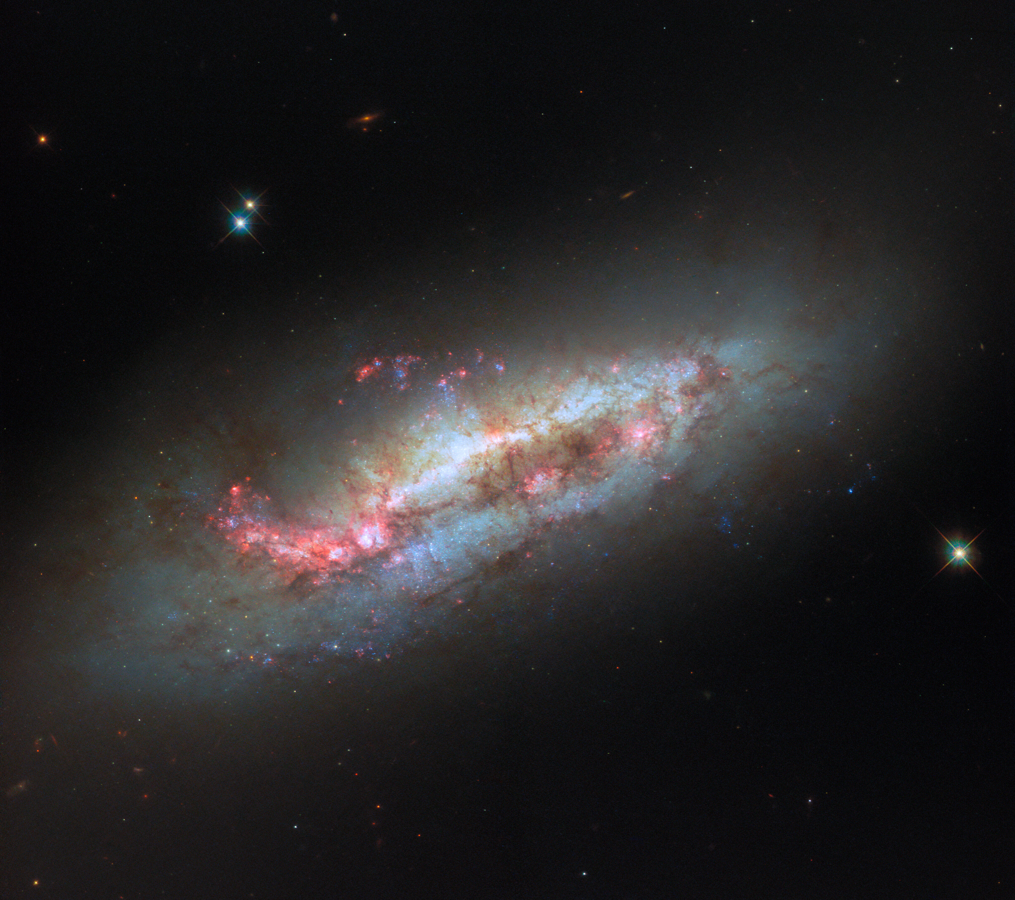 [Image Description: A spiral galaxy, tilted away so that it is seen mostly from the edge. The disc of the galaxy glows blue from its centre, due to younger stars in the spiral arms. There are large and small patches of gas, glowing in red and pink colours, where new stars are forming. Webs of dark dust are spread over the disc. The glow of the disc fades into a dark background, with a couple of stars.]