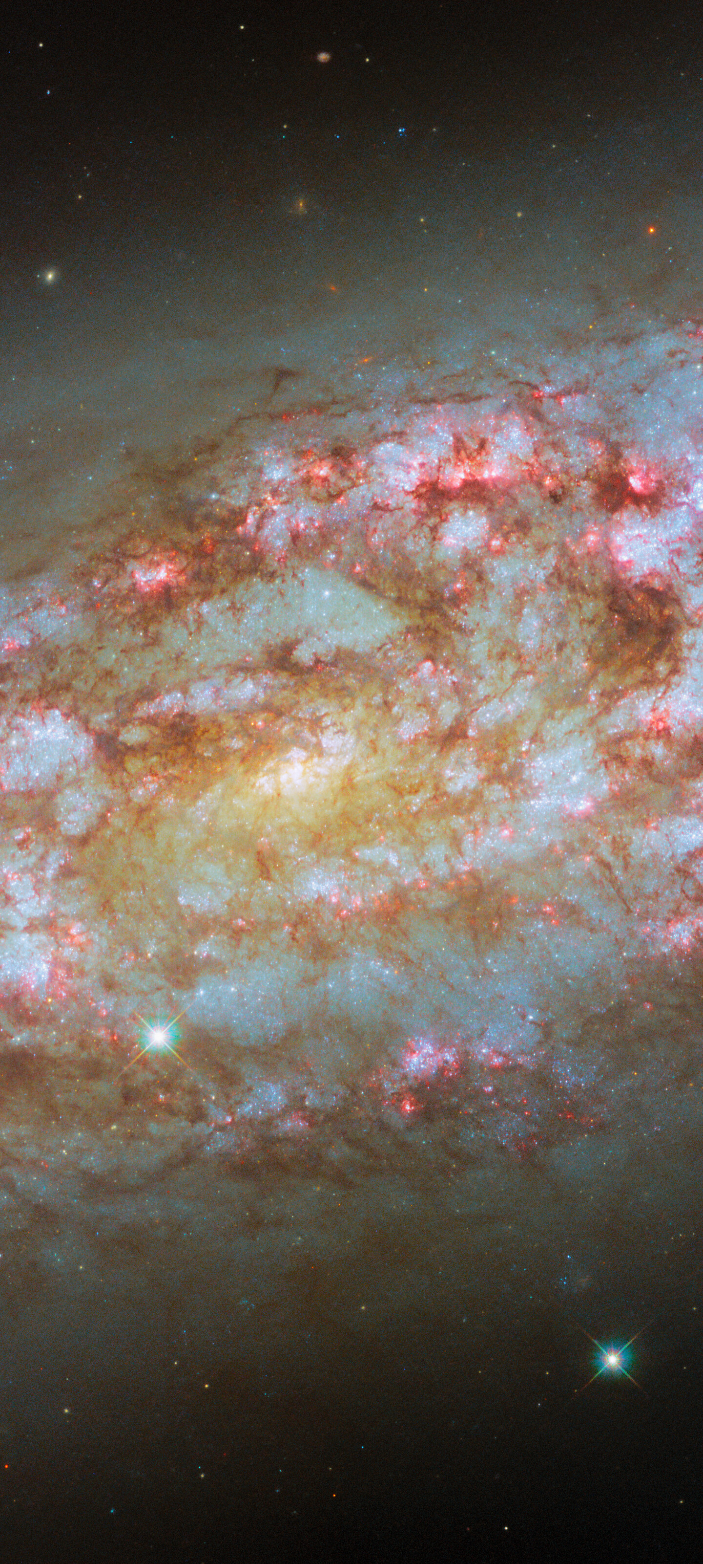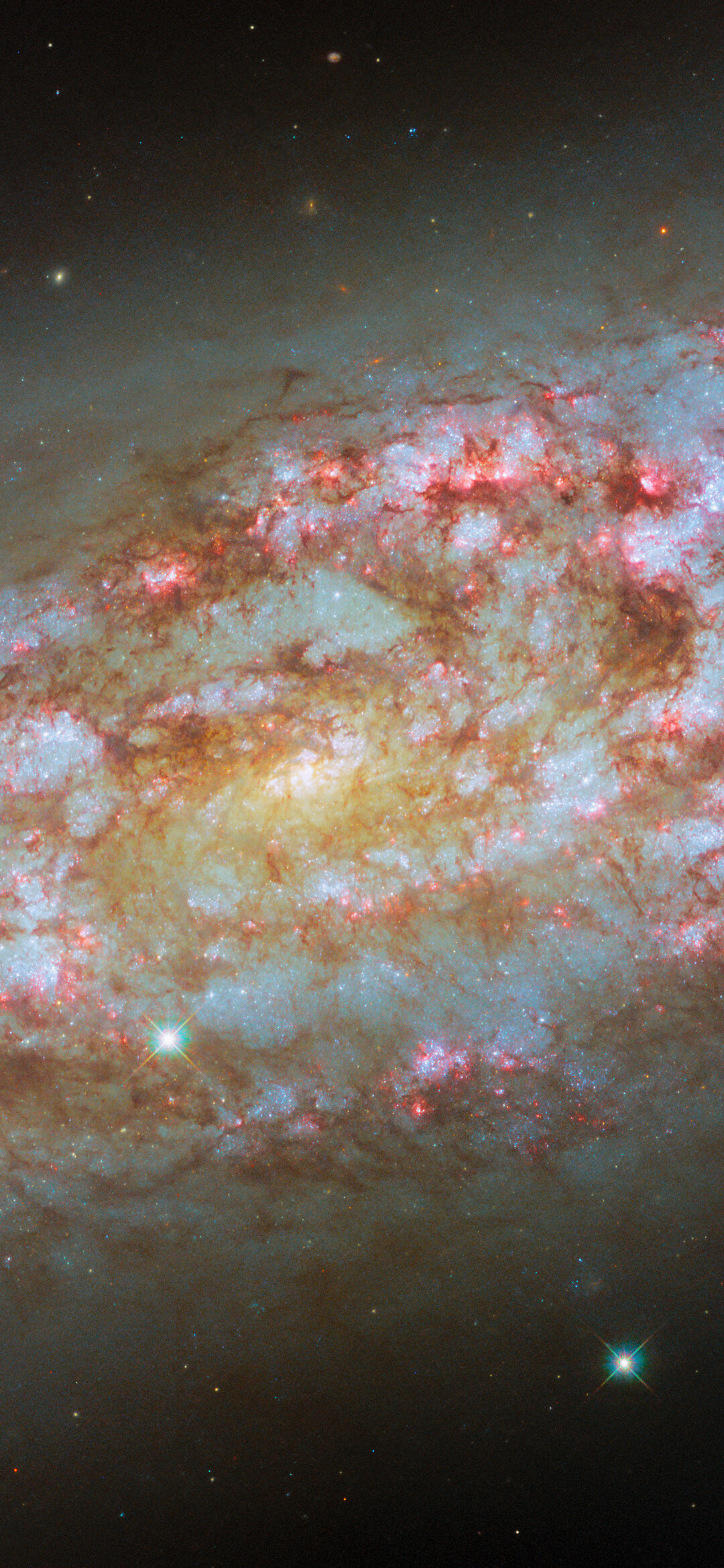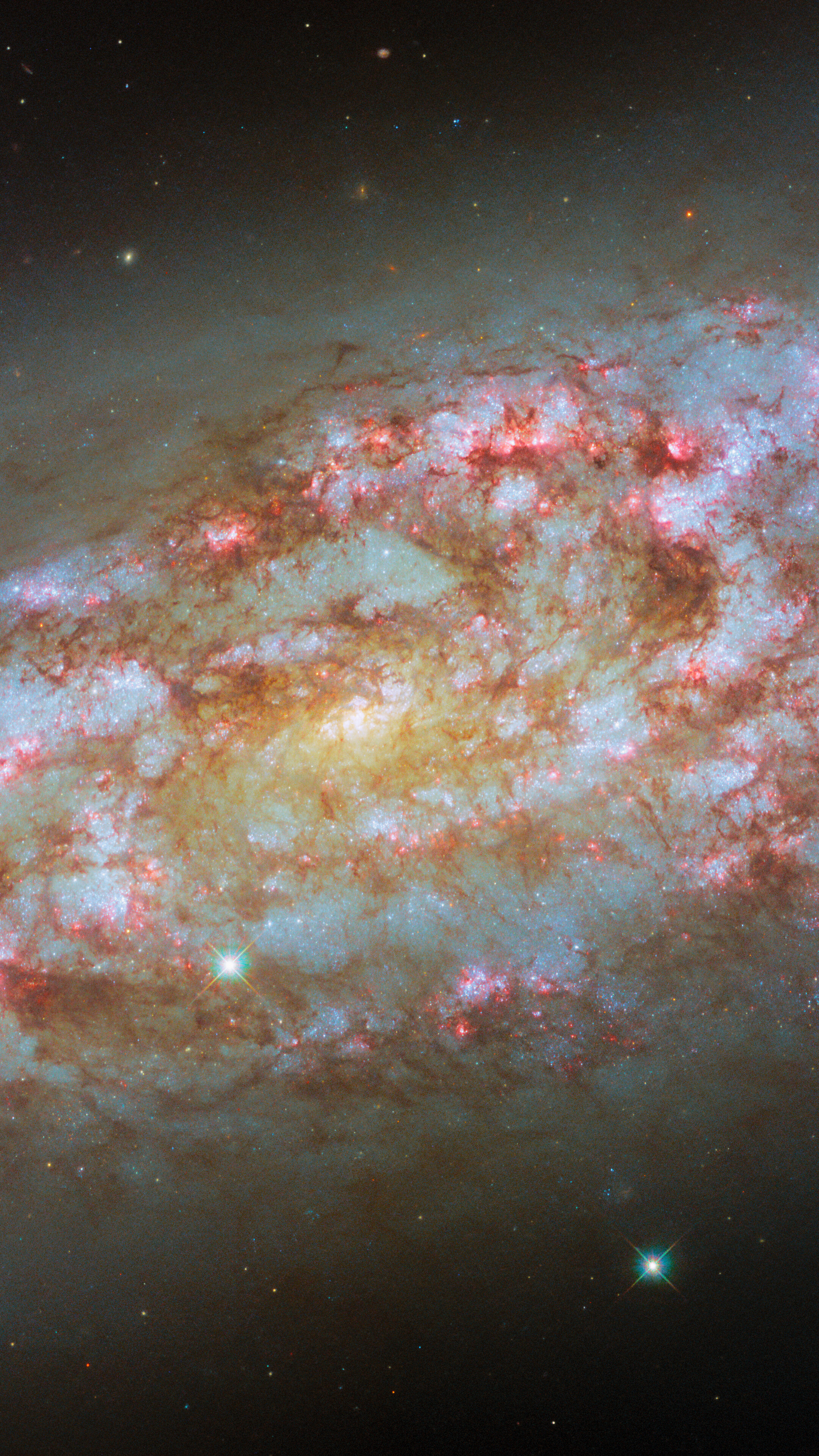 Hubble has shown off this galaxy before, in 2020. This week’s new image includes additional data collected throughout 2025, providing a deeper view of the tumultuous astrophysical activity taking place in the galaxy. Blossoming red lights in the arms mark out so-called H-alpha emission from dense clouds of hydrogen molecules. Stars form within these clouds and shine powerfully with ultraviolet radiation. They ionise the gas around them, causing the gas to emit a very particular red wavelength of light — a tell-tale sign of new stars.