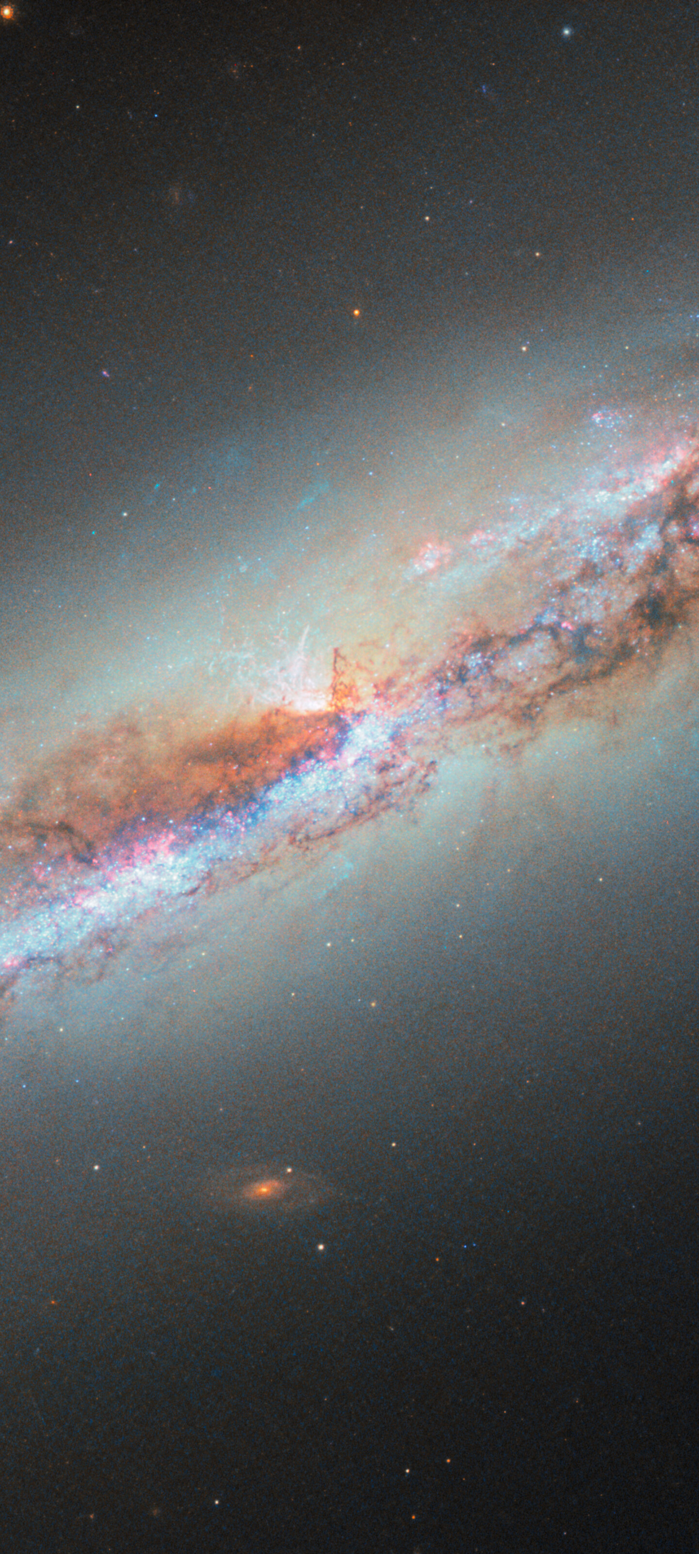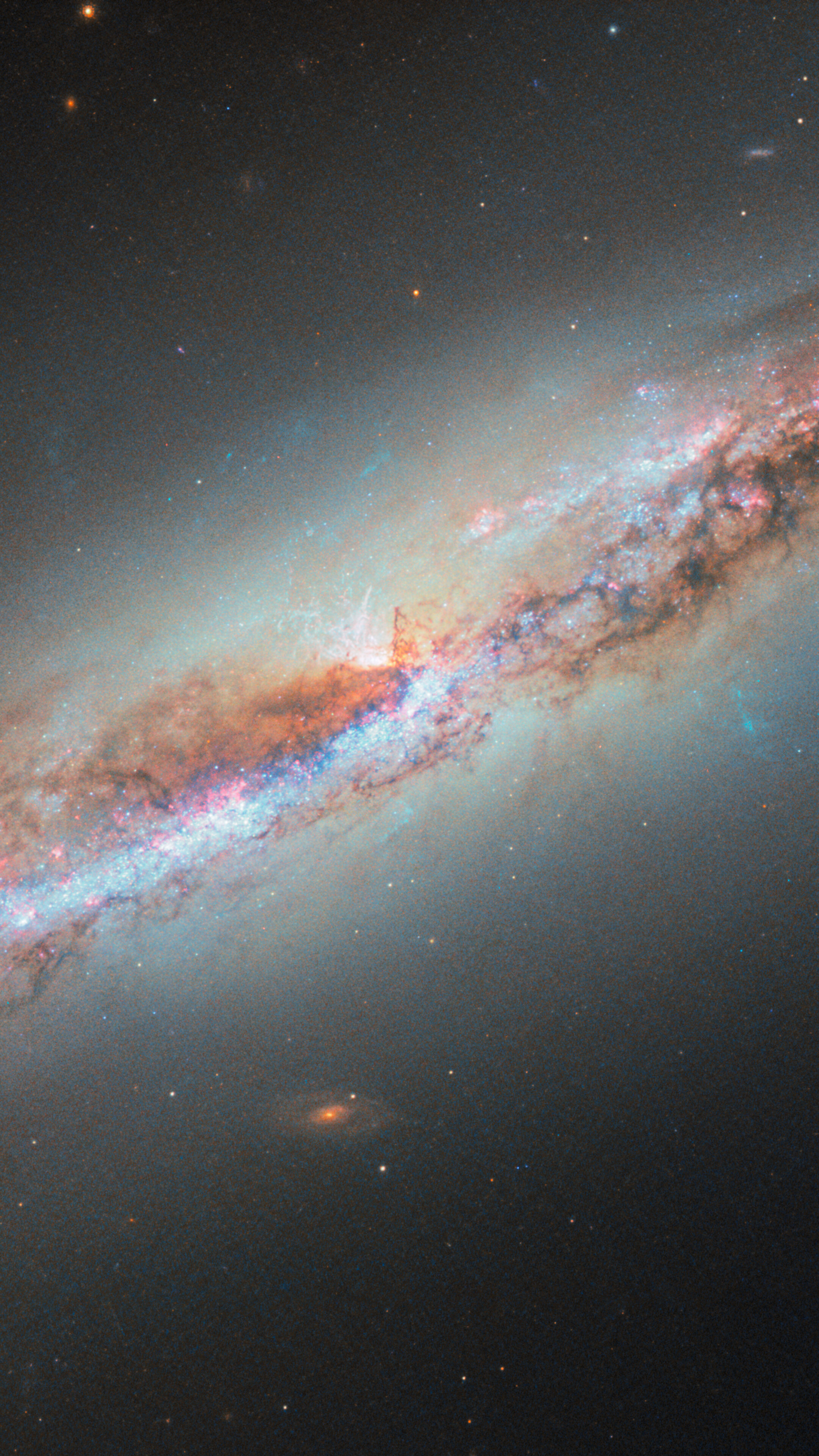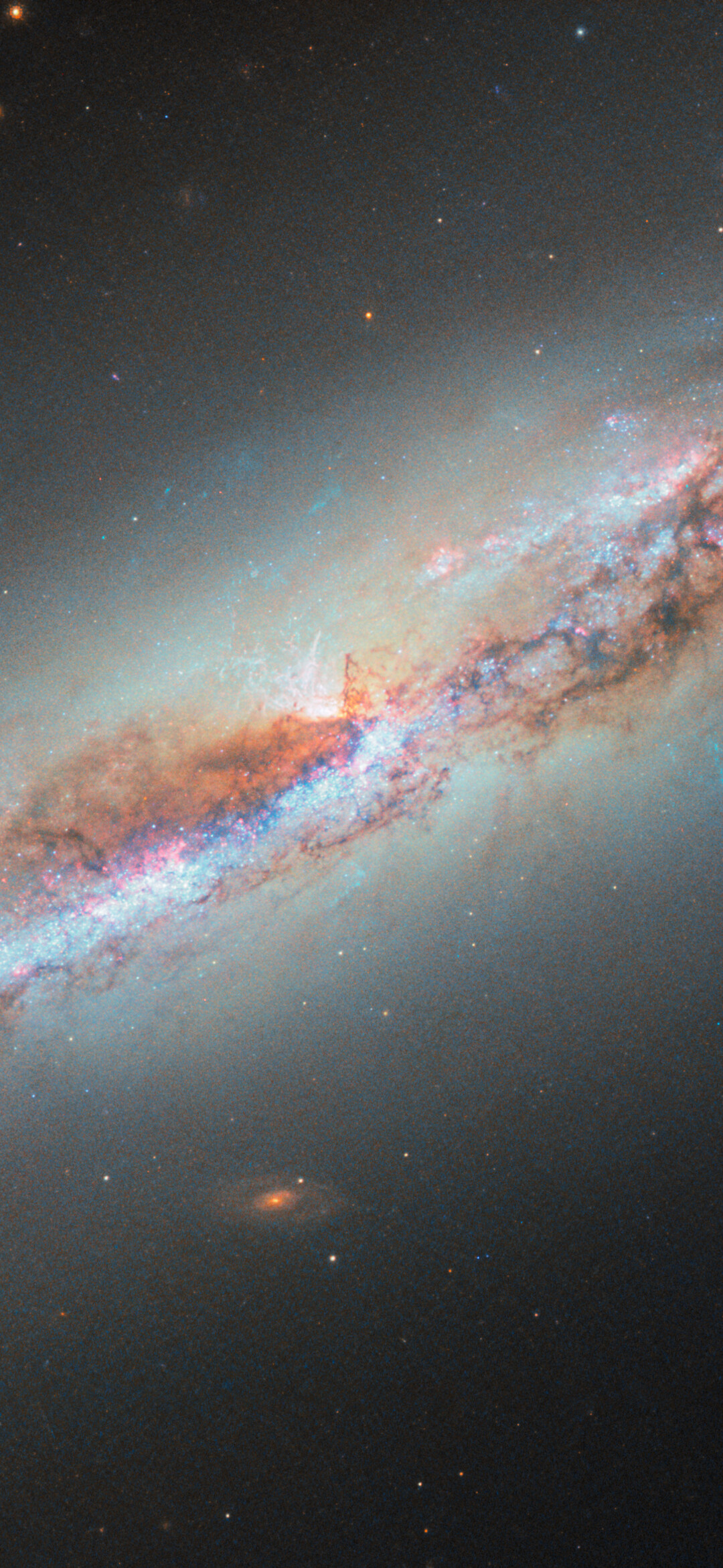 NGC 4388 is tilted at an extreme angle relative to our point of view, giving us a nearly edge-on vantage point. This perspective reveals a curious feature that wasn’t visible in a previous Hubble image of this galaxy released in 2016: a plume of gas from the galaxy’s nucleus, here seen billowing out from the galaxy’s disc towards the lower-right corner of the image. But where did this outflow come from, and why does it glow?