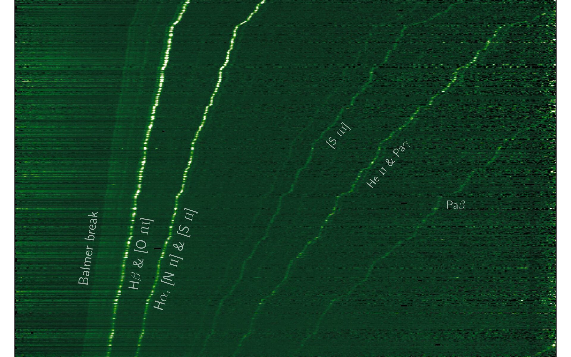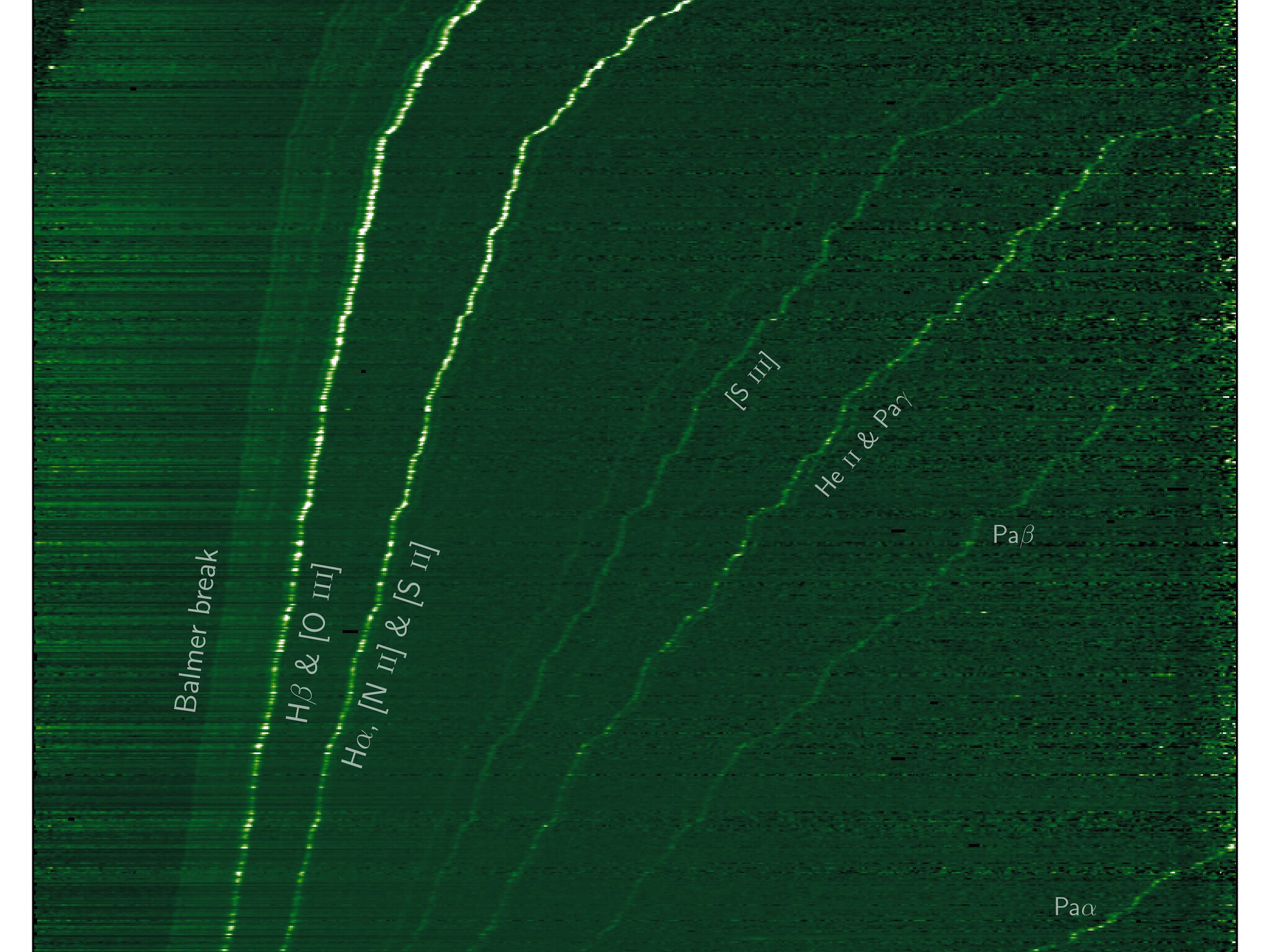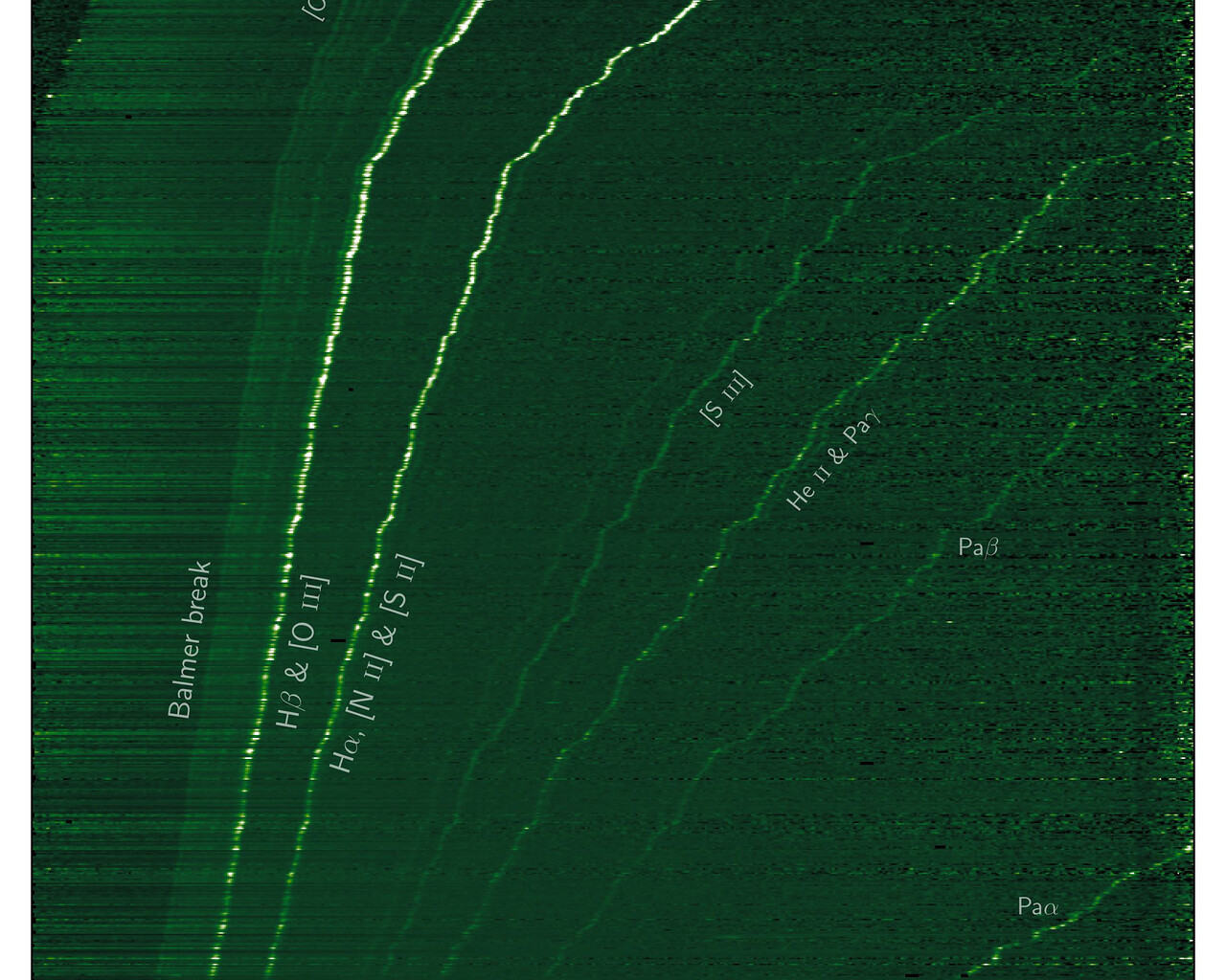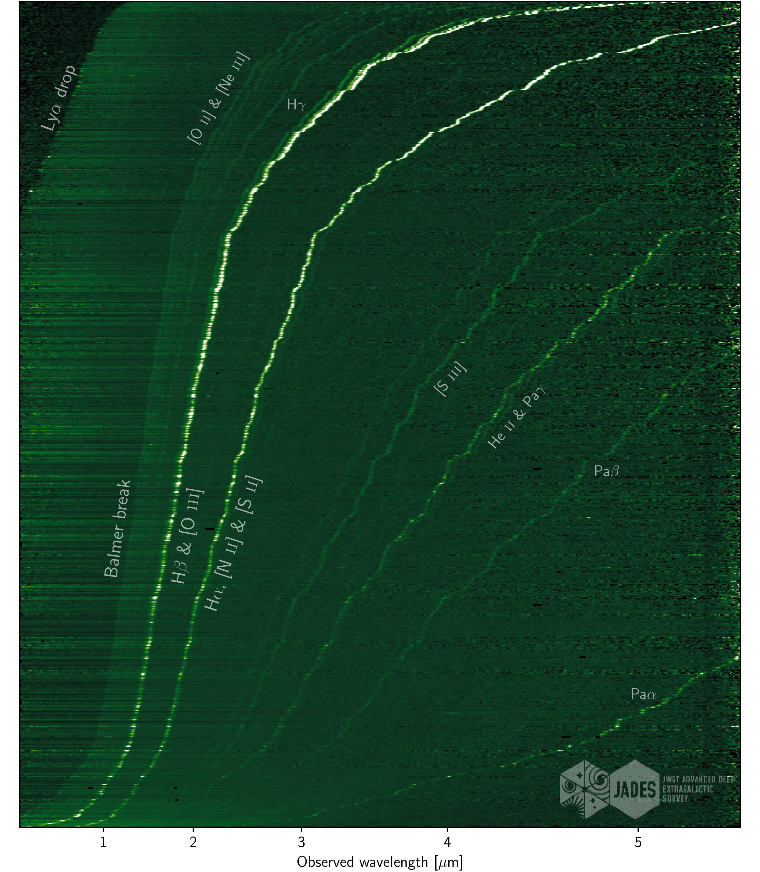 A selection of high-quality emission-line spectra from the latest JADES Data Release, sorted by redshift. Numerous emission line and continuum features are clearly visible, showcasing the richness of the dataset (from Curtis-Lake et al. 2025, in press).